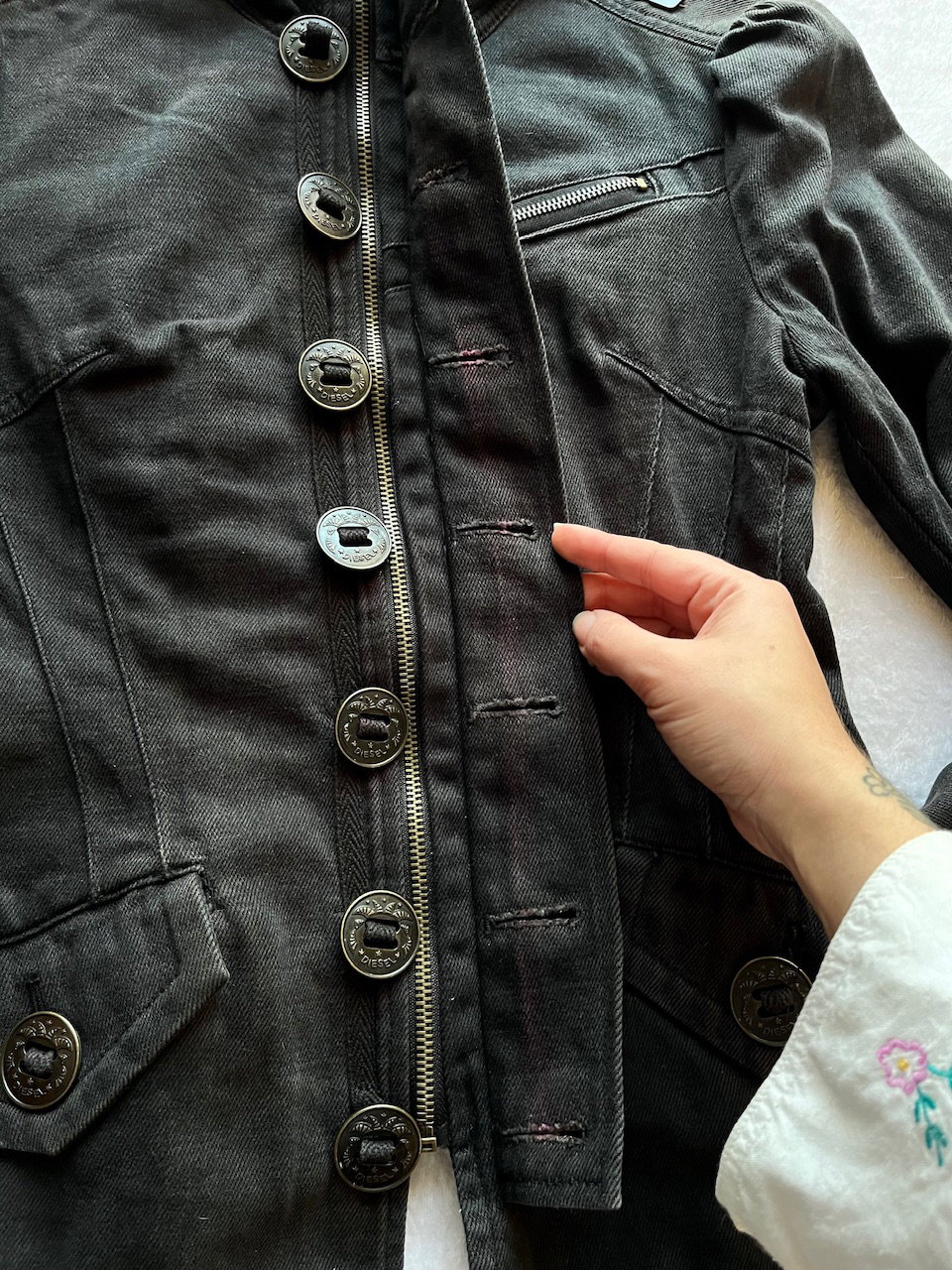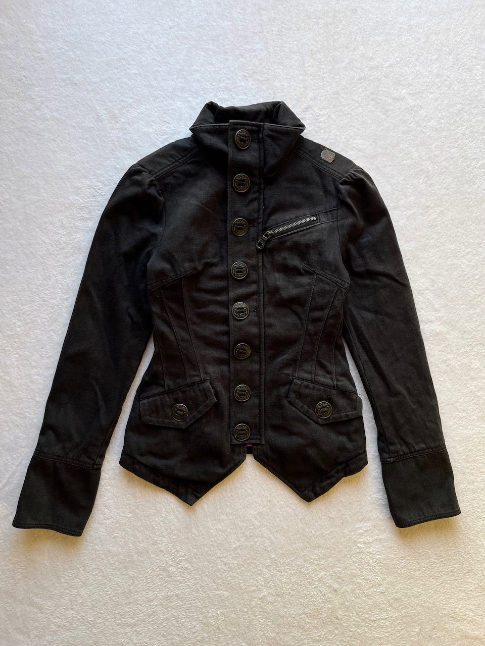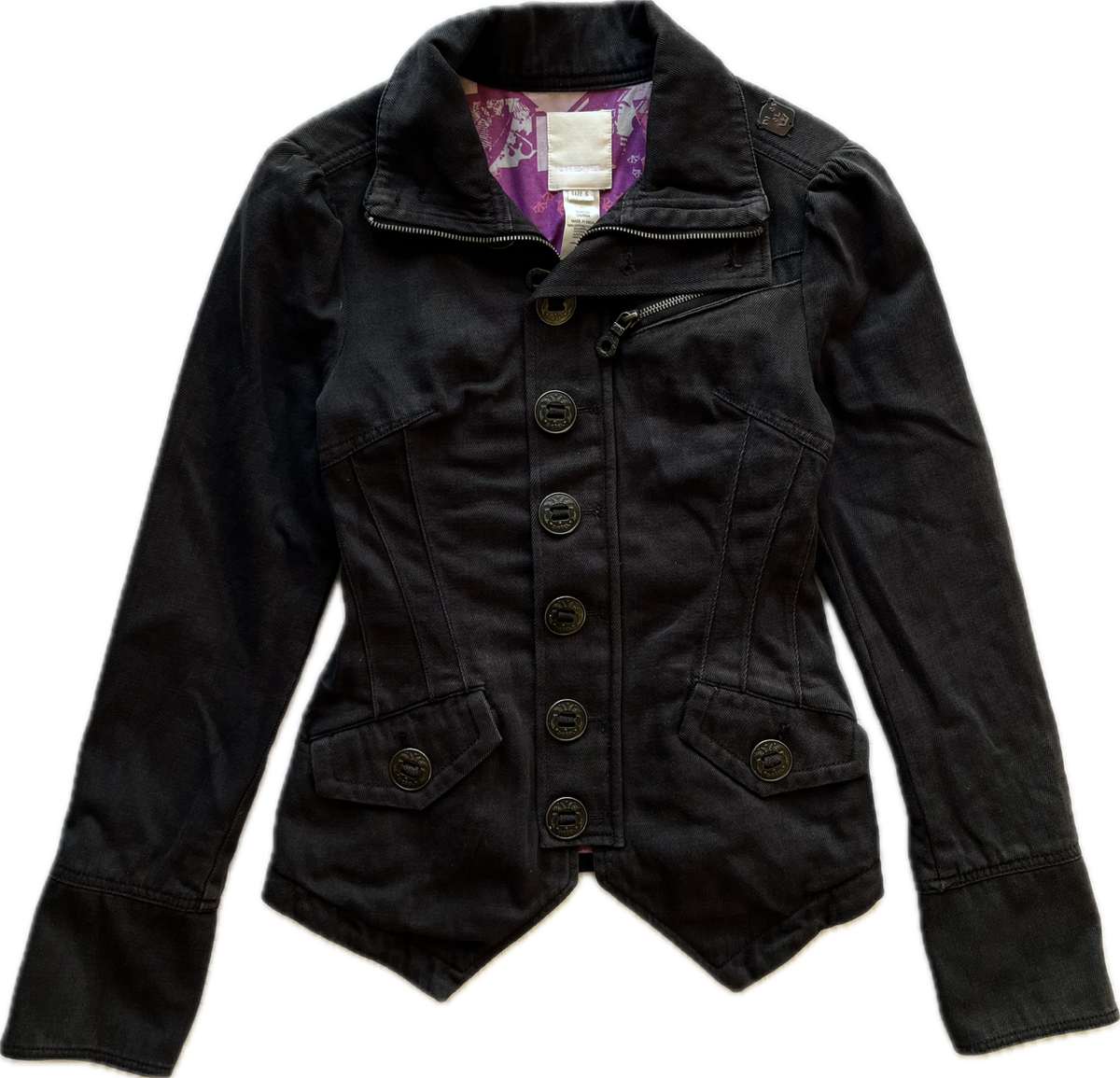 jacket marca diesel original. se trata de una prenda "comprada" fuera, no se comercializo este modelo en argentina. es vintage de inicios de los 00s cuenta con botones y cierre, puede usarse con cuello estilo camisero o cerrado. es entallada, marcando la cintura. las mangas tienen fruncidito estilo princesa y luego van entalladas siendo suepr manga largas. talle s. ver unicos detalles del uso en fotos. 100% algodon