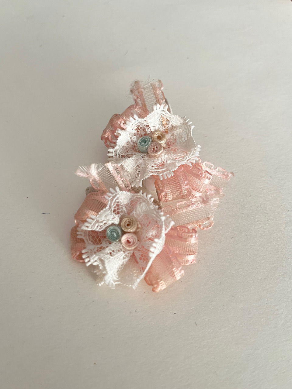 con rosas rococo en colores pasteles, encaje y raso. el elástico se puede cambiar, para que lo uses cuantos veces quieras