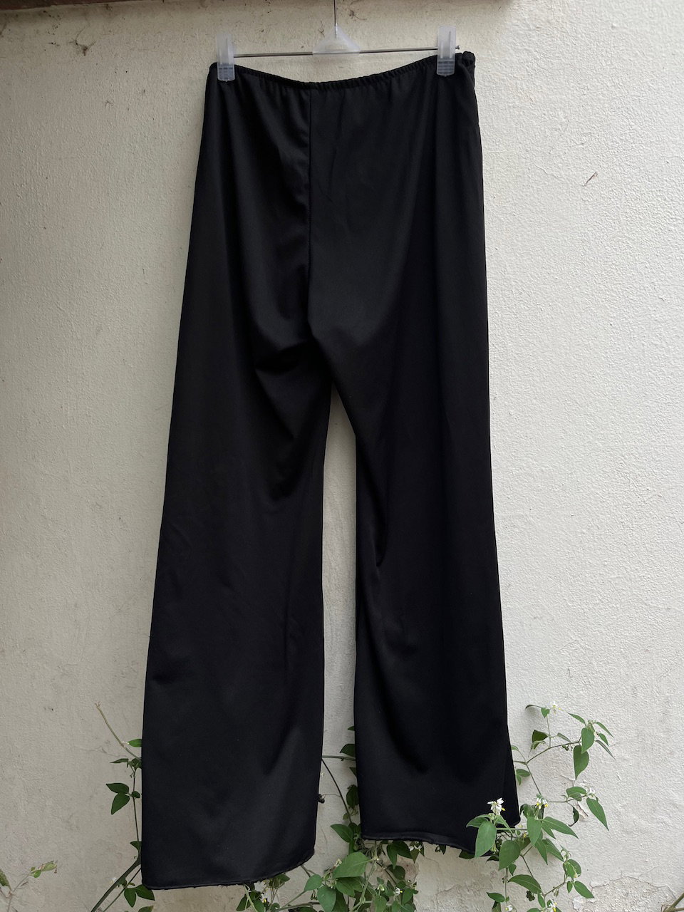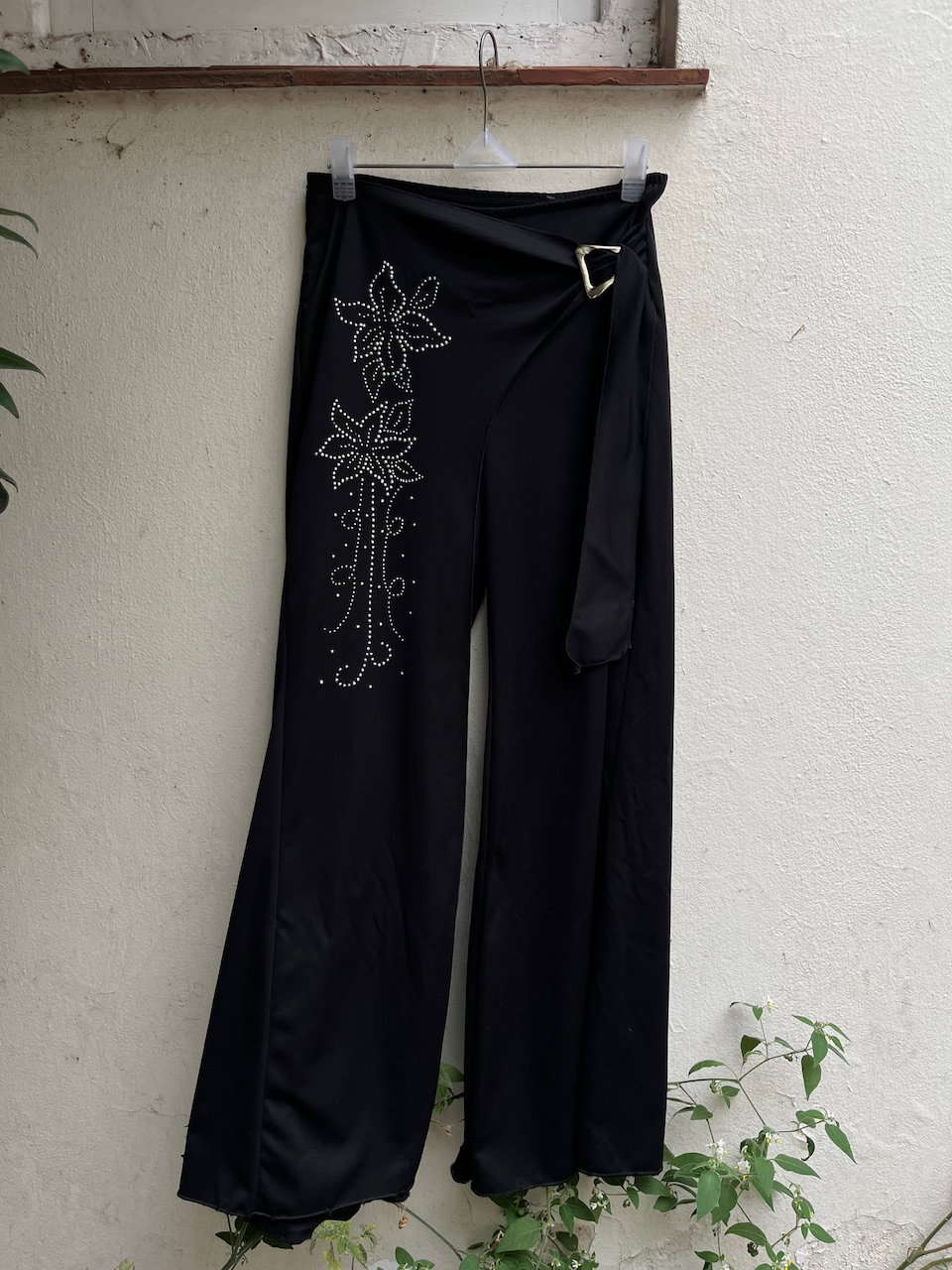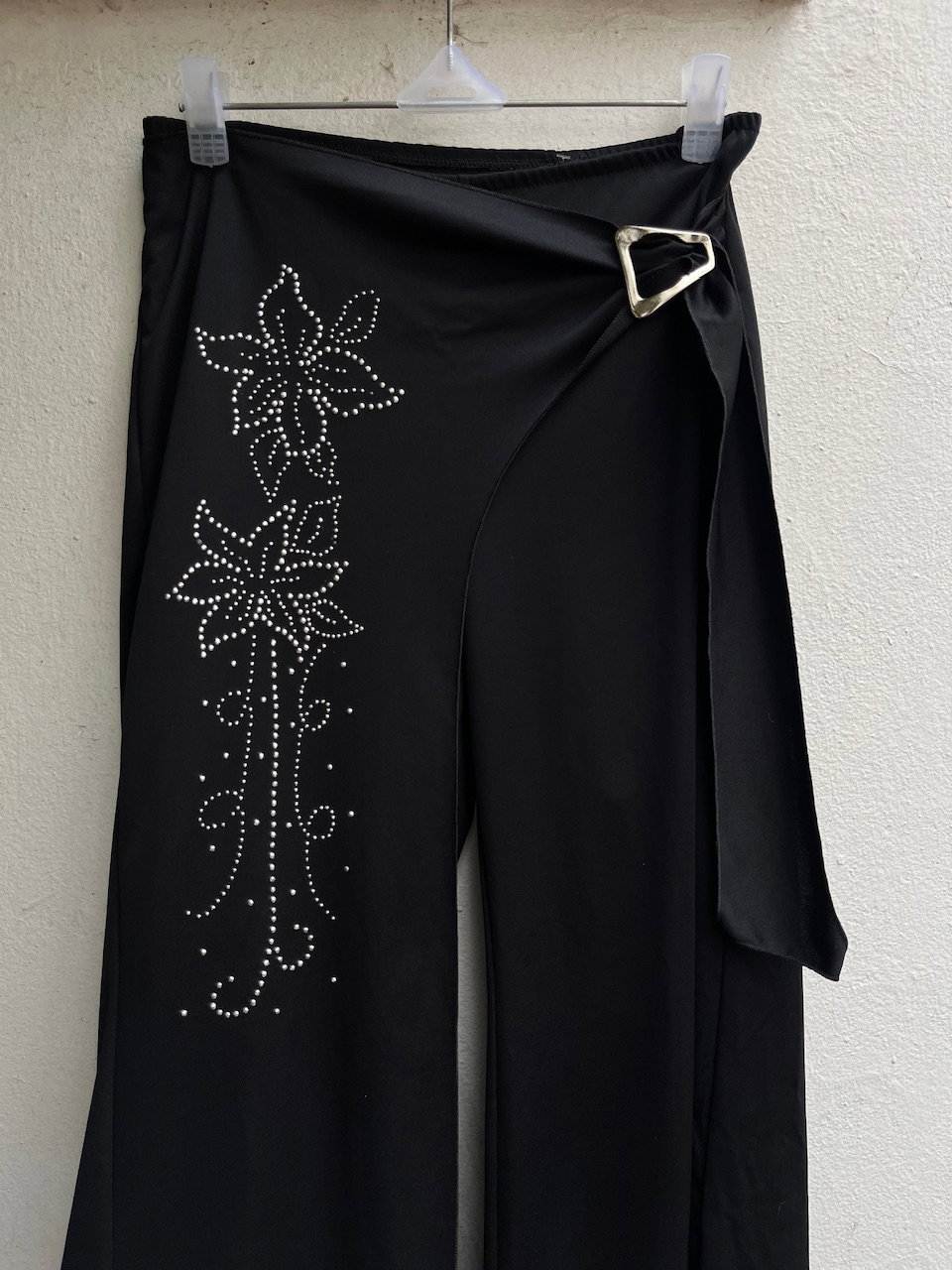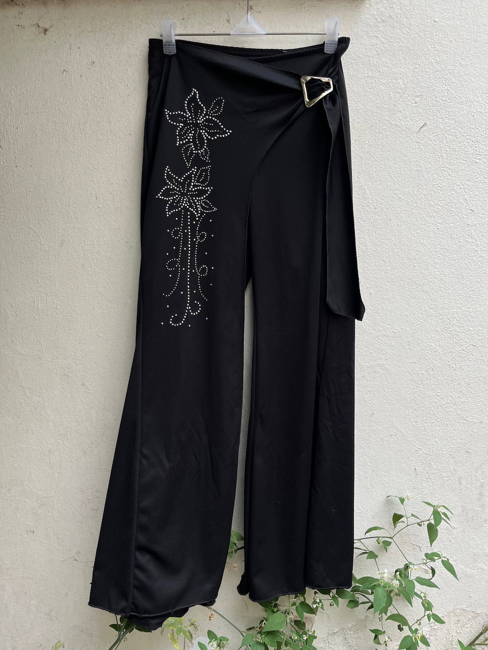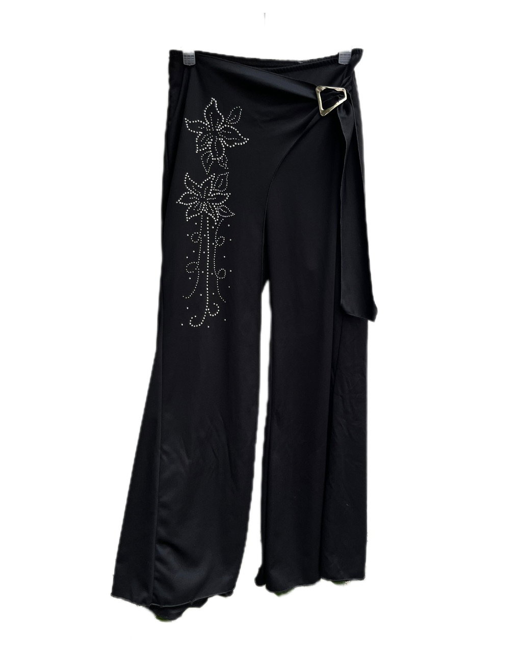 pantalon ancho estilo palazzo. tiene un hermoso calce gracias a la sobre falda del frente que se ajusta con la hebilla y da la ilusion de ser una pollera pantalon. es super ancho y tiro alto, pero puede usarse tiro medio/bajo en un talle 38/40. en impecable estado de conservacion. es de lycra