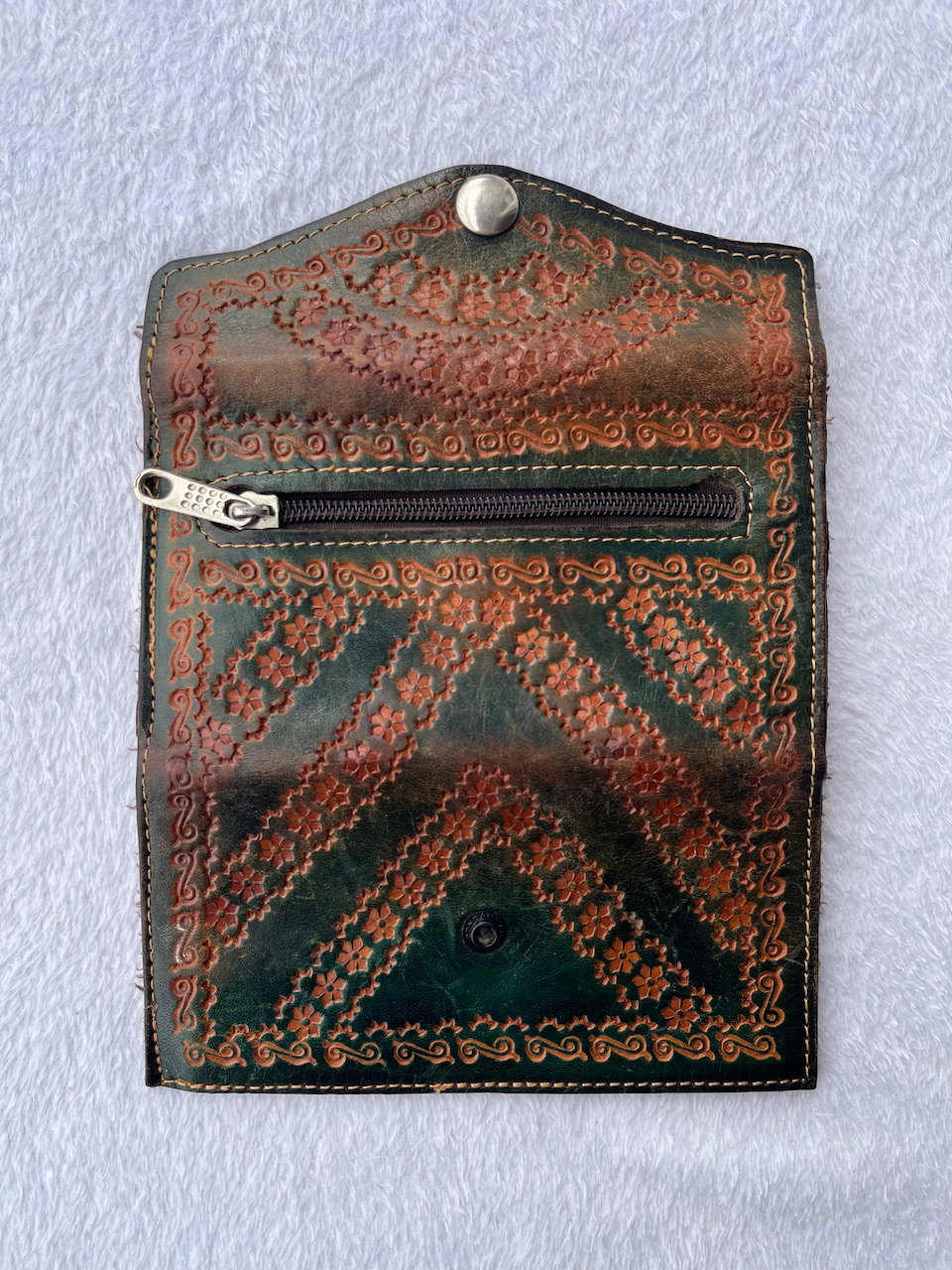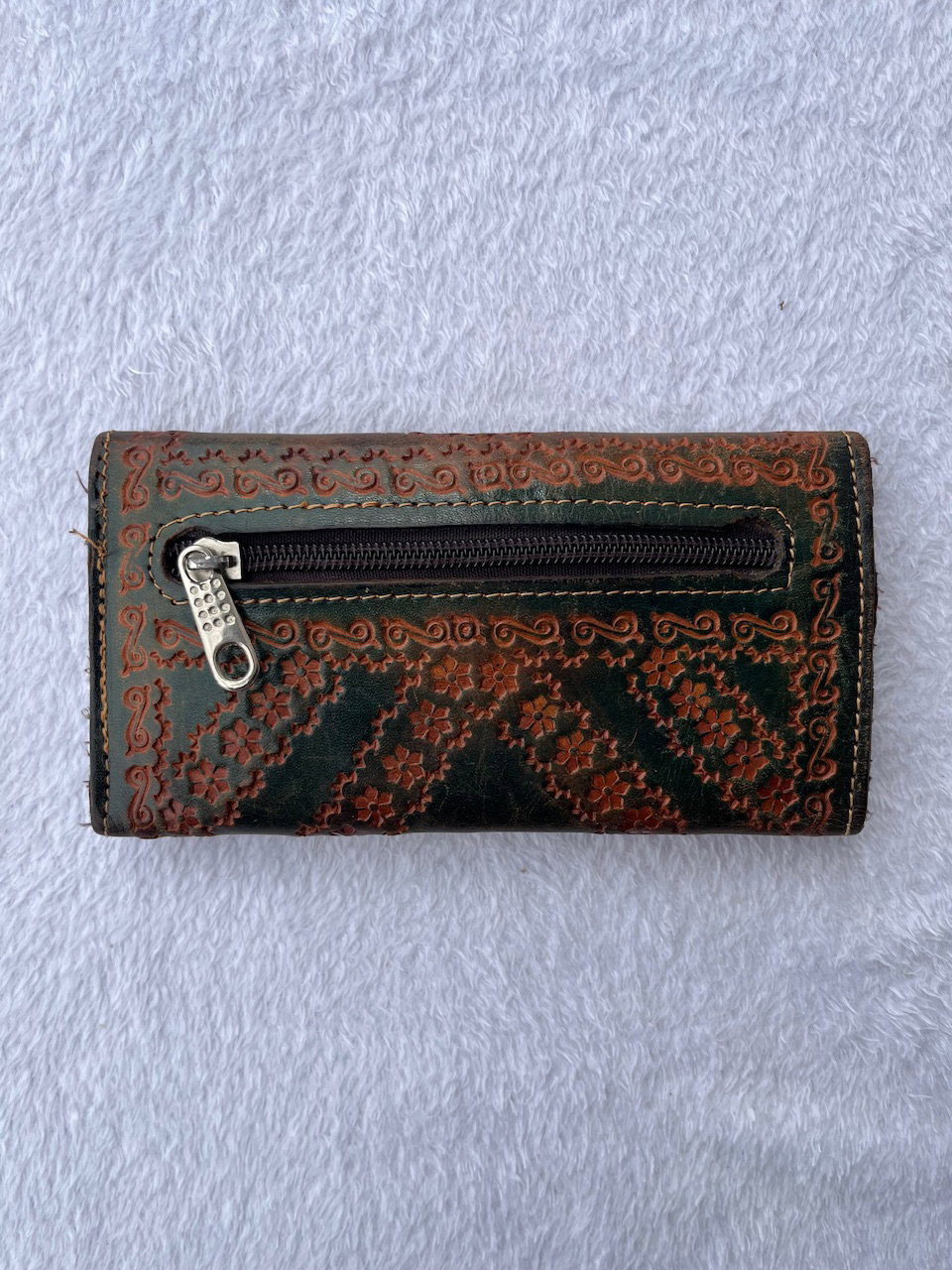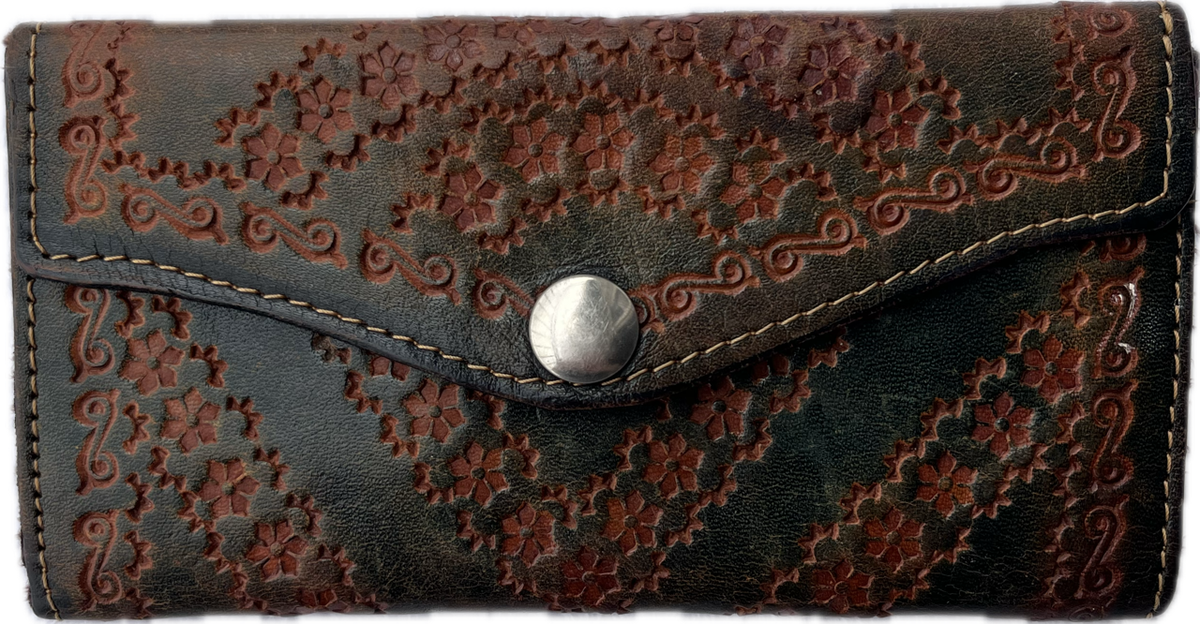 billetera de cuero labrado a mano. es preciosa y súper espaciosa. es original de los 90s tiene 17x9cm