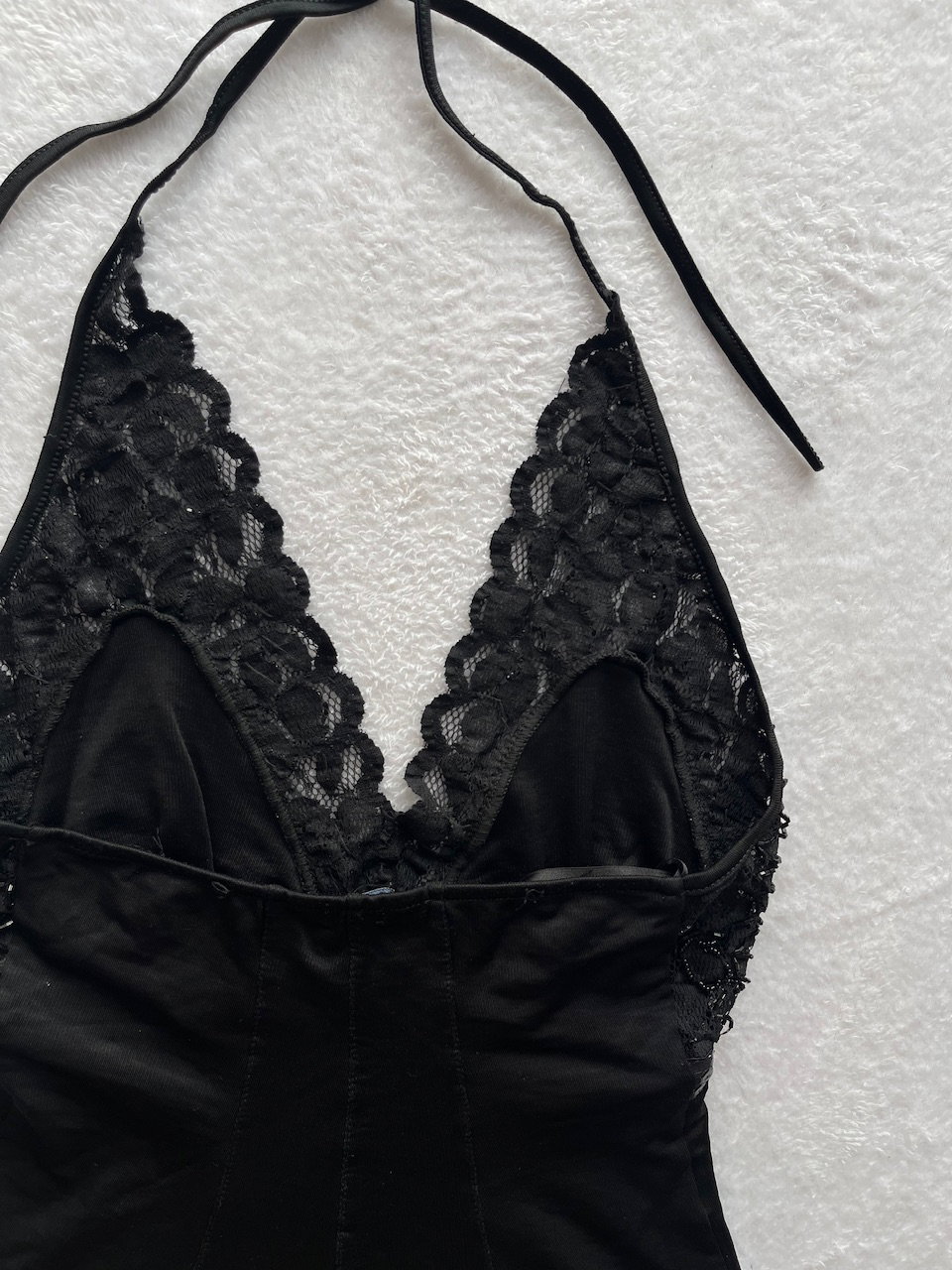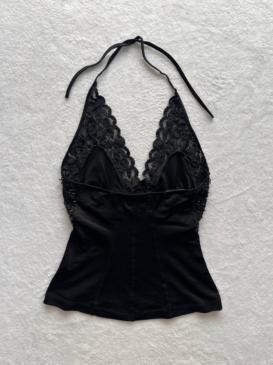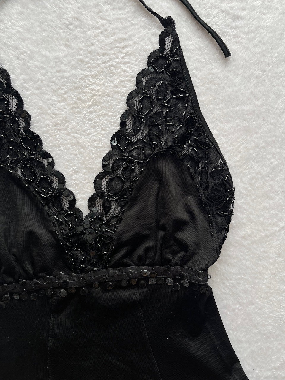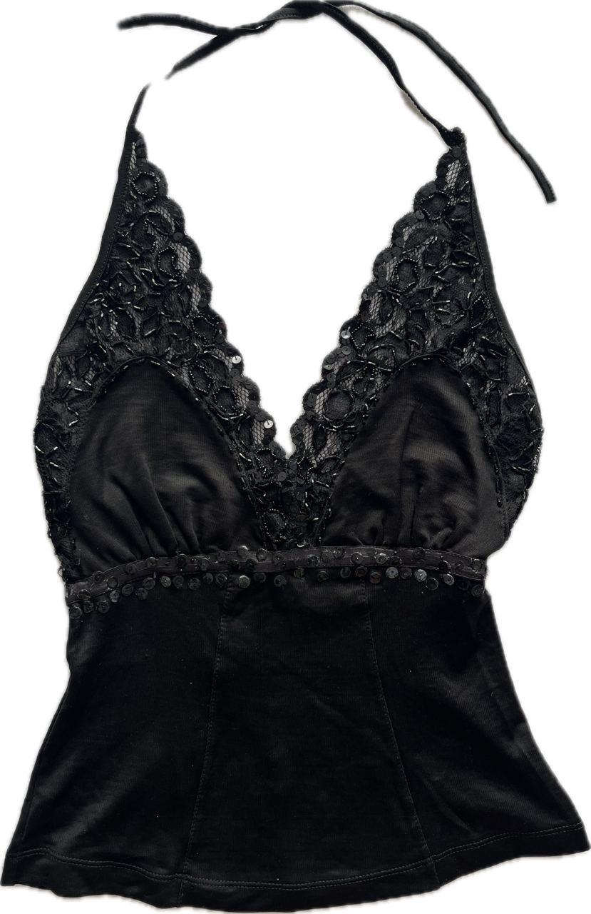 top súper hermoso con encaje, mostacillas y lentejuelas. es al cuerpo, se ata en el cuello y tiene espalda descubierta