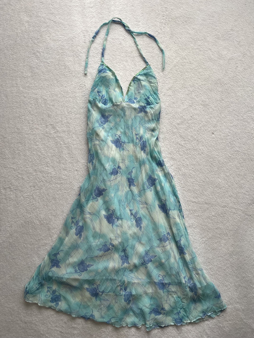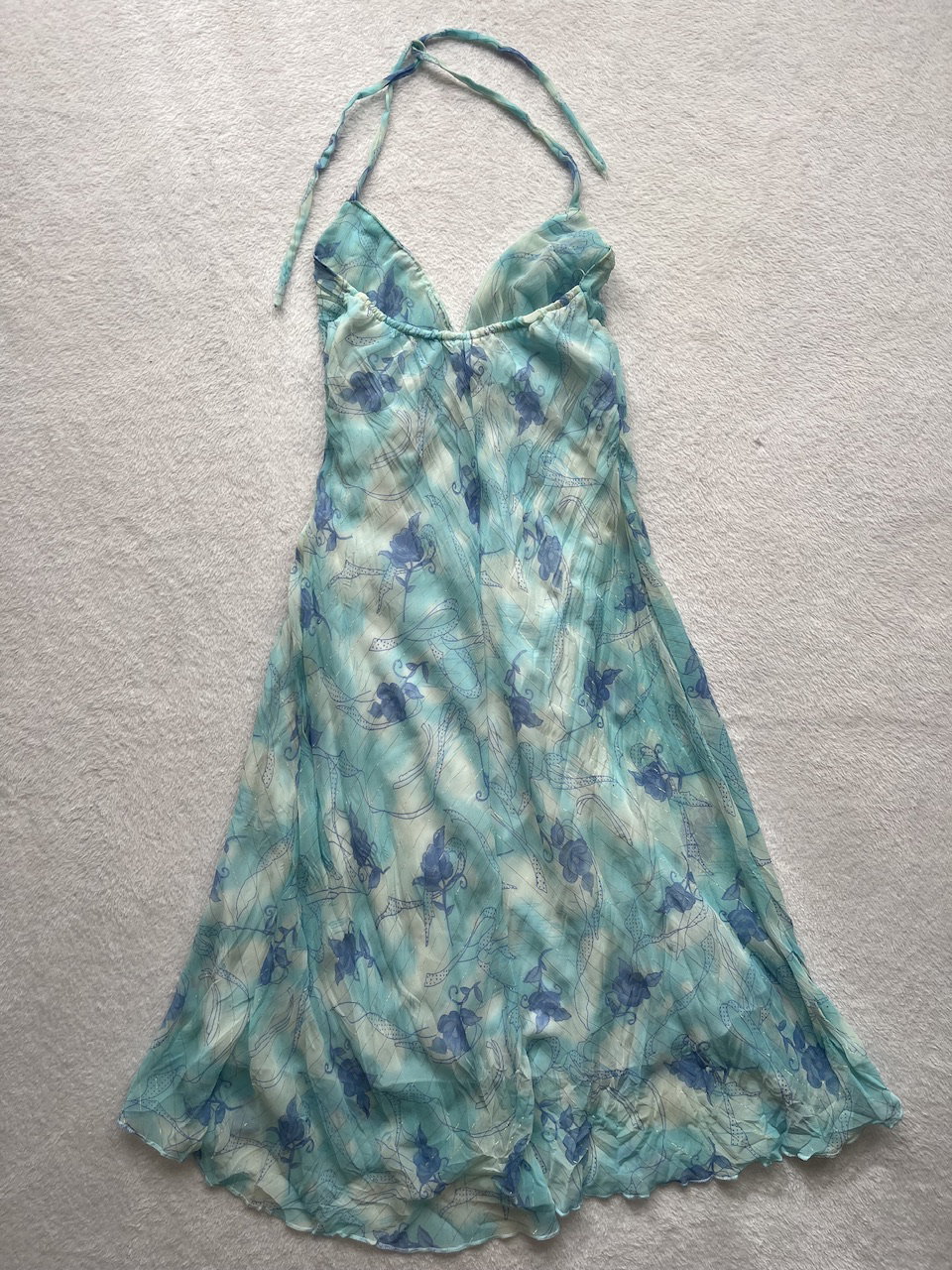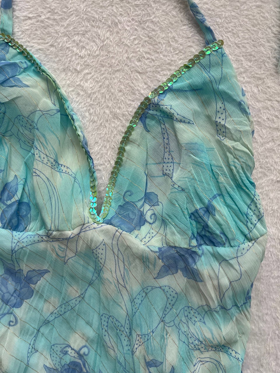 vestido de gasa estampada con detalles de lurex dorado y lentejuelas en el busto. es original d los 2000s Se ajusta en el cuello a gusto y cuenta con espalda elástizada. talle s aprox. se encuentra como nuevo, está forrado