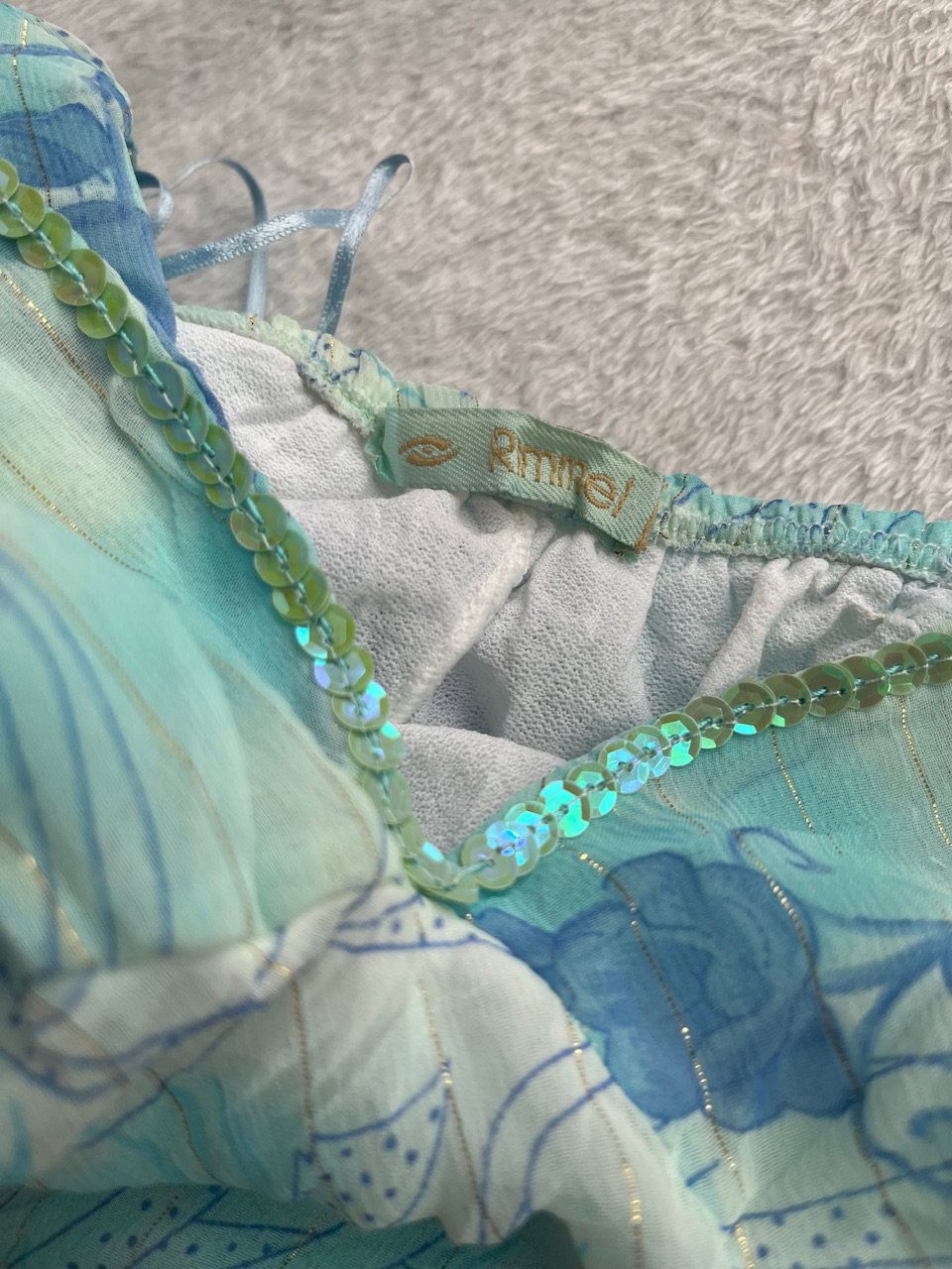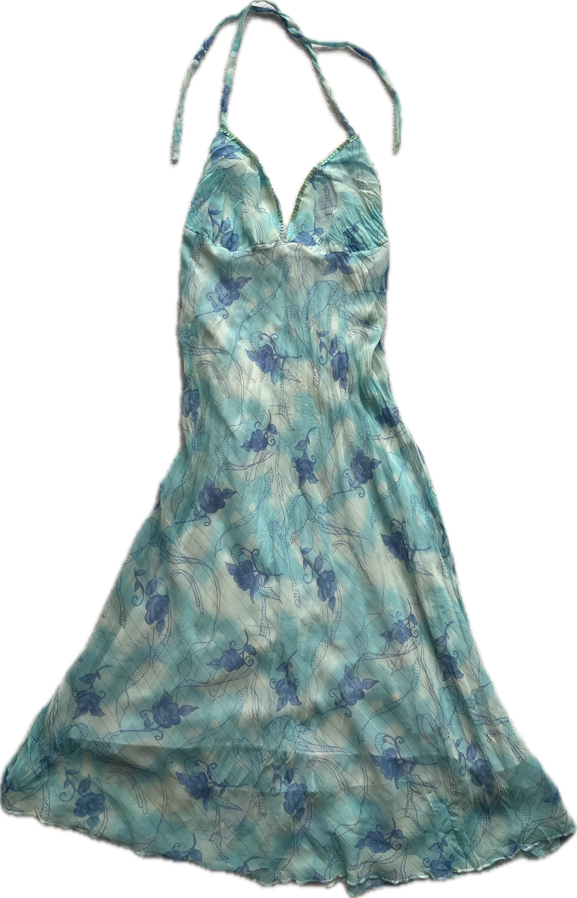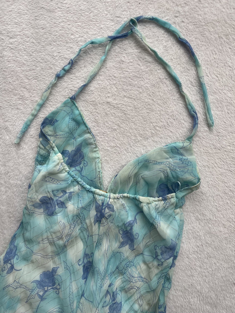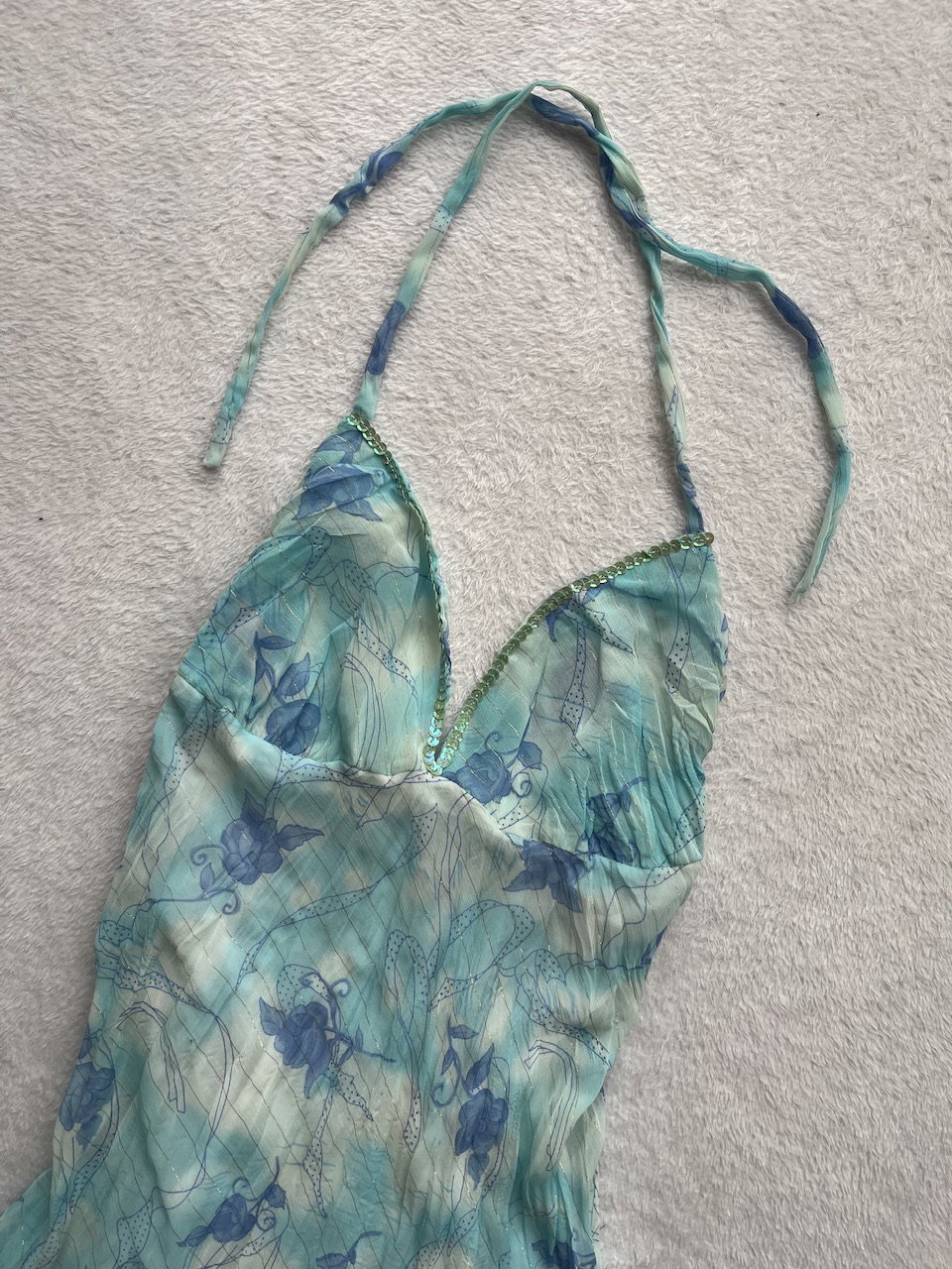 vestido de gasa estampada con detalles de lurex dorado y lentejuelas en el busto. es original d los 2000s Se ajusta en el cuello a gusto y cuenta con espalda elástizada. talle s aprox. se encuentra como nuevo, está forrado