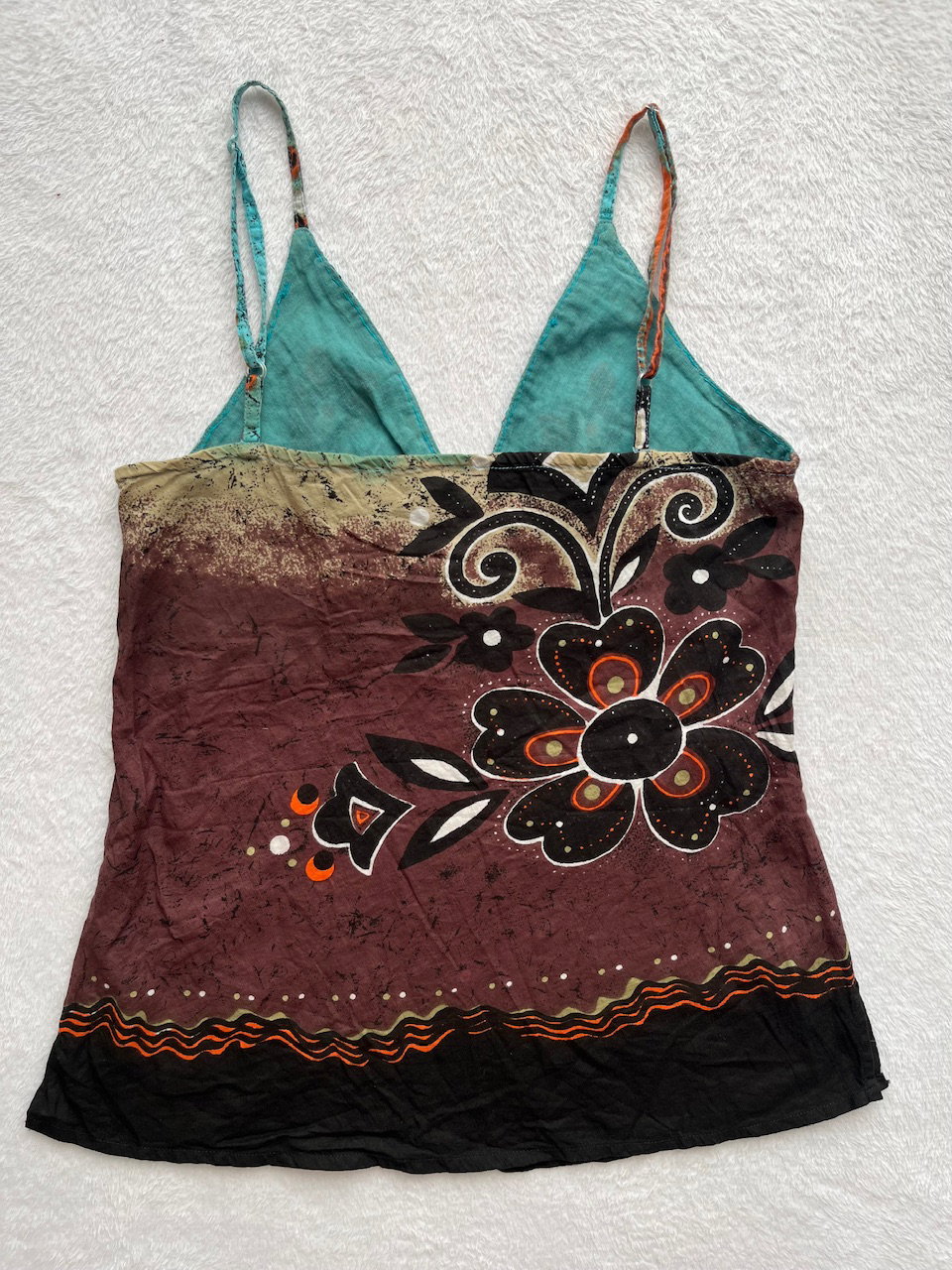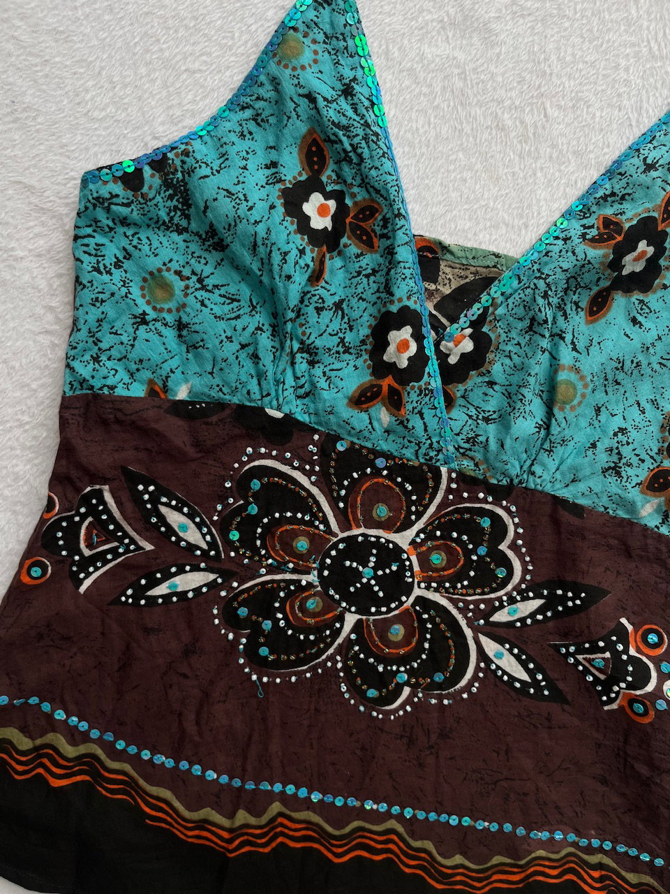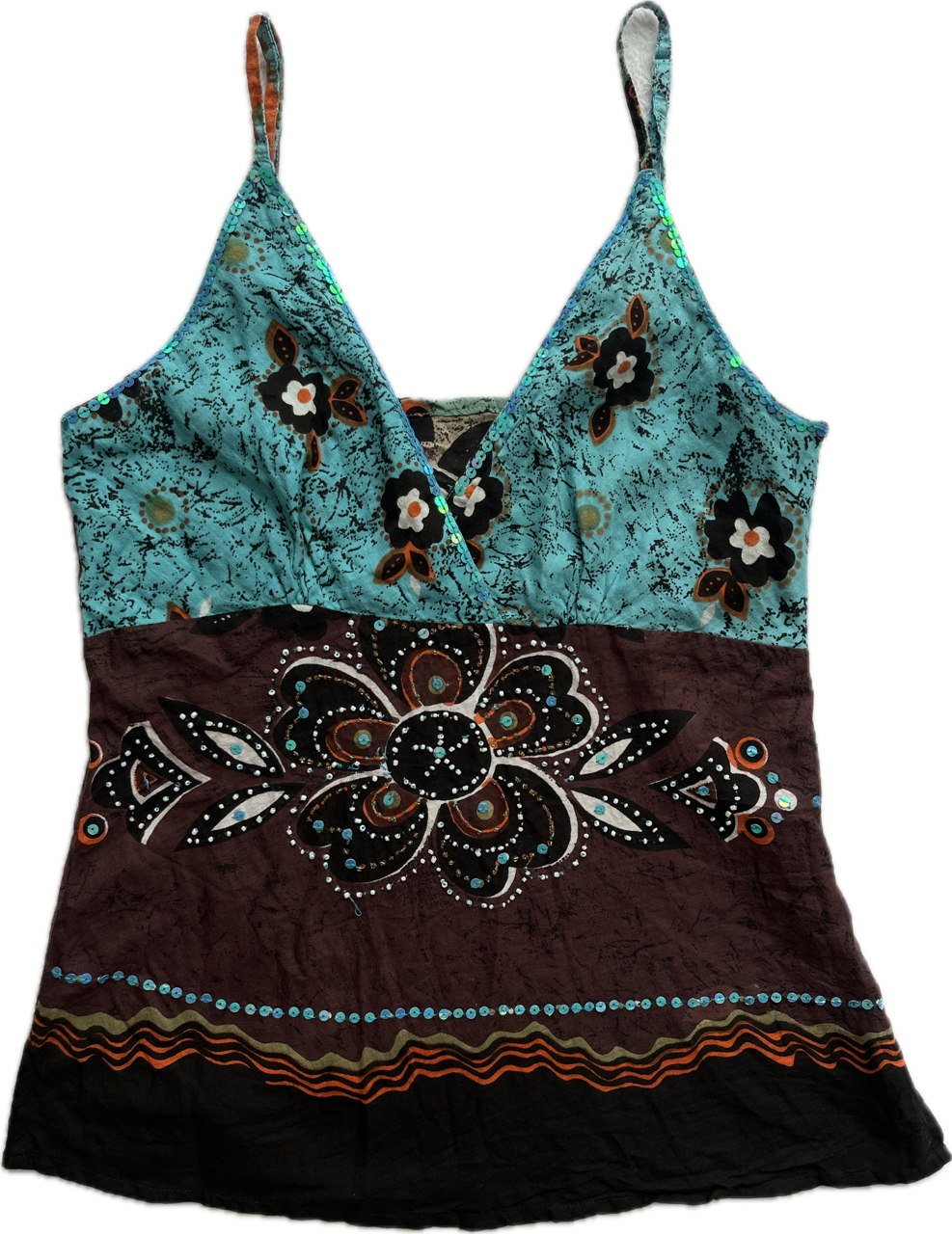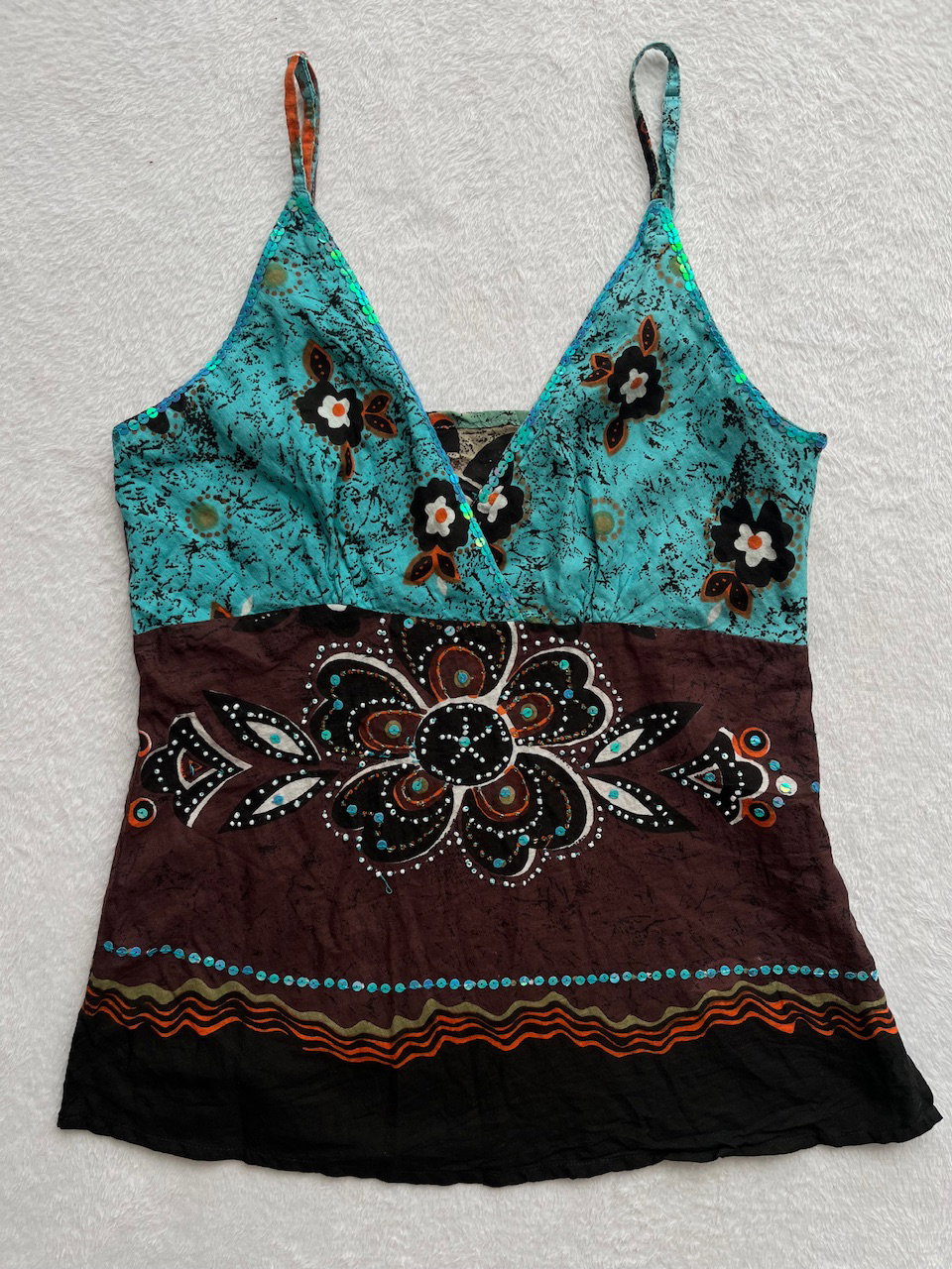 hermoso top de algodón estampado con mostacillas y lentejuelas bordadas a mano. breteles regulables. como nueva. original de los 00s. talle s