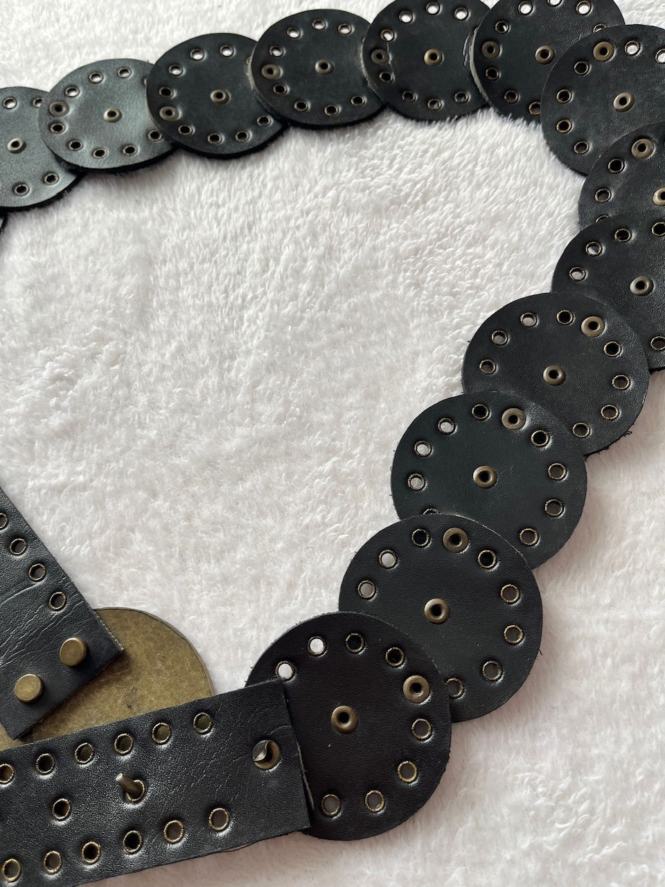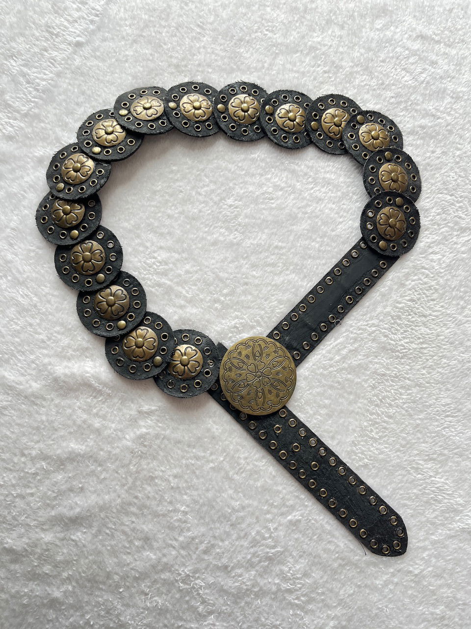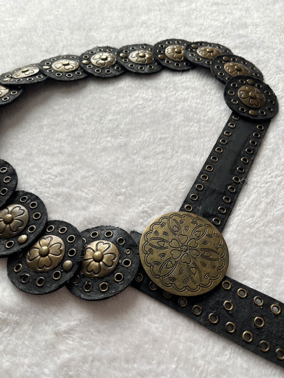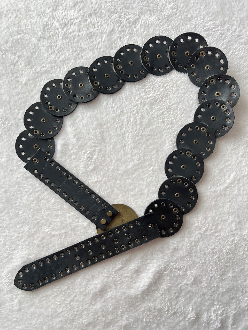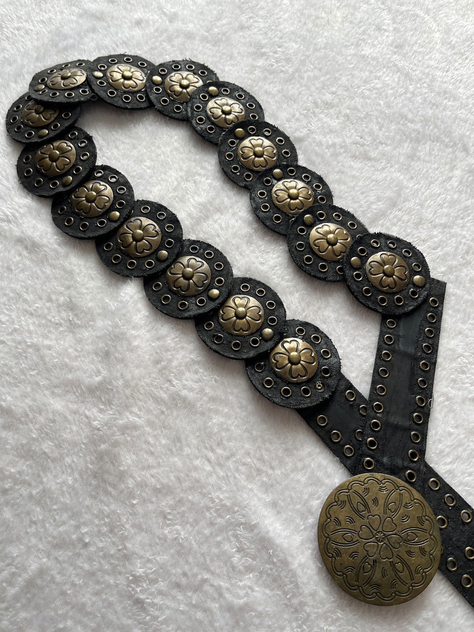 cinto estilo faja recuperado y pintado a mano, con hebilla metálica. del lado interno es de cuerina