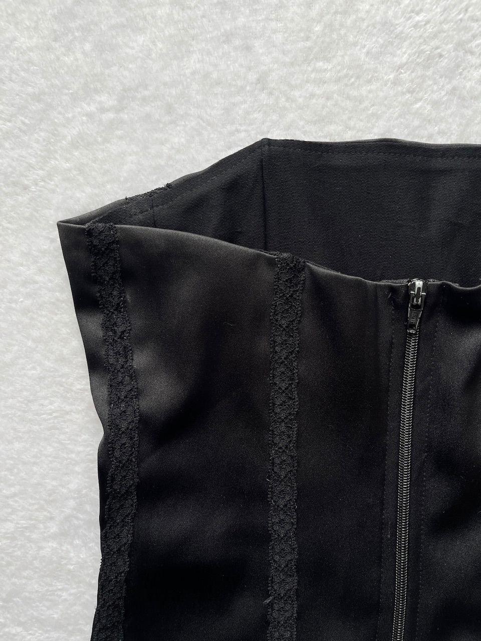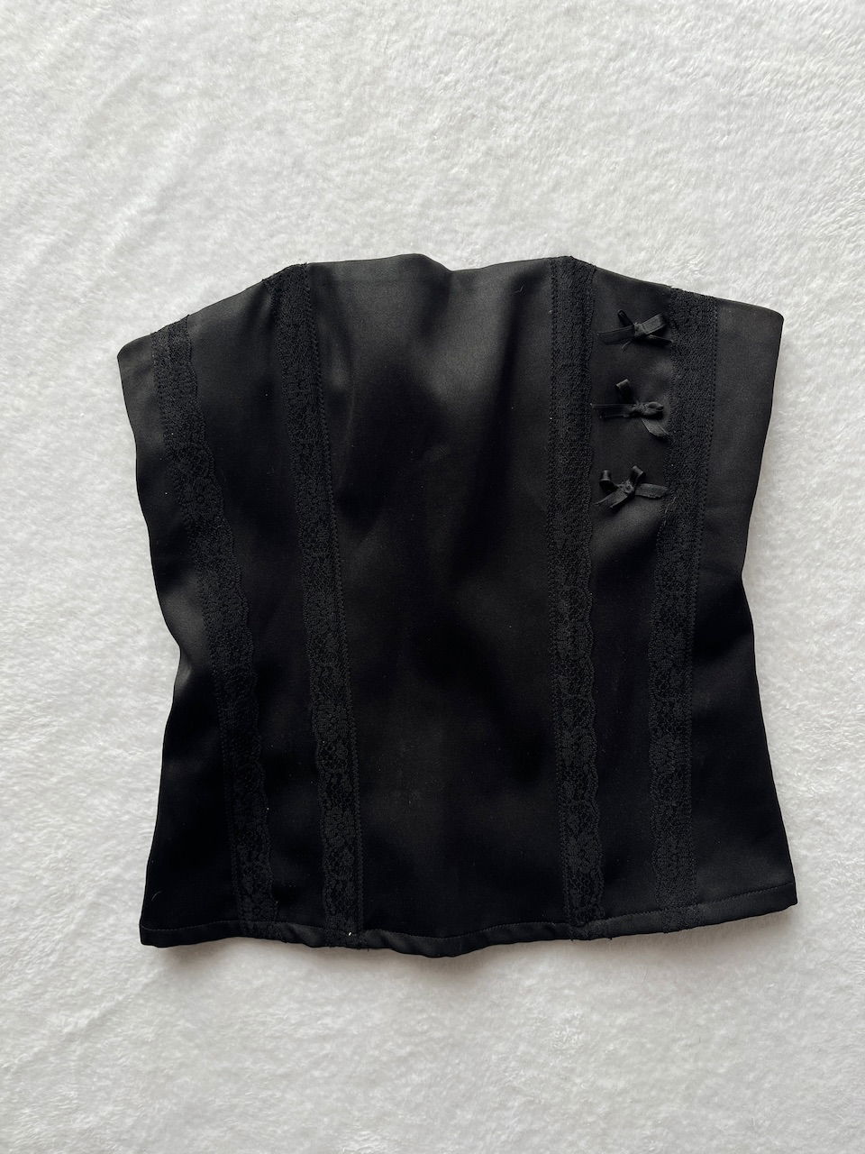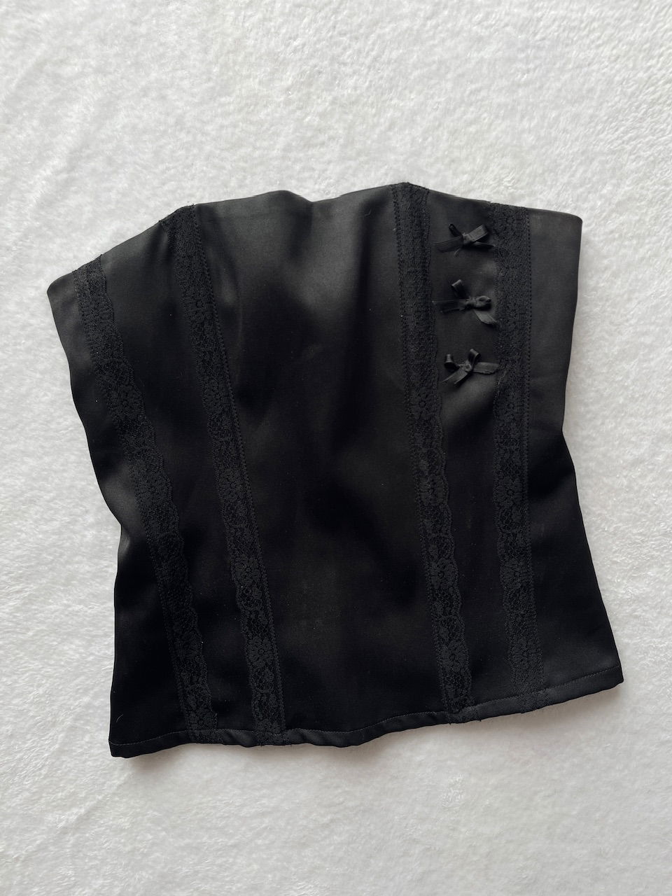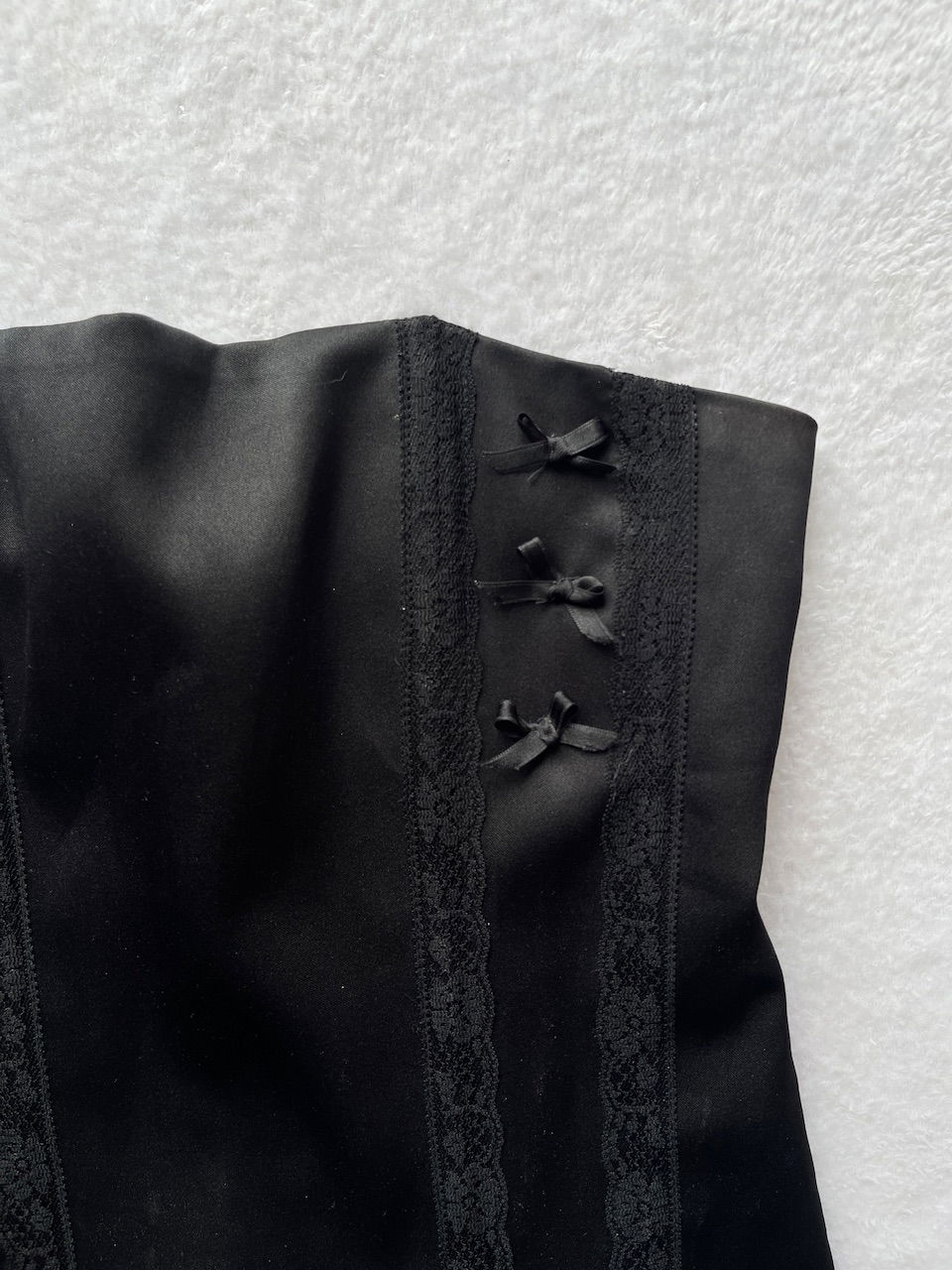 de tela tipo raso con detalles de encaje y moñitos tiene varillas