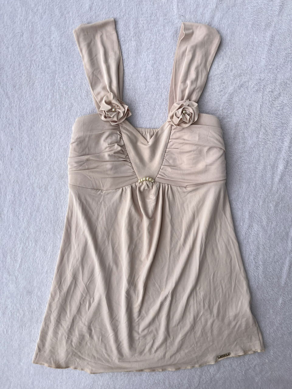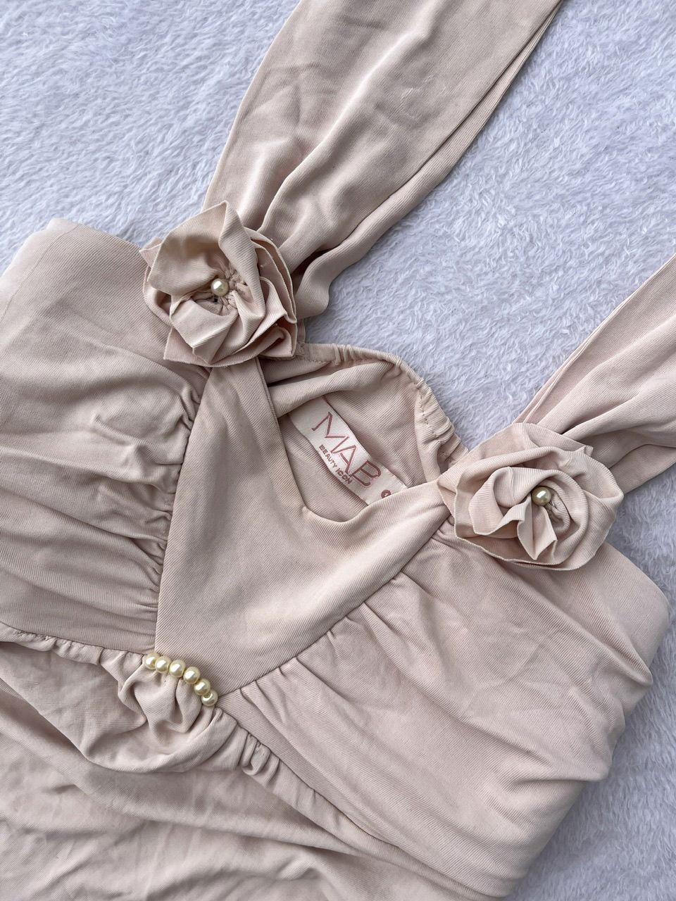 - de seda fría, con detalles de flores y perlas cosidas a mano
