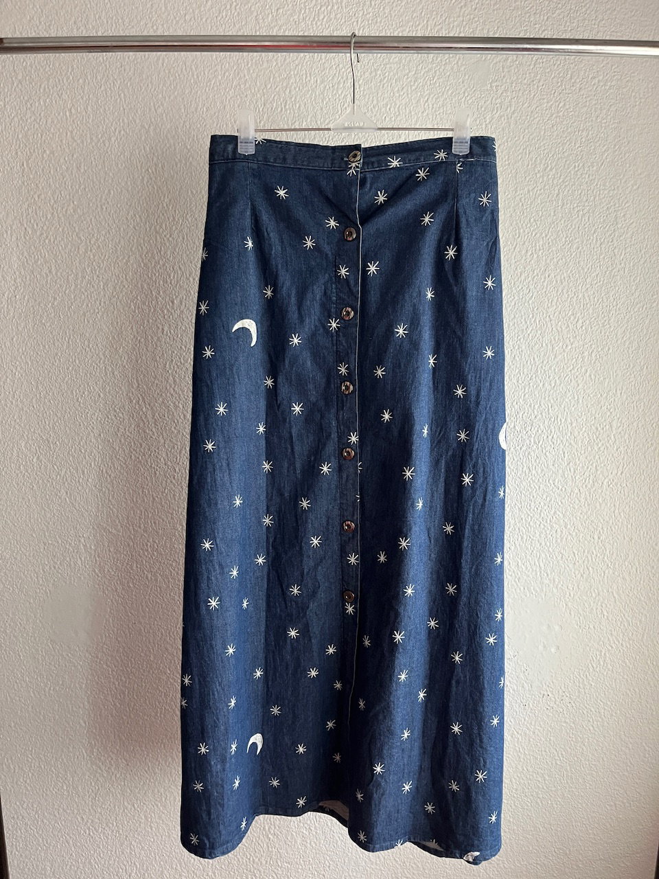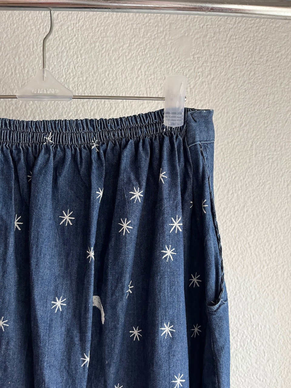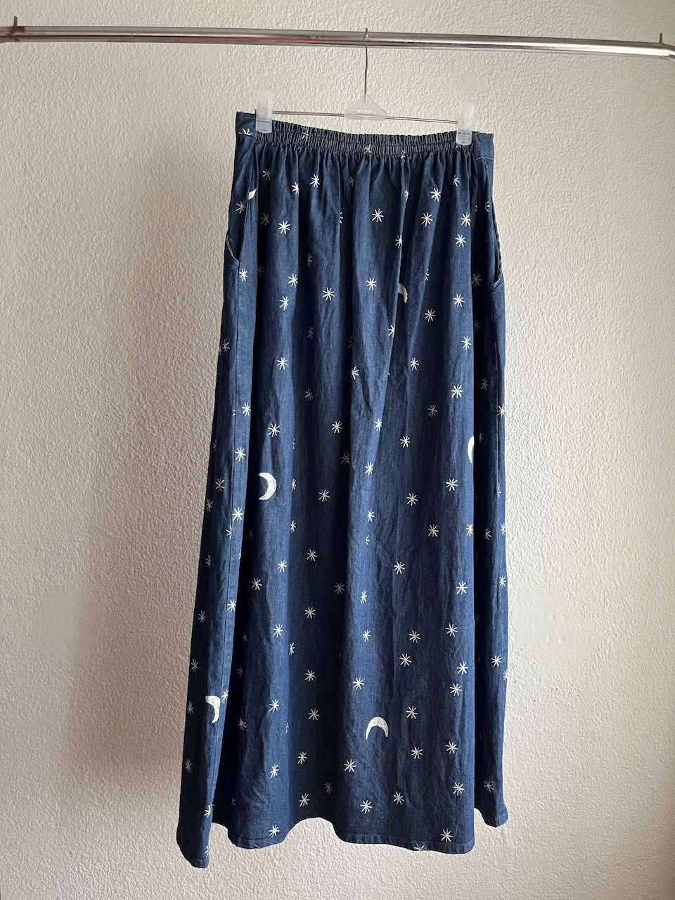 maxi falda de jean, con cintura elástizada y bolsillos
