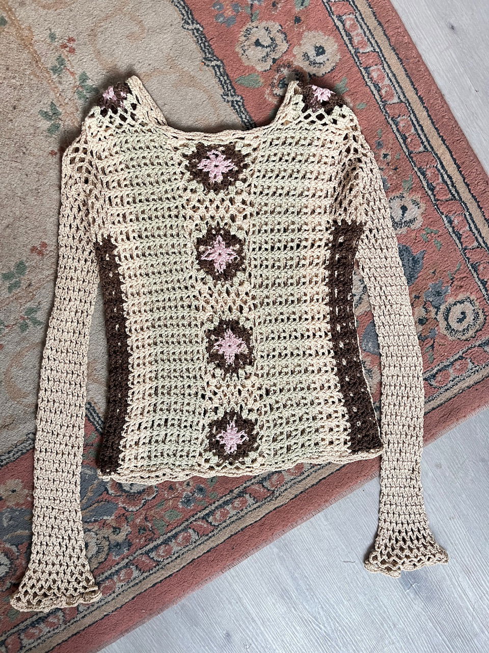 swtr tejido a mano con detalles de flores. mangas acampanadas. tejido de algodon, es pesadito. como nuevo talle L MEDIDAS (lado a lado) 46cm hmbr a hmbr 51cm ax a ax 65cm largo 82cm largo de manga
