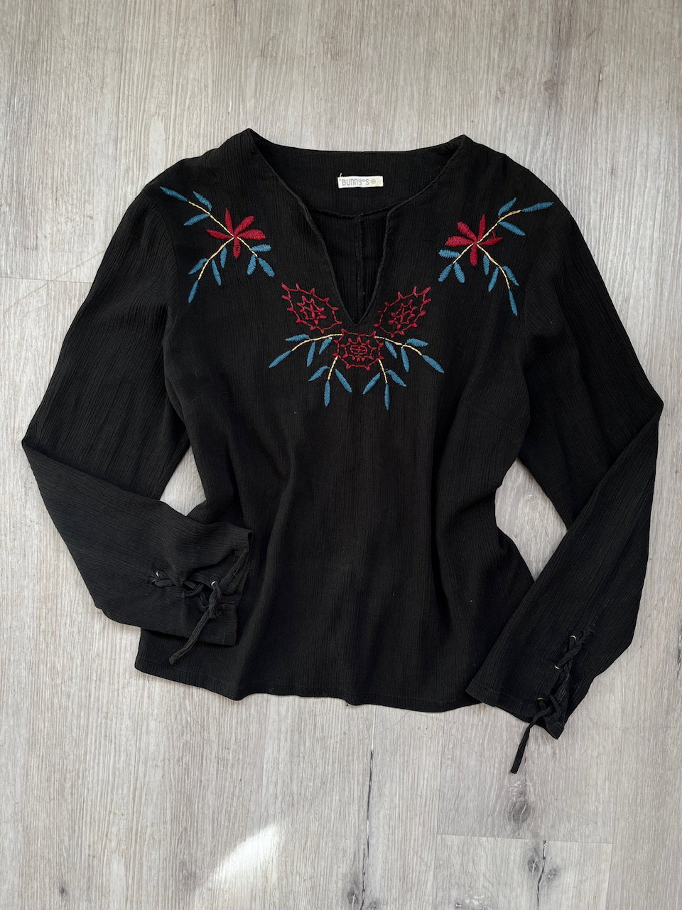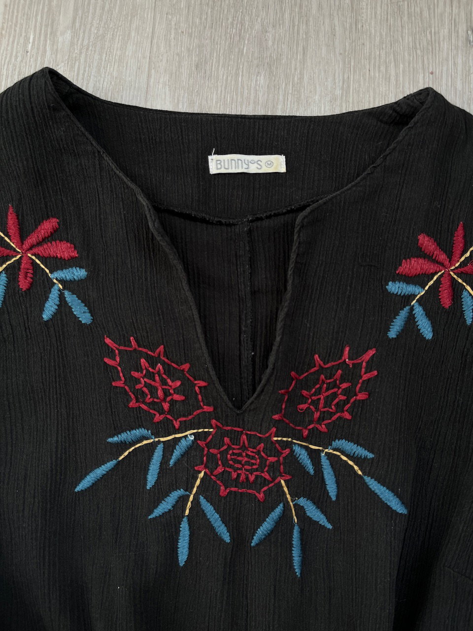 blusa bordada estilo mexicano. se puede ajustar en las mangas. es de algodon con textura, tipo lino talle m MEDIDAS (lado a lado) 45cm hmbr a hmbr 56cm ax a ax 58cm largo 57cm largo de manga