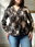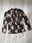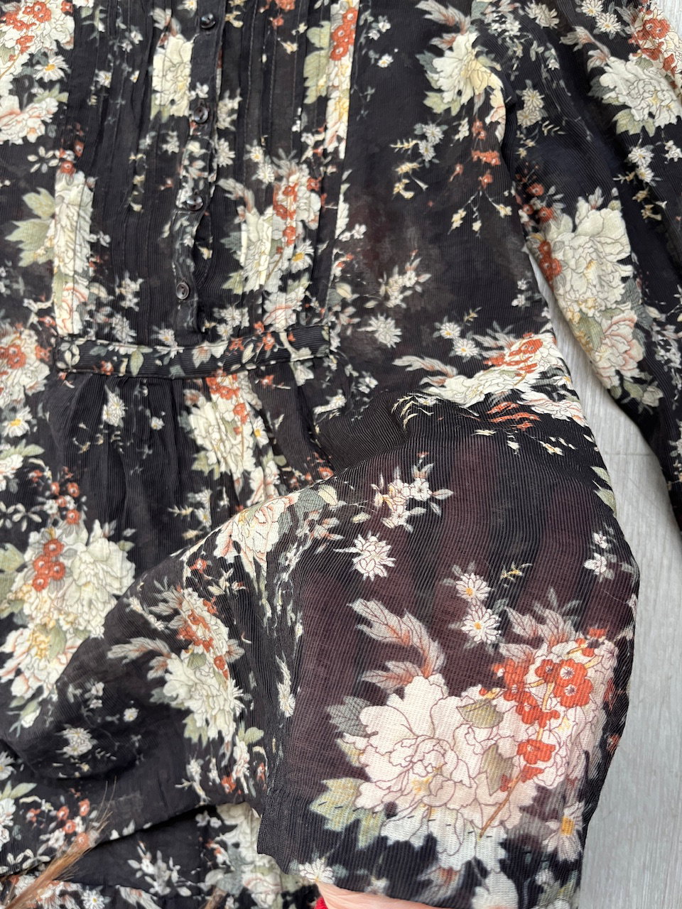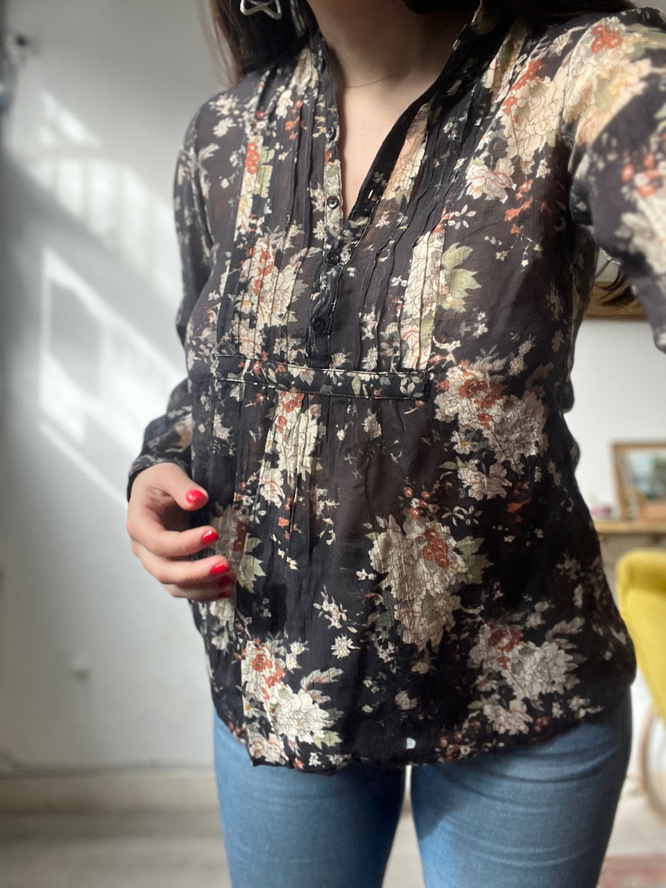 blusa con una estampa hermosa de peonias y flores, cuenta con cuello mao y tablitas en el busto con botones funcionales. aprox talle m MEDIDAS (lado a lado) 36cm hmbr a hmbr 48cm ax a ax 65cm largo 60cm largo de manga