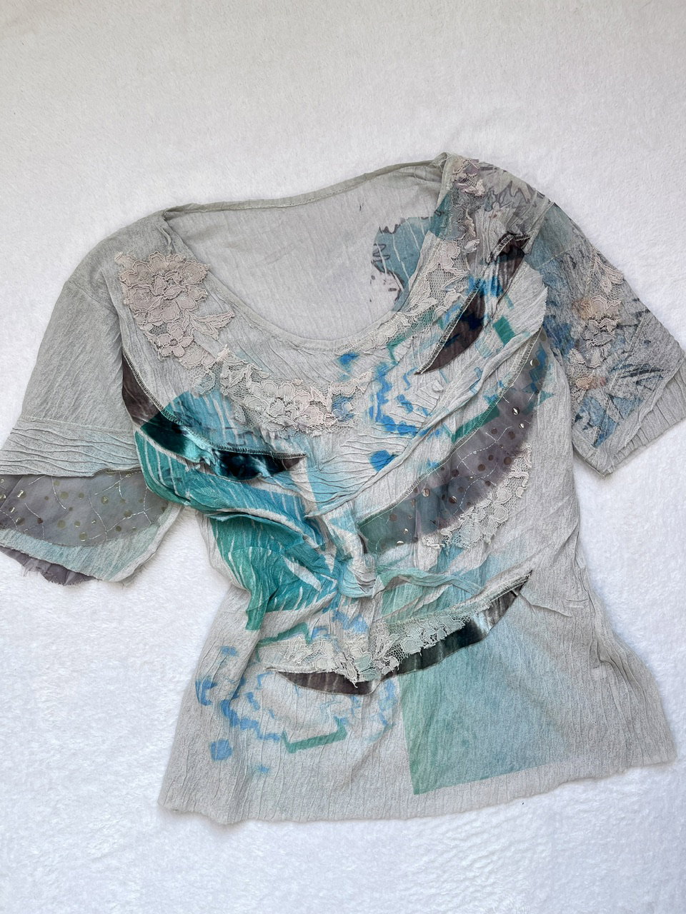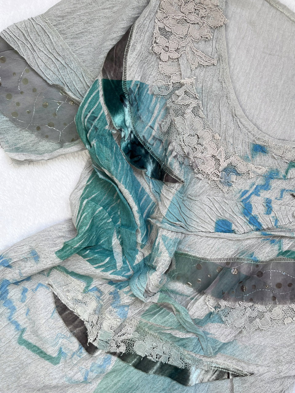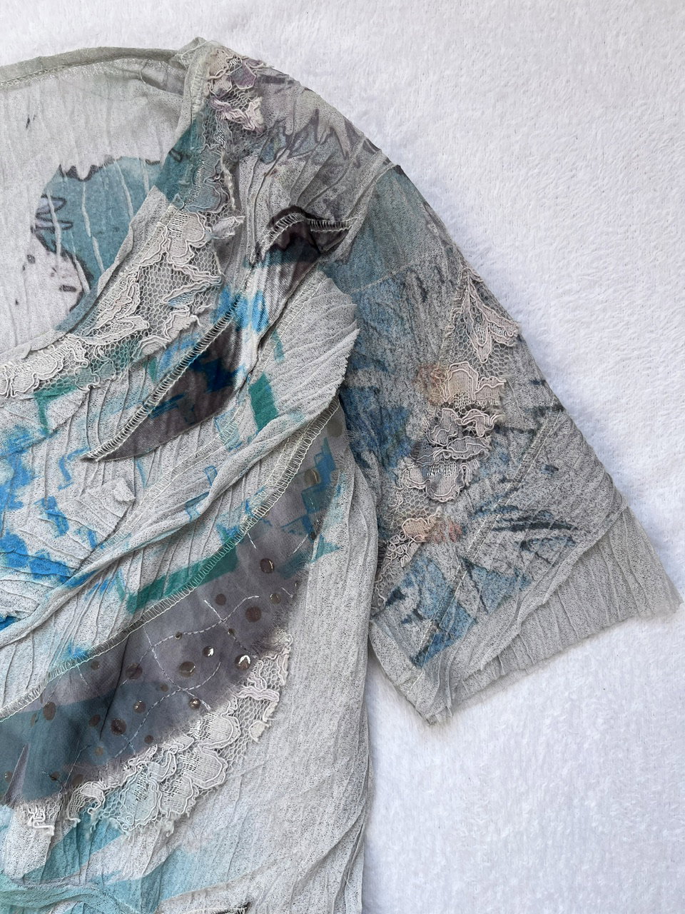 blusa de gasa con volados y detalles de encaje, mostacillas, bordados talle s MEDIDAS (lado a lado) 45cm hmbr a hmbr 50cm ax a ax 62cm largo