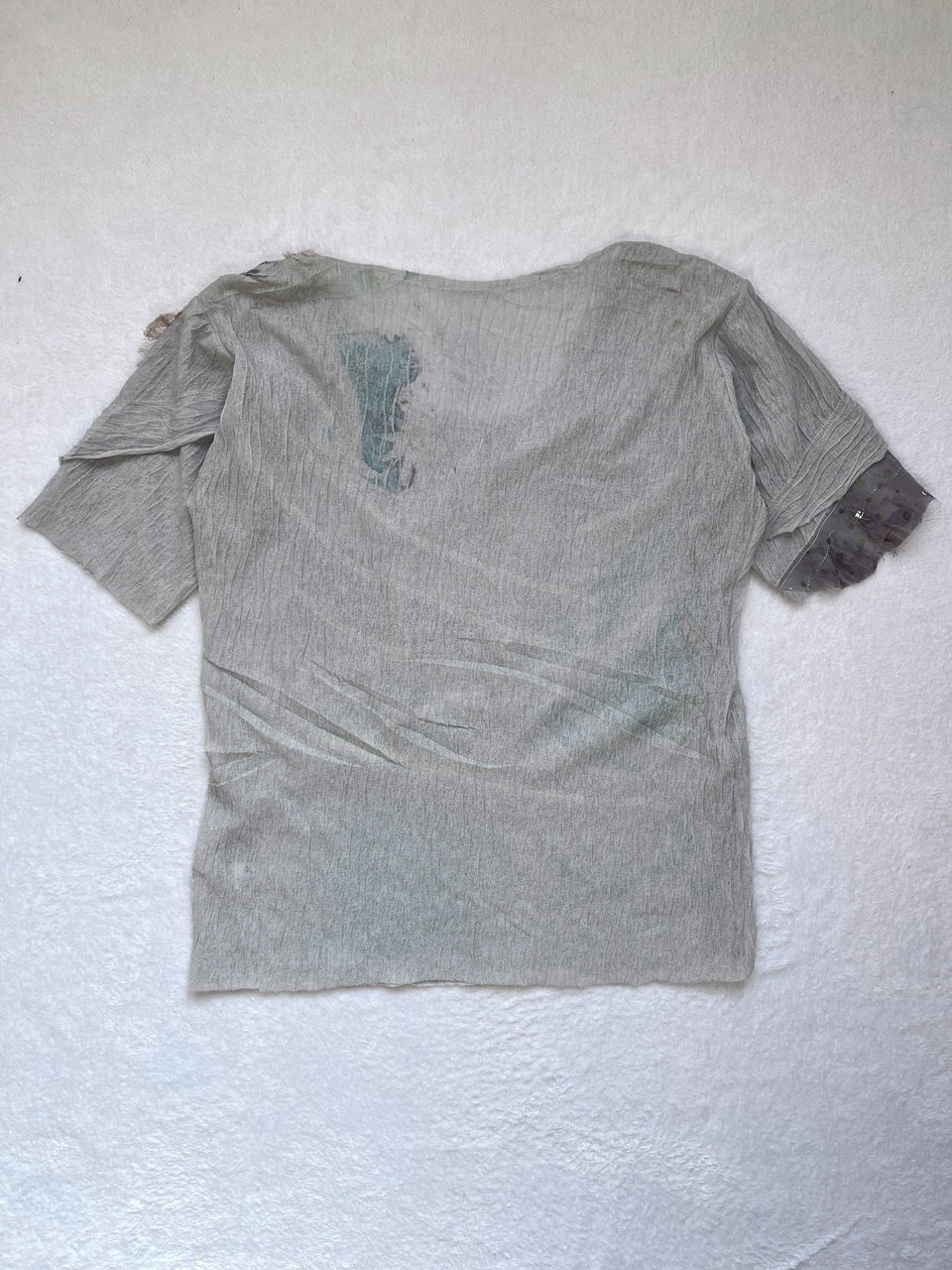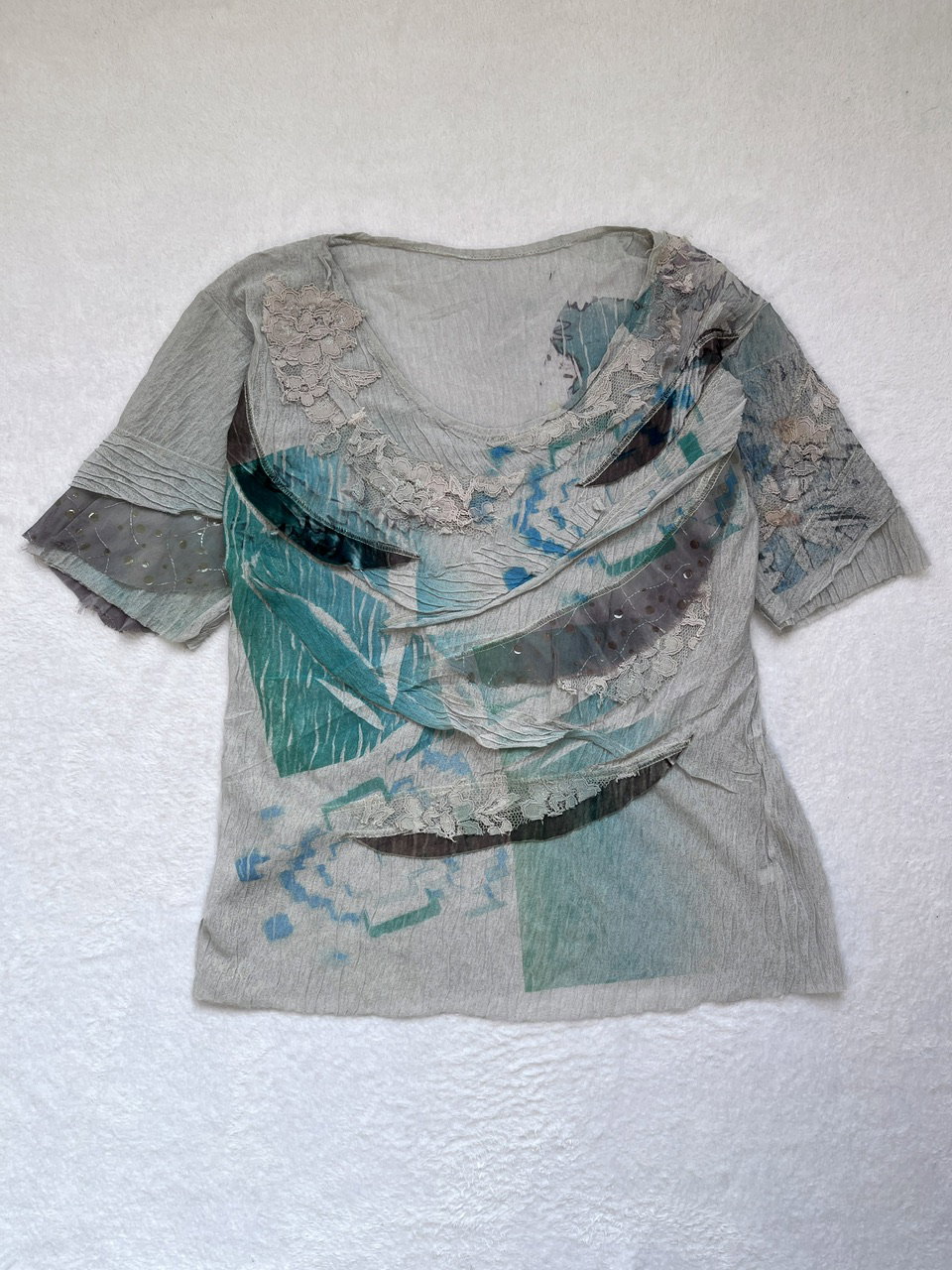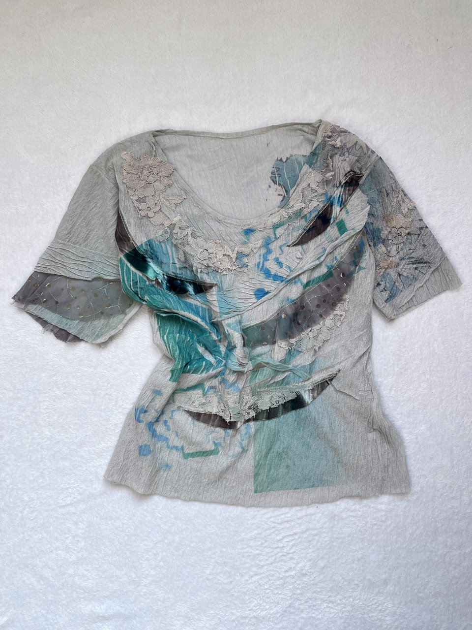 blusa de gasa con volados y detalles de encaje, mostacillas, bordados talle s MEDIDAS (lado a lado) 45cm hmbr a hmbr 50cm ax a ax 62cm largo