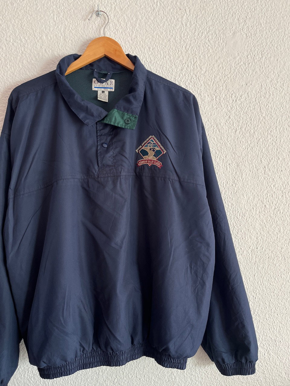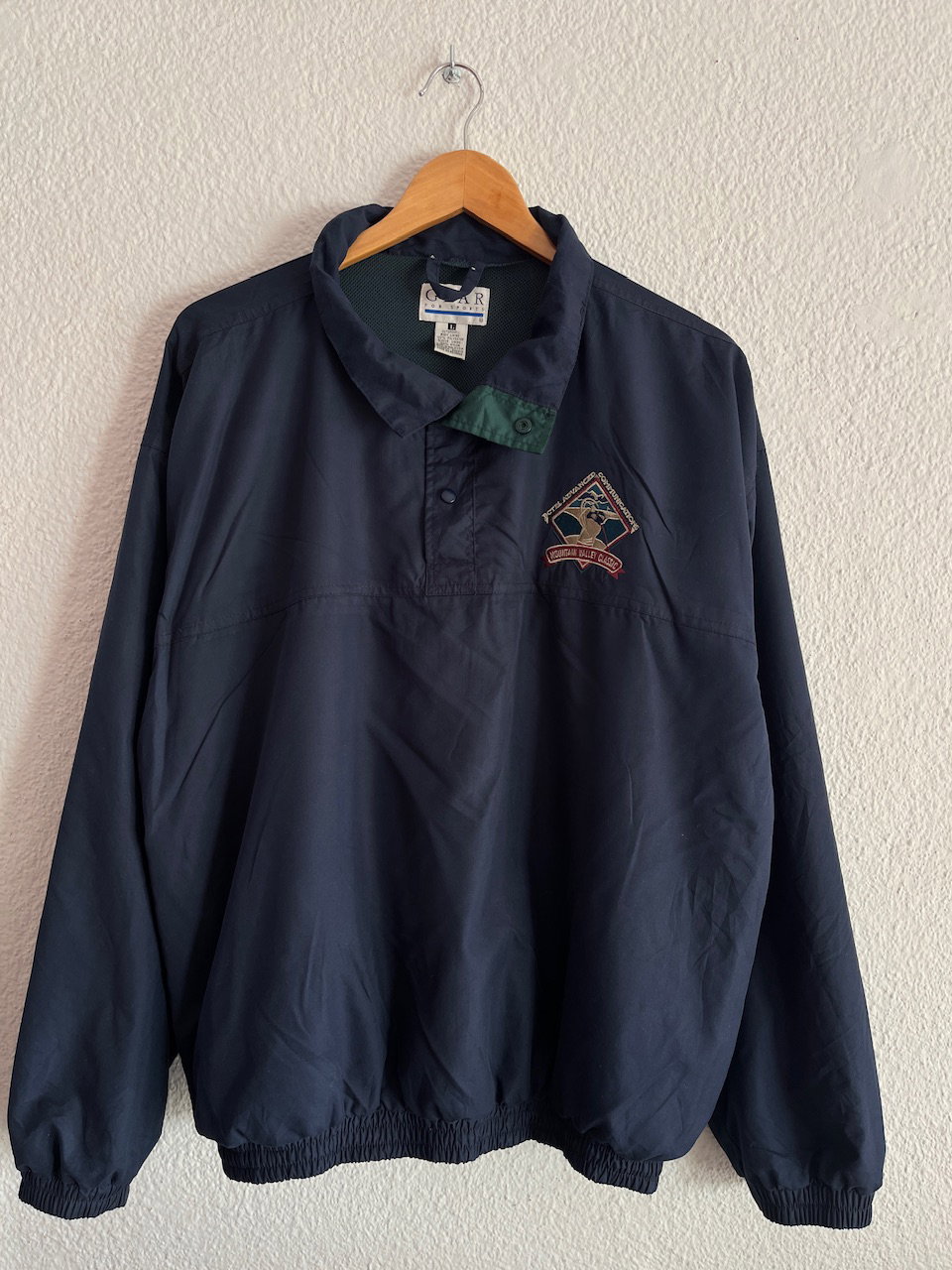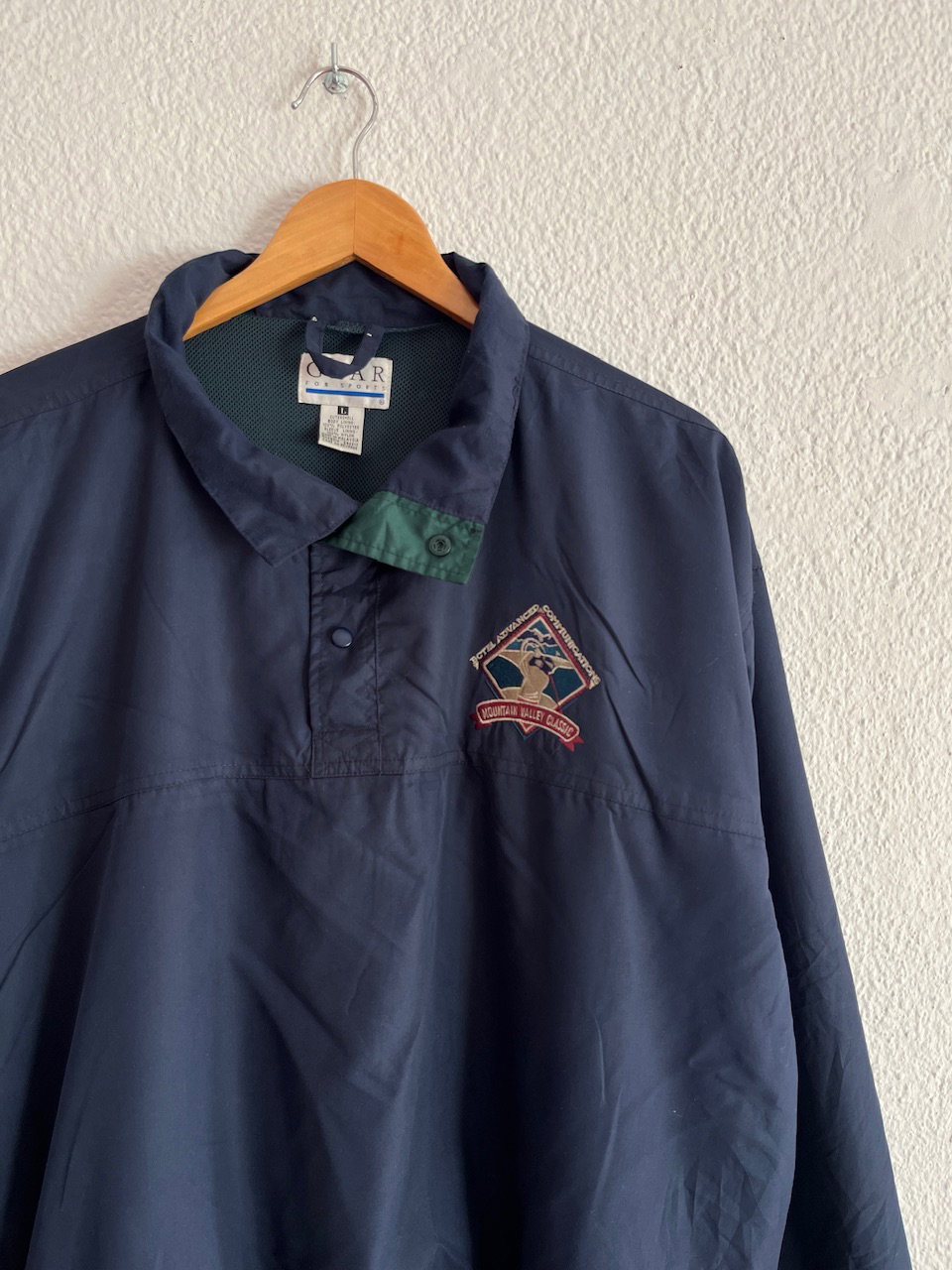 buzo rompevientos con bordado delantero, cuello abotonado y botones delanteros, elastico en la cintura. talle L aprox. vintage de los 90s, nuevo de deposito MEDIDAS (lado a lado) 64cm hmbr a hmbr 67cm ax a ax 63cm lrgo de manga 70cm largo