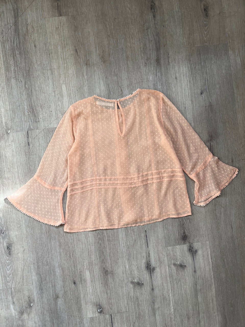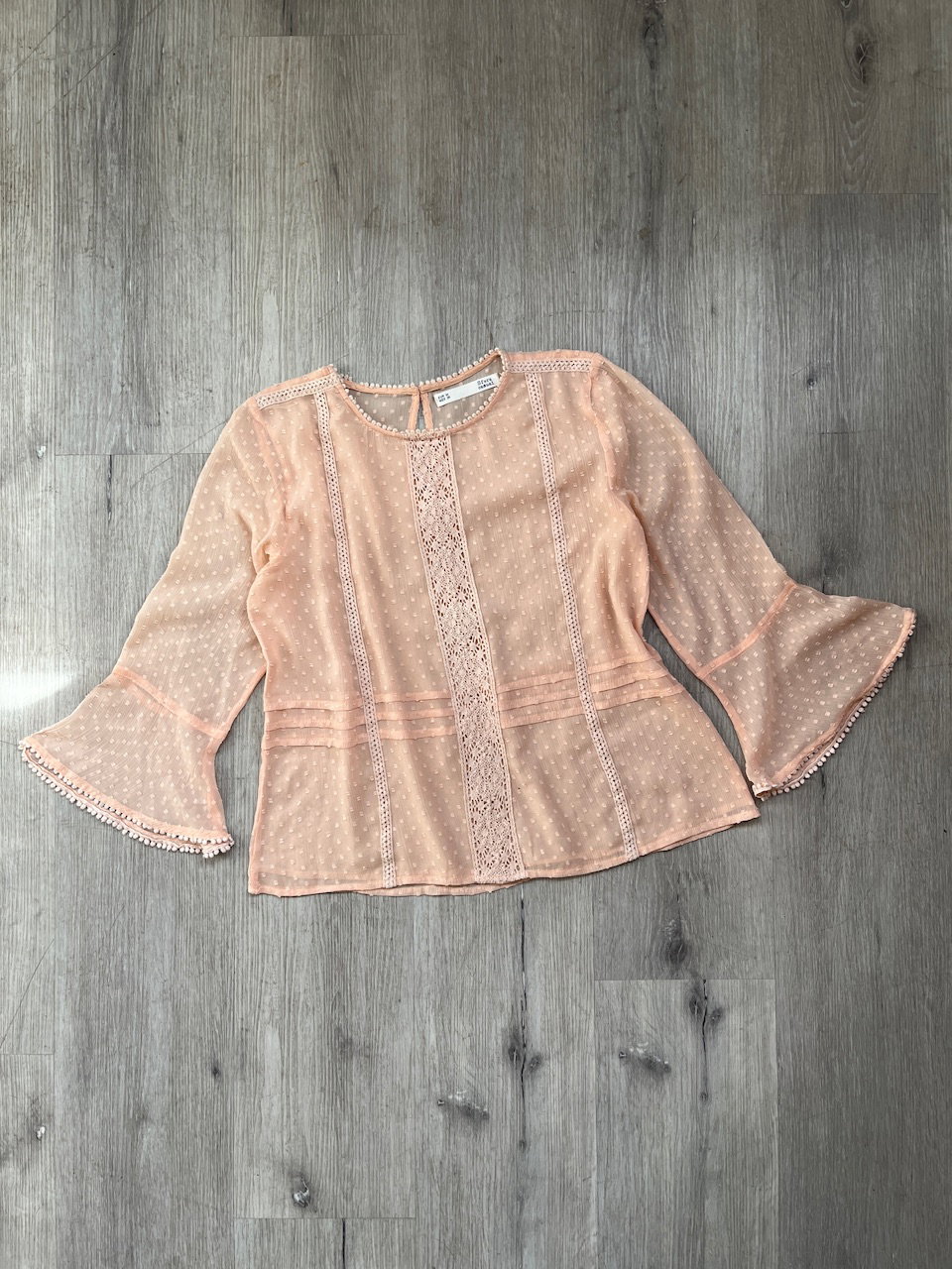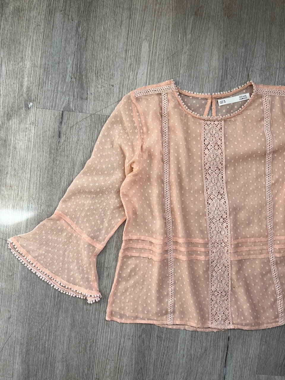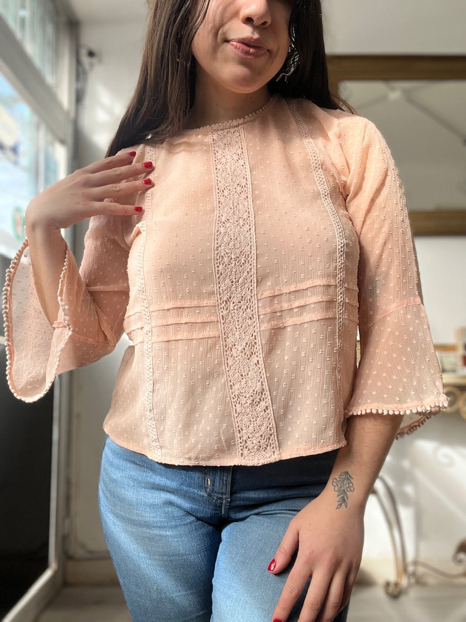 blusa de la marca española sfera casual. cuenta con bordados y guardas, mangas acampanadas. espalda traslucida, se cierra atras en el cuello. como nueva talle m aprox MEDIDAS (lado a lado) 38cm hmbr a hmbr - 50cm ax a ax - 58cm largo - 51cm largo de manga