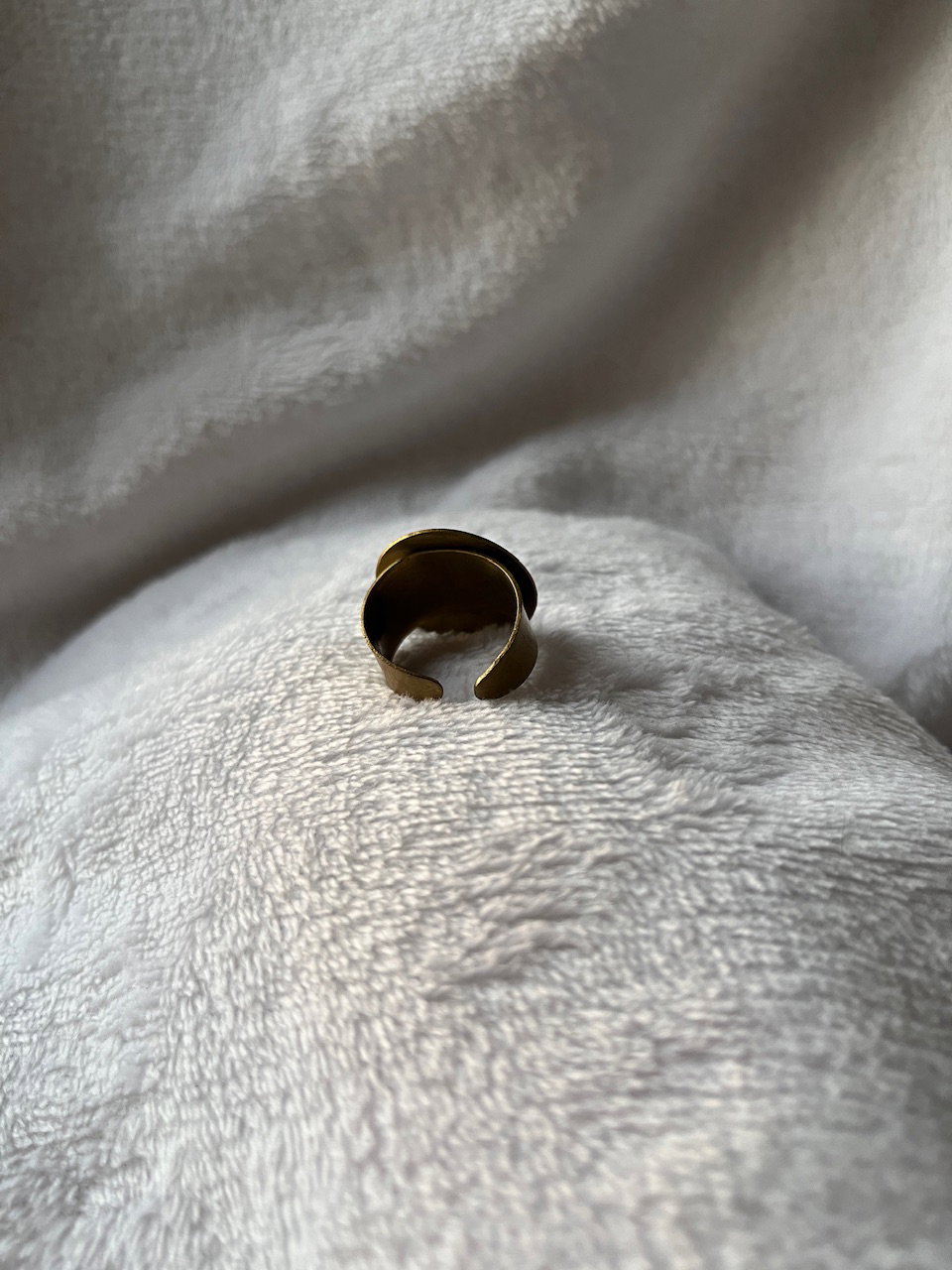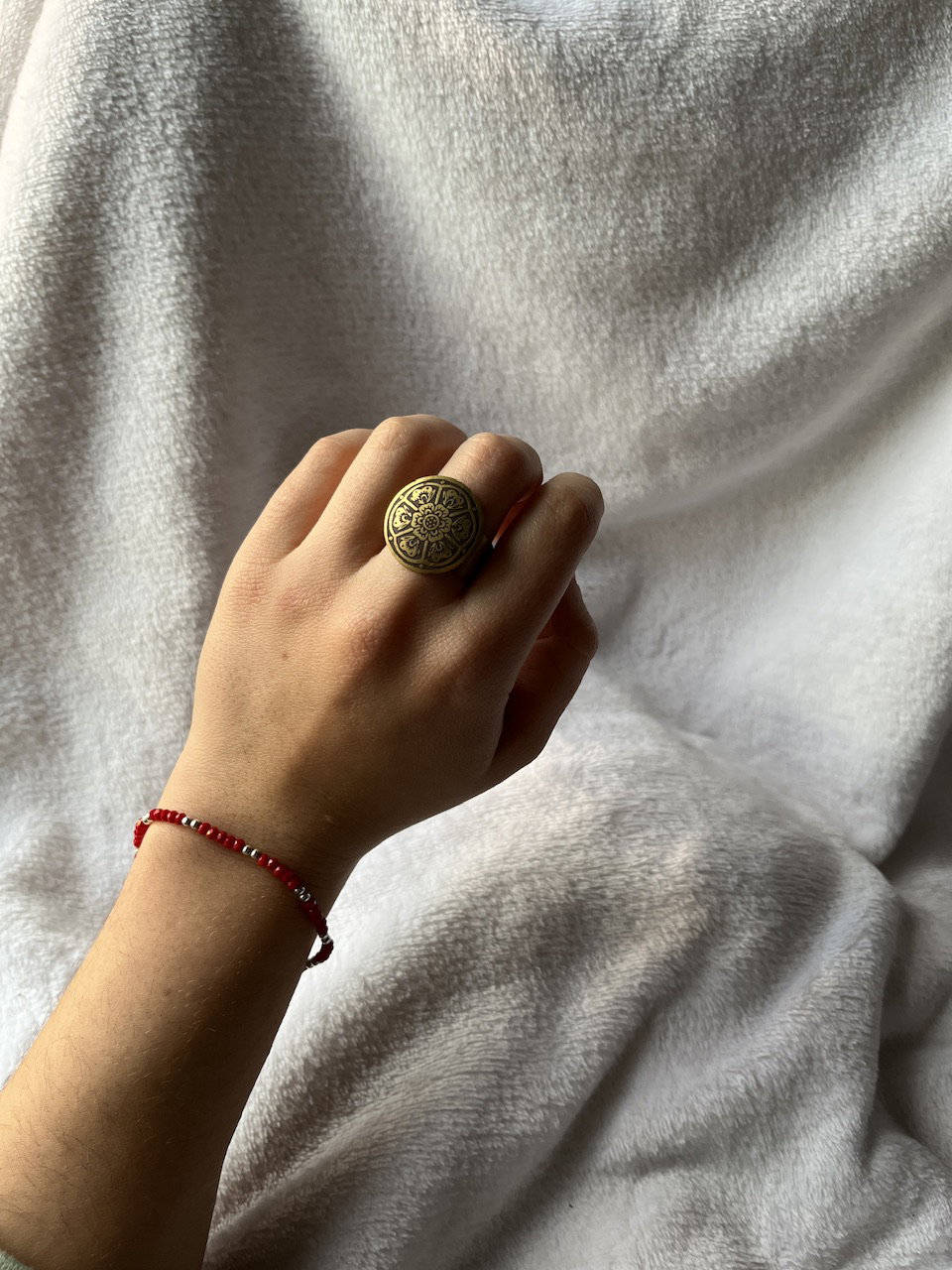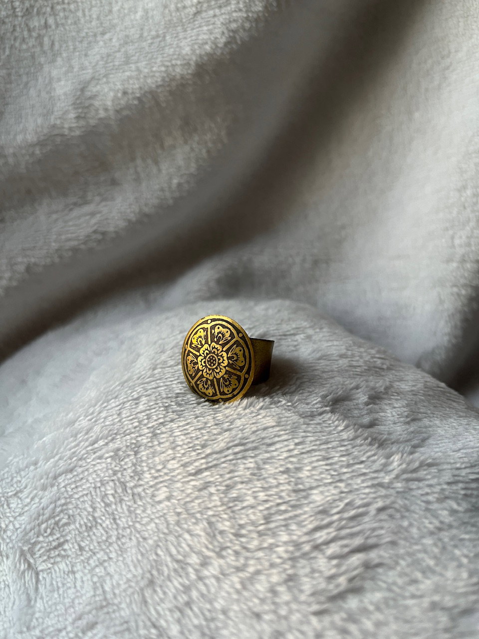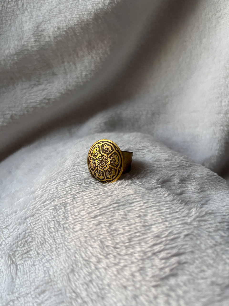 hermoso anillo con flor estampada tipo mandala, regulable MEDIDAS
