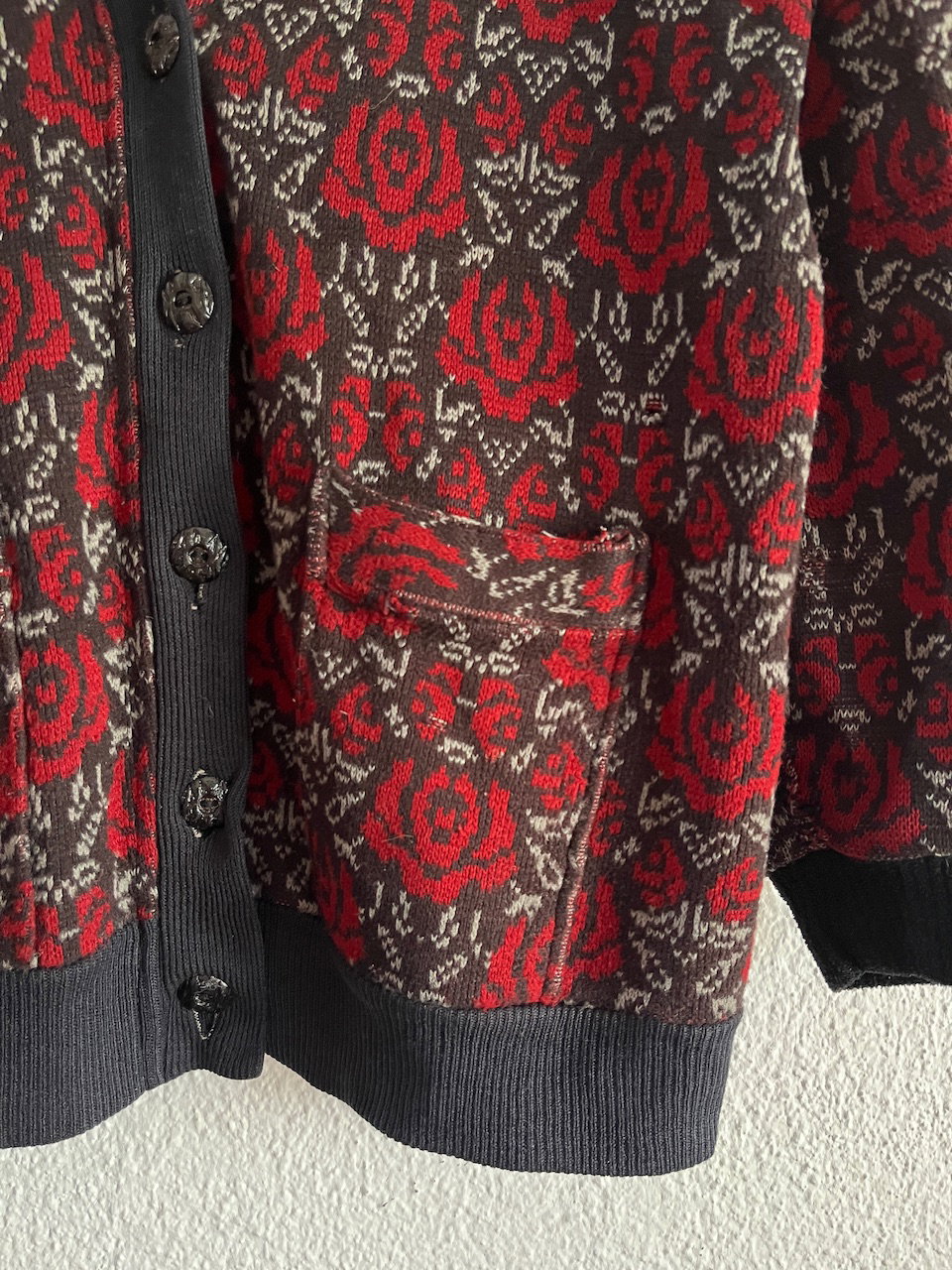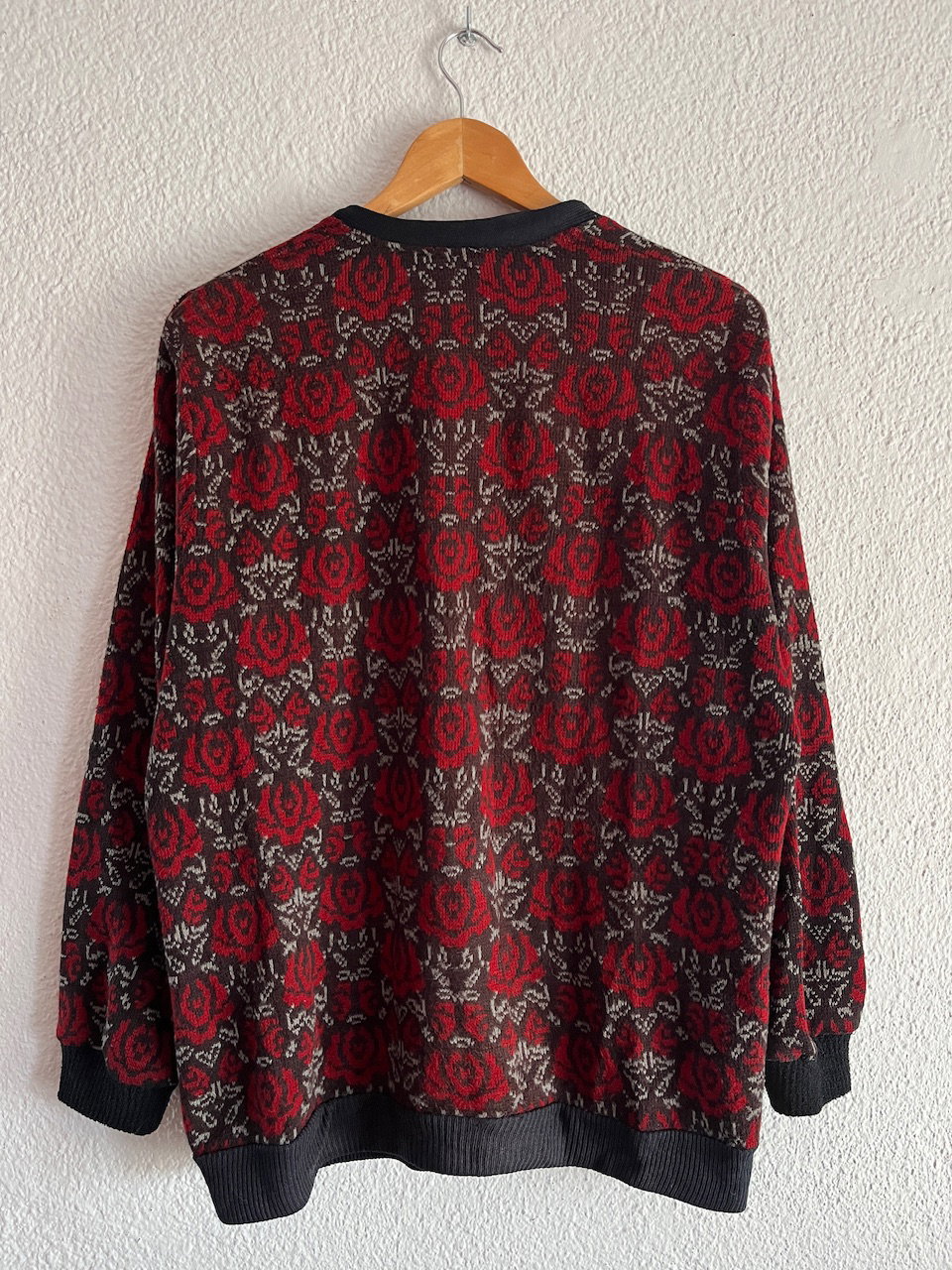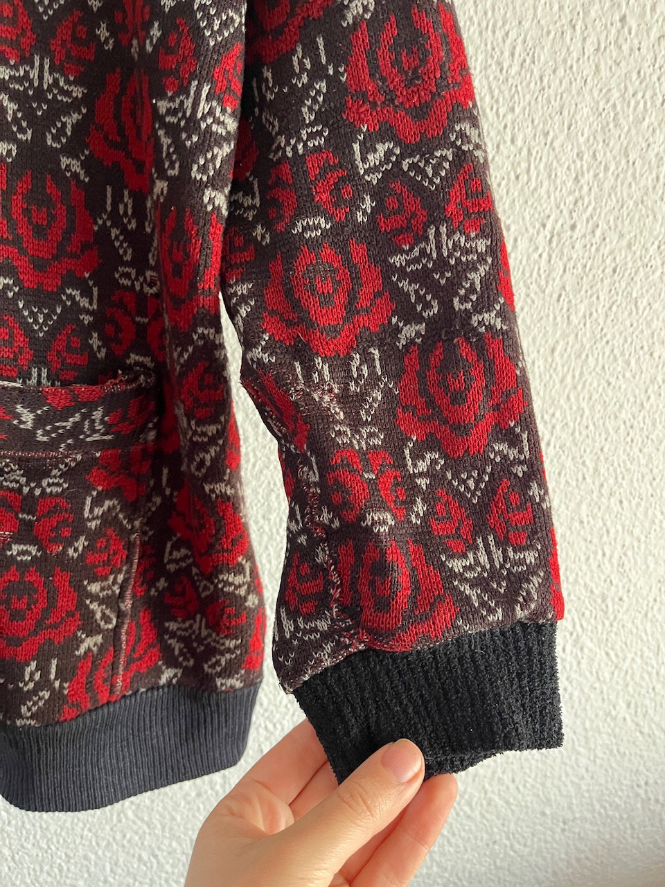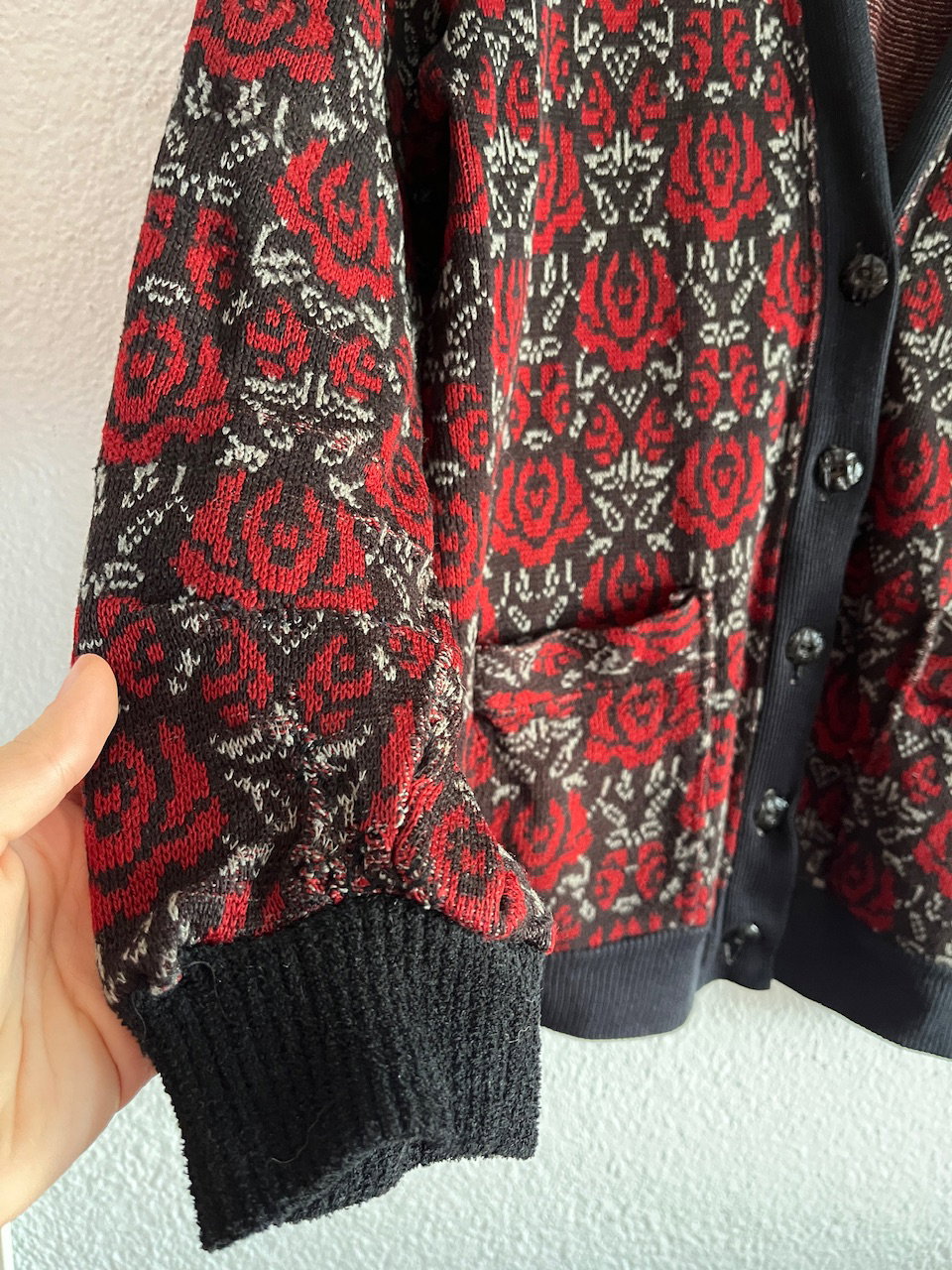 cardigan de lana con estampa de rosas, botones labrados y bolsillos. talle L aprox. tiene varios detalles en mangas, ver fotos MEDIDAS (lado a lado) 47cm hmbr a hmbr - 58cm largo de mangas - 57cm ax a ax - 28cm sisa - 70cm largo total