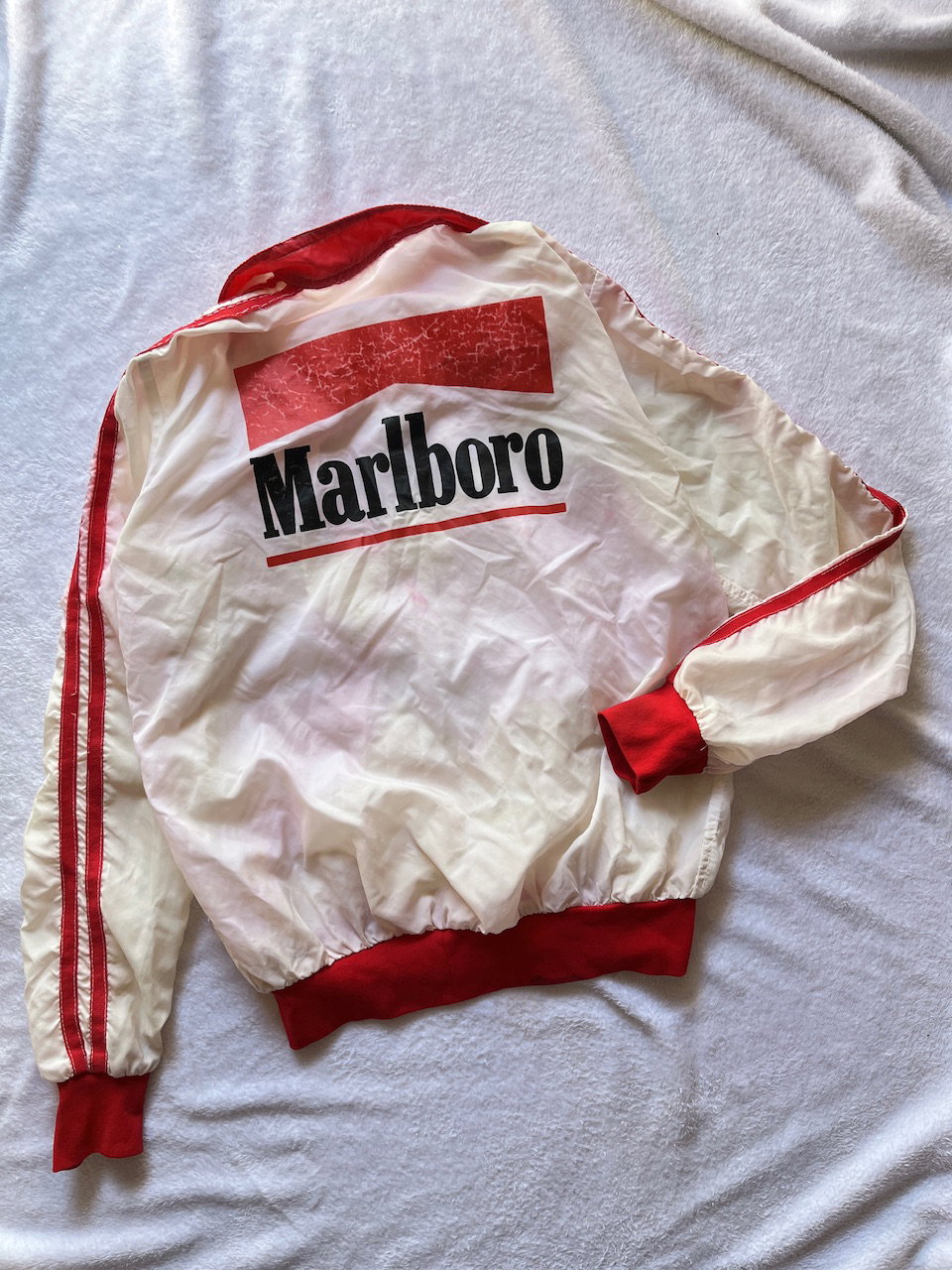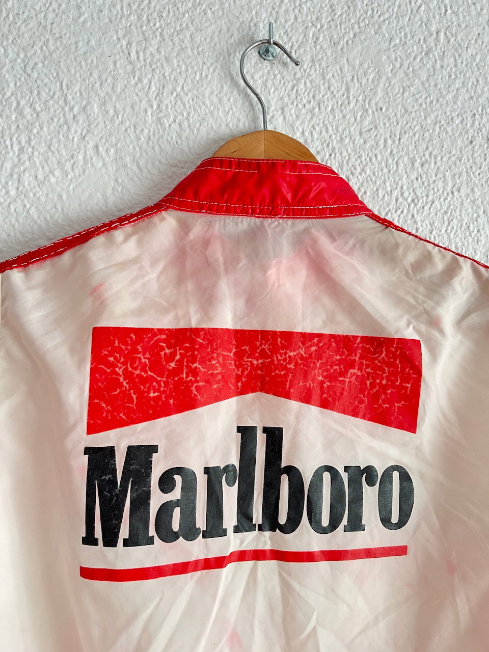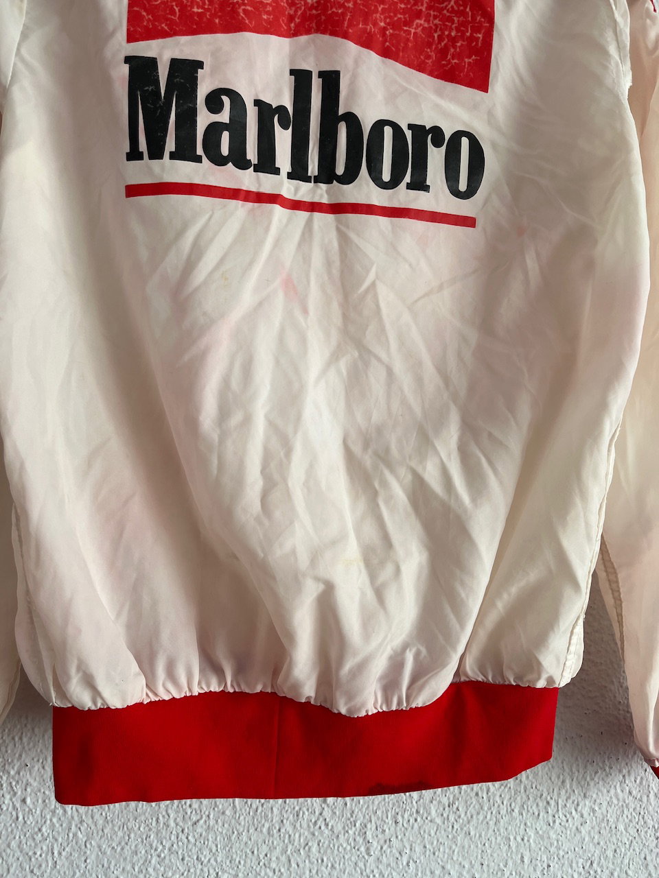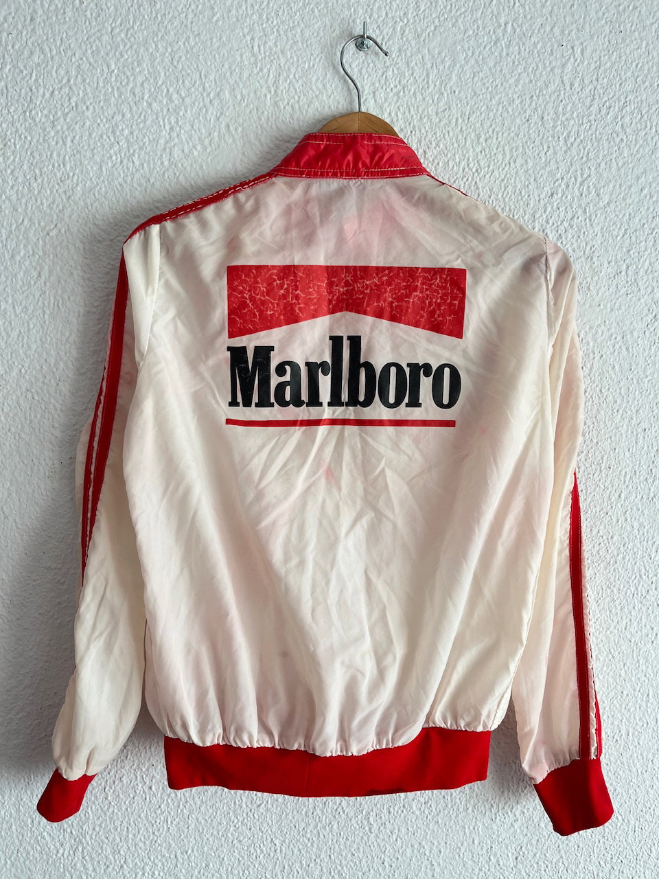 rompevientos marlboro original de los 90s, cuenta con varios bolsillos y estampa en la espalda. tiene varios detalles de terminacion desprolijos y una manchita atras (ver bien las fotos) talle s aprox MEDIDAS (lado a lado) 39cm hmbr a hmbr - 53cm ax a ax - 62cm largo de manga - 58cm largo
