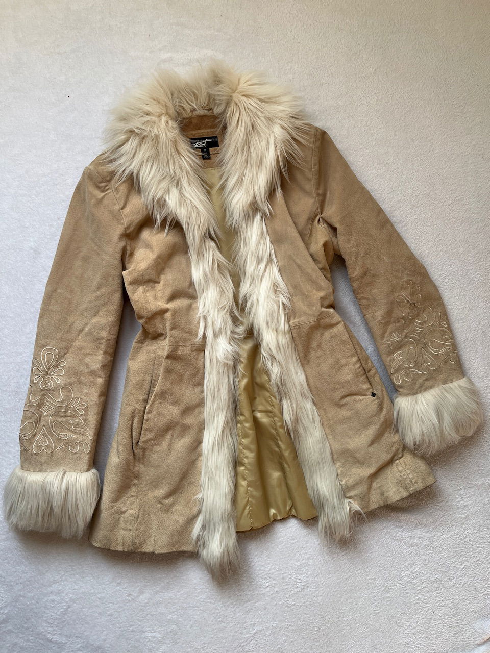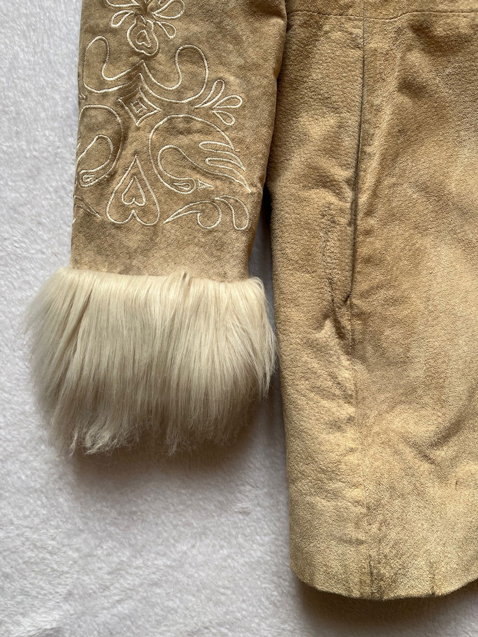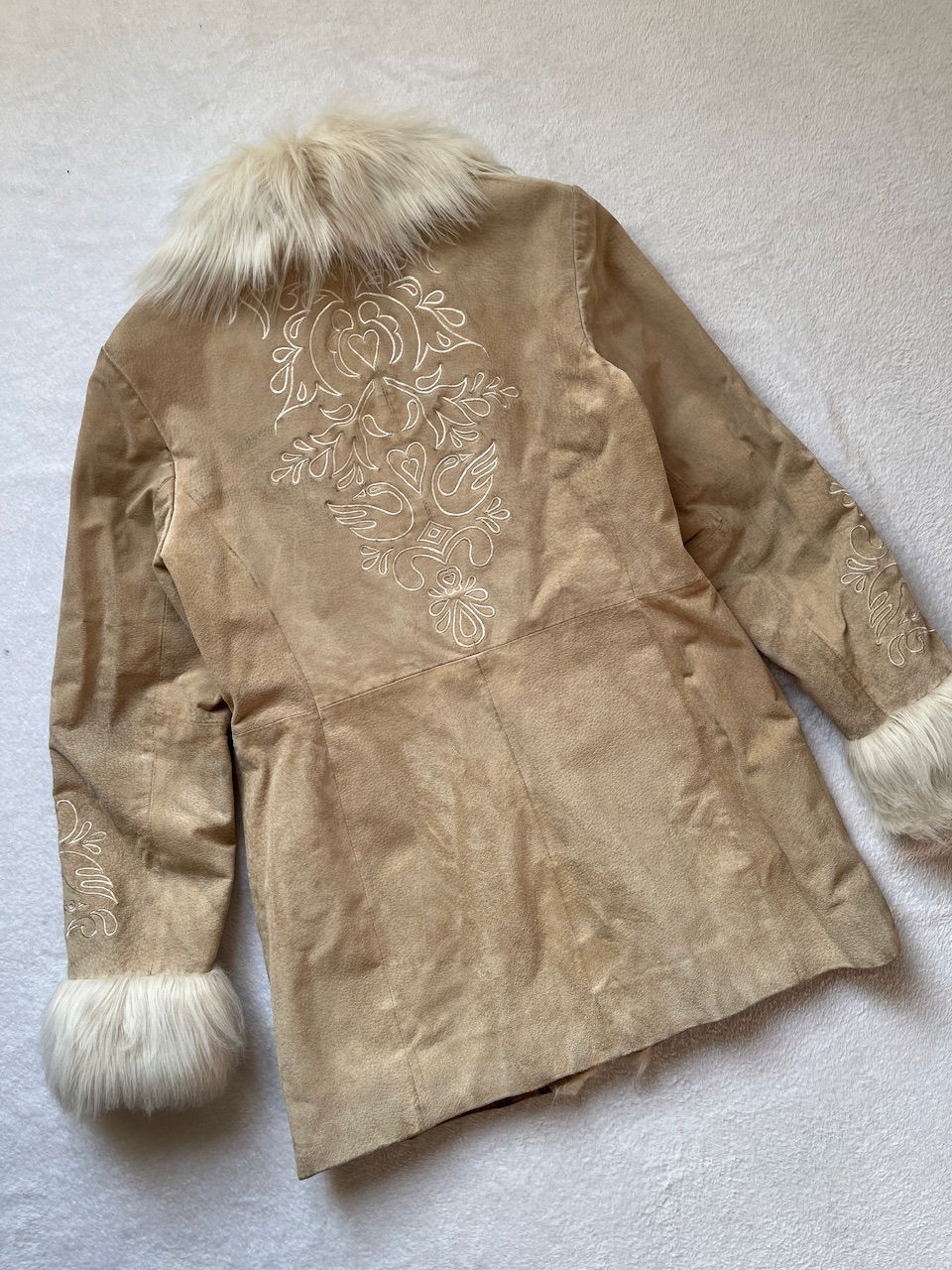 hermoso tapado de gamuza con detalles en piel sintetica y bordado, en mangas y espaldas. cuenta con ganchitos para cerrar tipo "Invisible". es un talle m. original de los 00s. ver detalles de la gamuza en fotos MEDIDAS (lado a lado) 41cm hmbr a hmbr - 53cm ax a ax -77cm largo total -64cm largo de manga