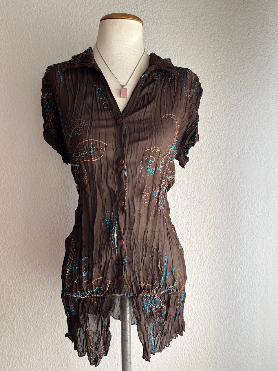 hermosa camisa de creppe trasparente tipo gasa con full bordados, ajustada en la cintura. talle m MEDIDAS (lado a lad) 40cm hmbr a hmbr - 50cm ax a ax - 71cm largo