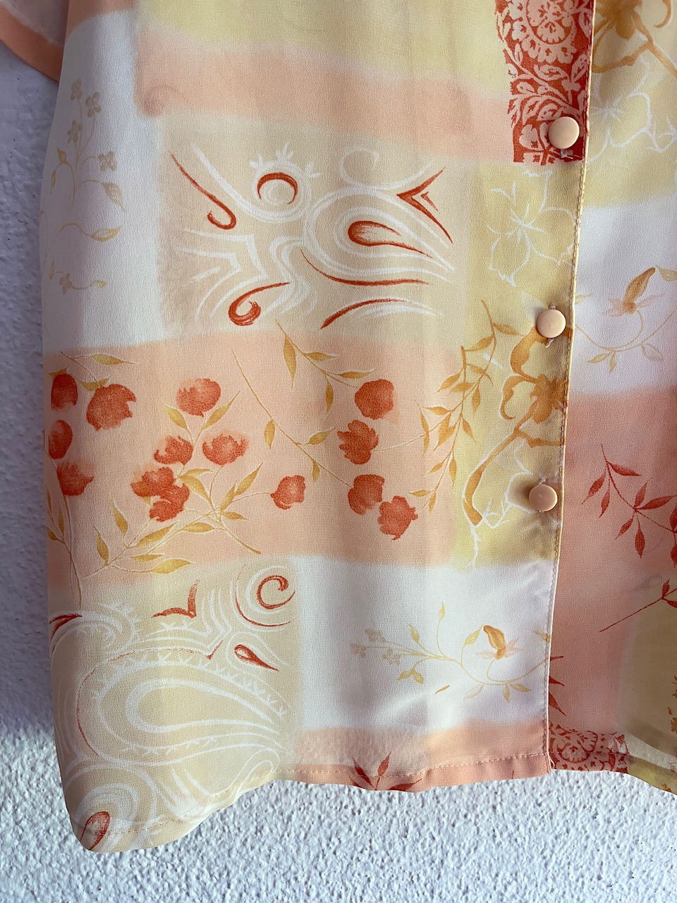 hermosa camisa vintage, de gasa con estampa floral y botones a juego. talle L aprox MEDIDAS (lado a lado) 46cm hmbr a hmbr- 58cm ax a ax- 65cm largo