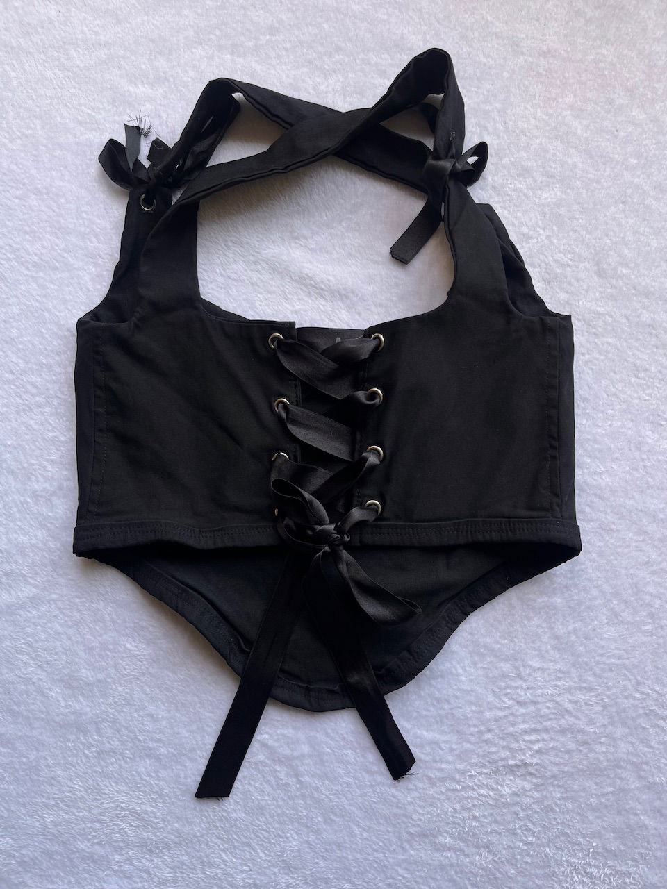 corset de confección upcyling, realizado a partir de un jean elastizado. es de gabardina y cuenta con ballenas, breteles y espaldas regulables con una cinta de raso. aprox talle m impecable estado