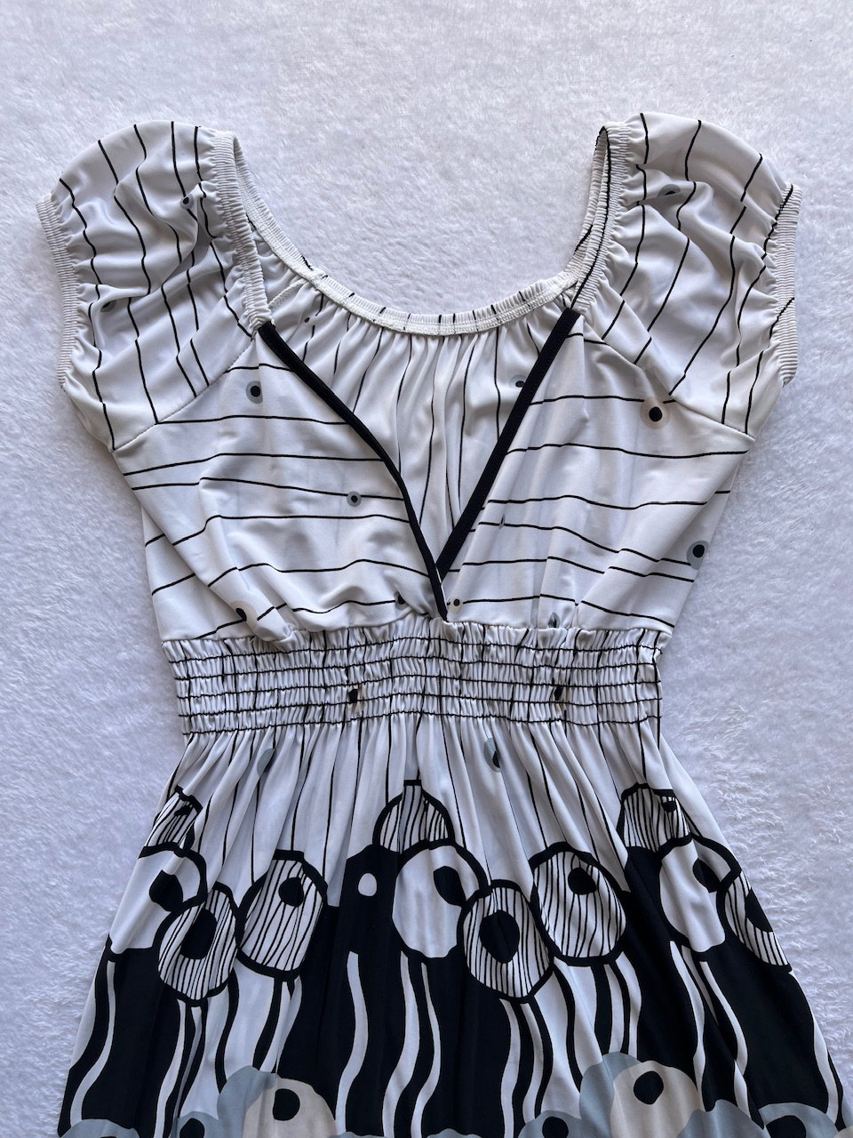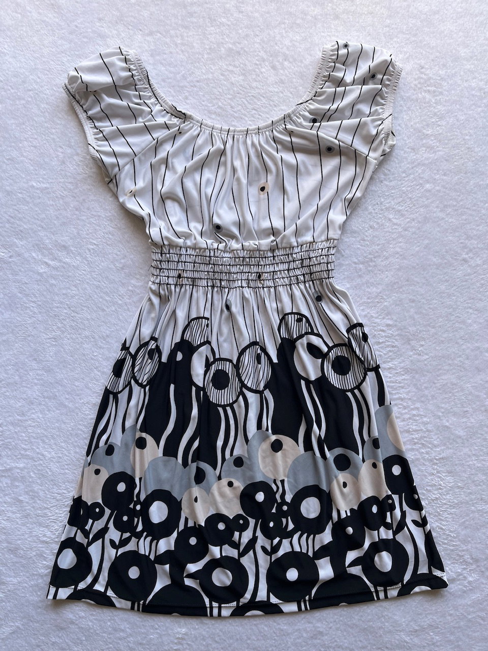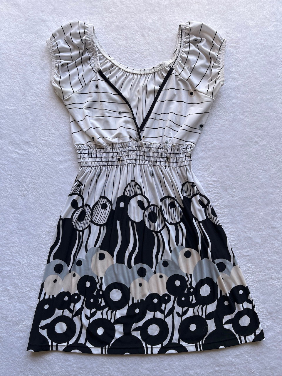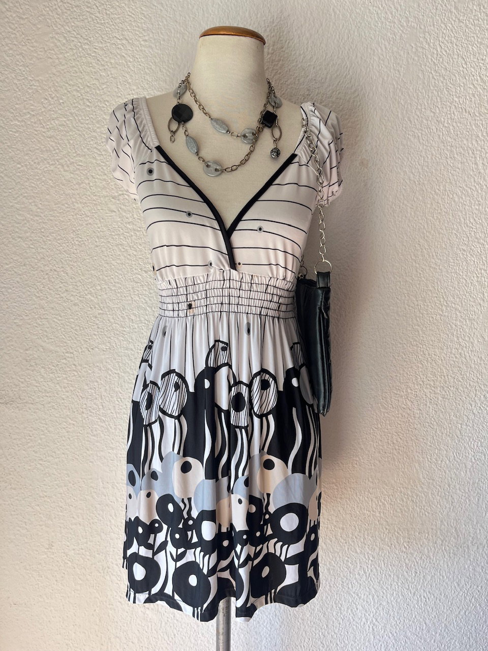 vestido mini original de los 00s de seda fría estampada, es súper elastizado. con escote en V y manguitas tipo globo. impecable estado - aprox talle s/m