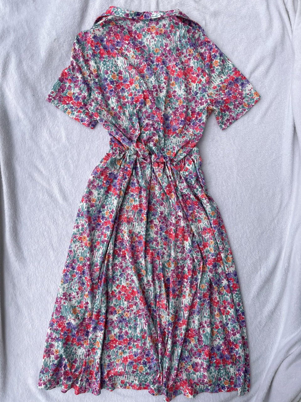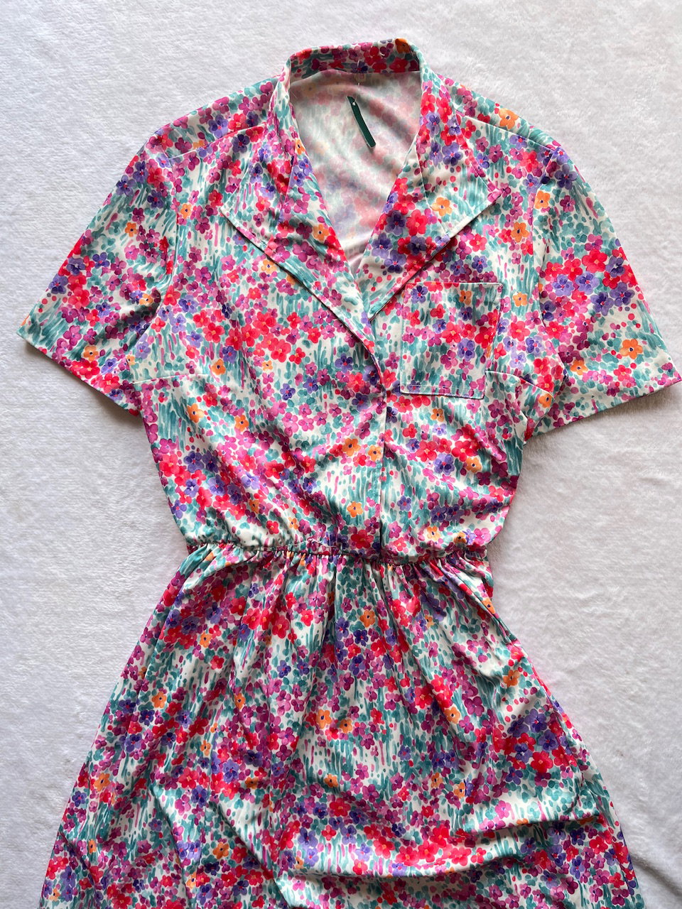 vestido vintage original de los 80s de seda fría estampada, es súper elastizado. con escote en V y cuello camisero, botones funcionales y cintura elástizada. impecable estado - aprox talle m
