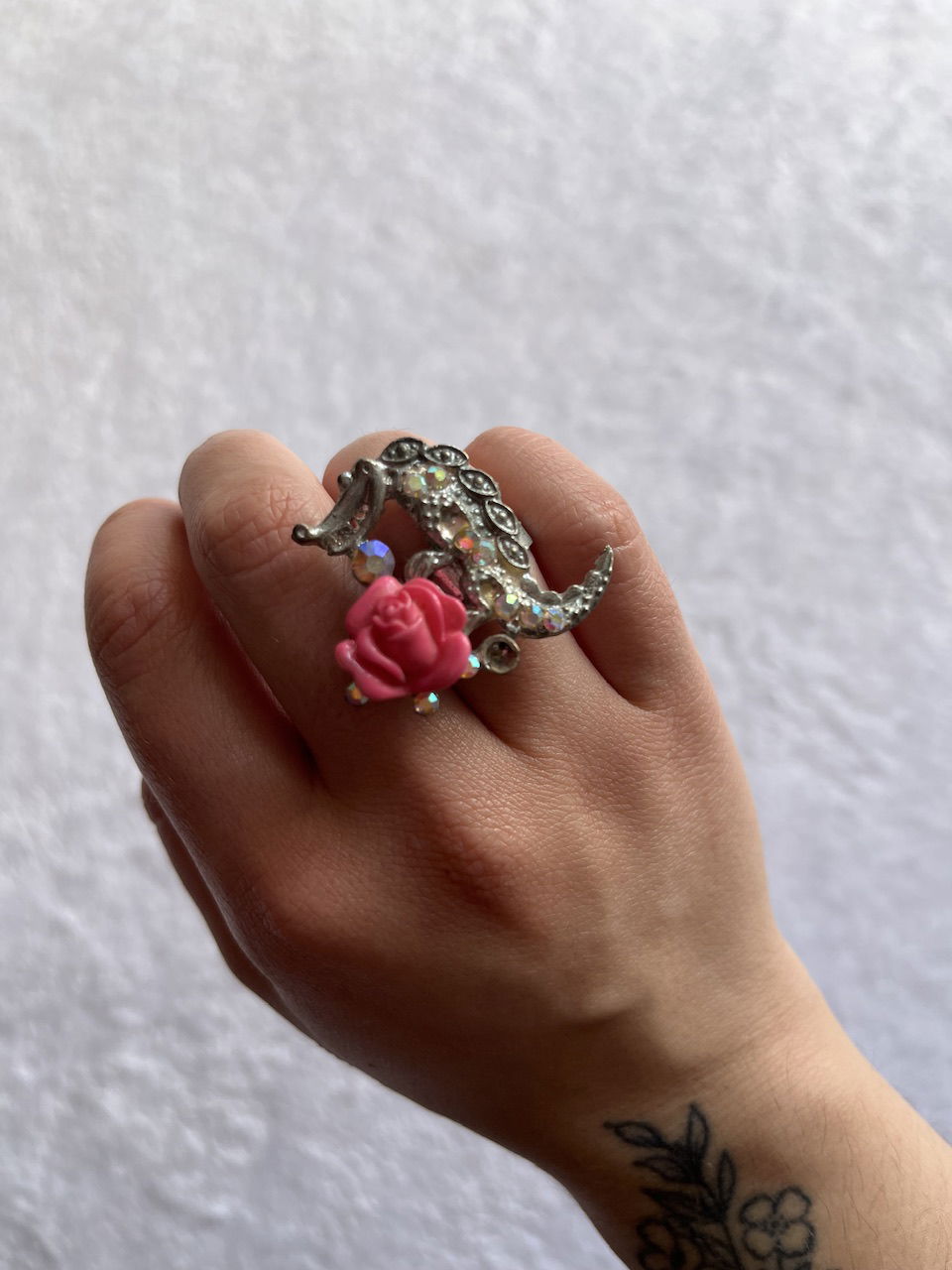 anillo de crocodrilo con rosa y strass. tamaño mediano. regulable