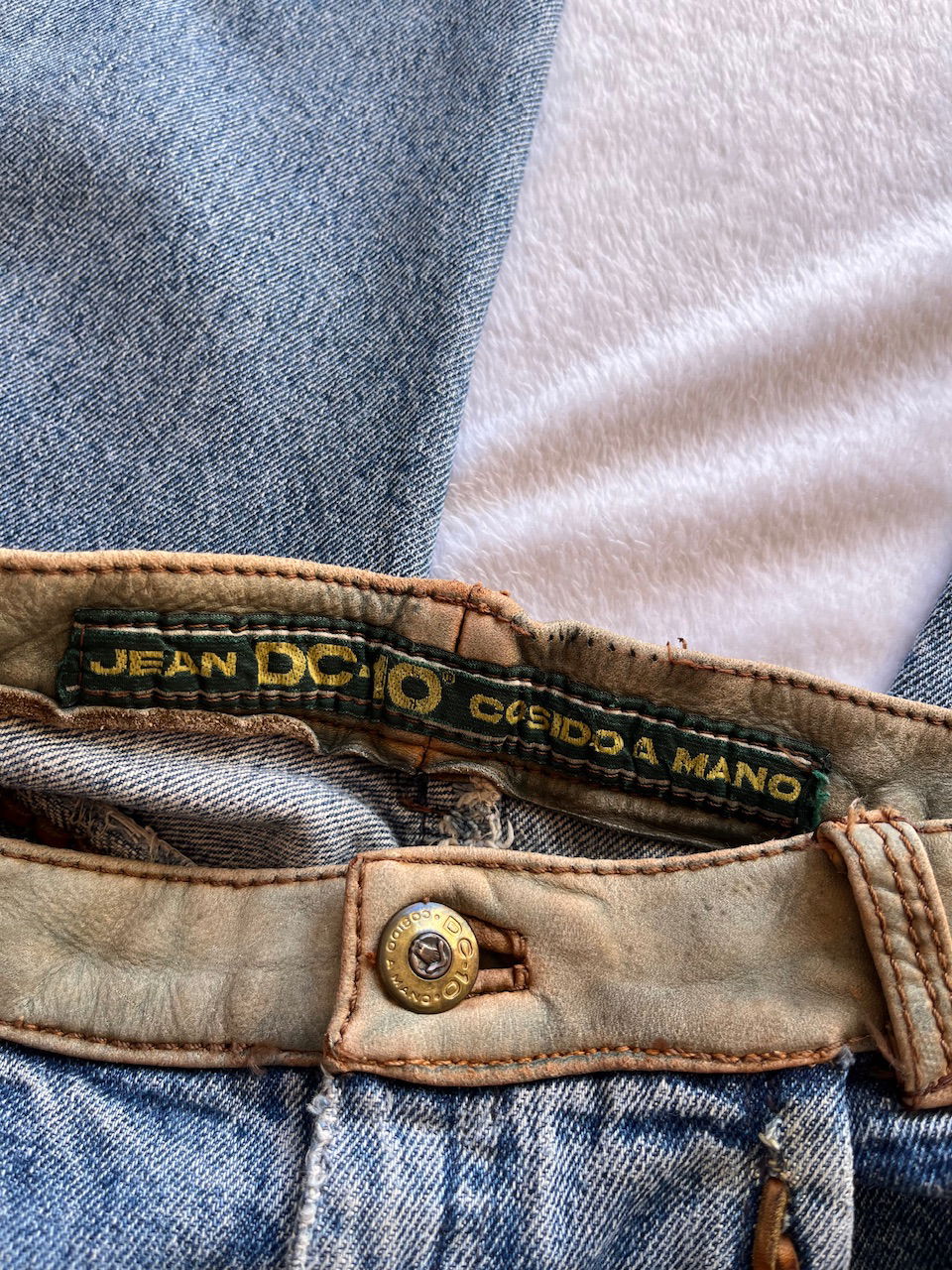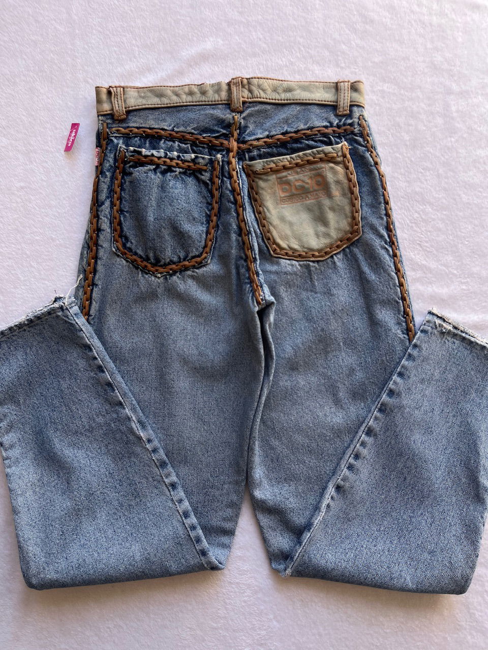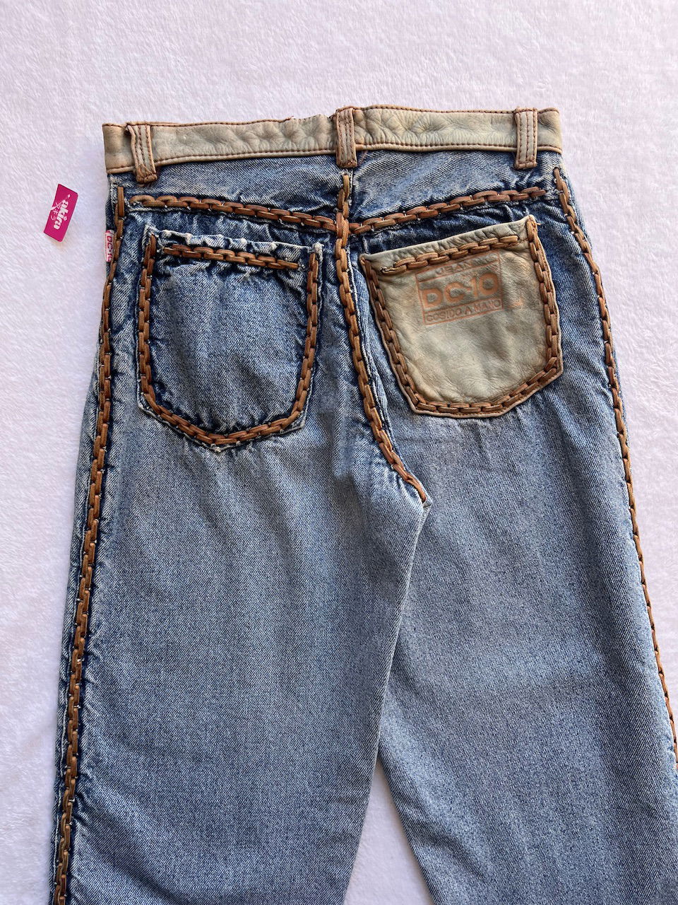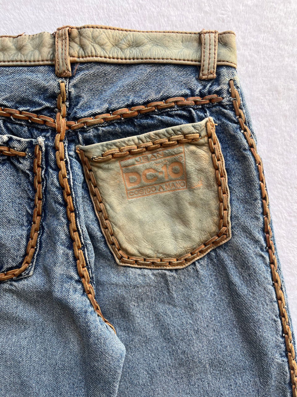 jean con detalles en cuero cosido a mano talle 36 aprox
