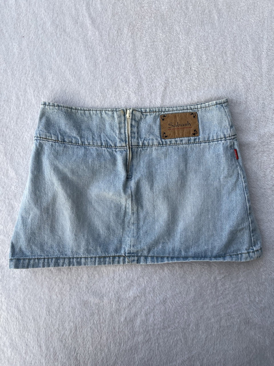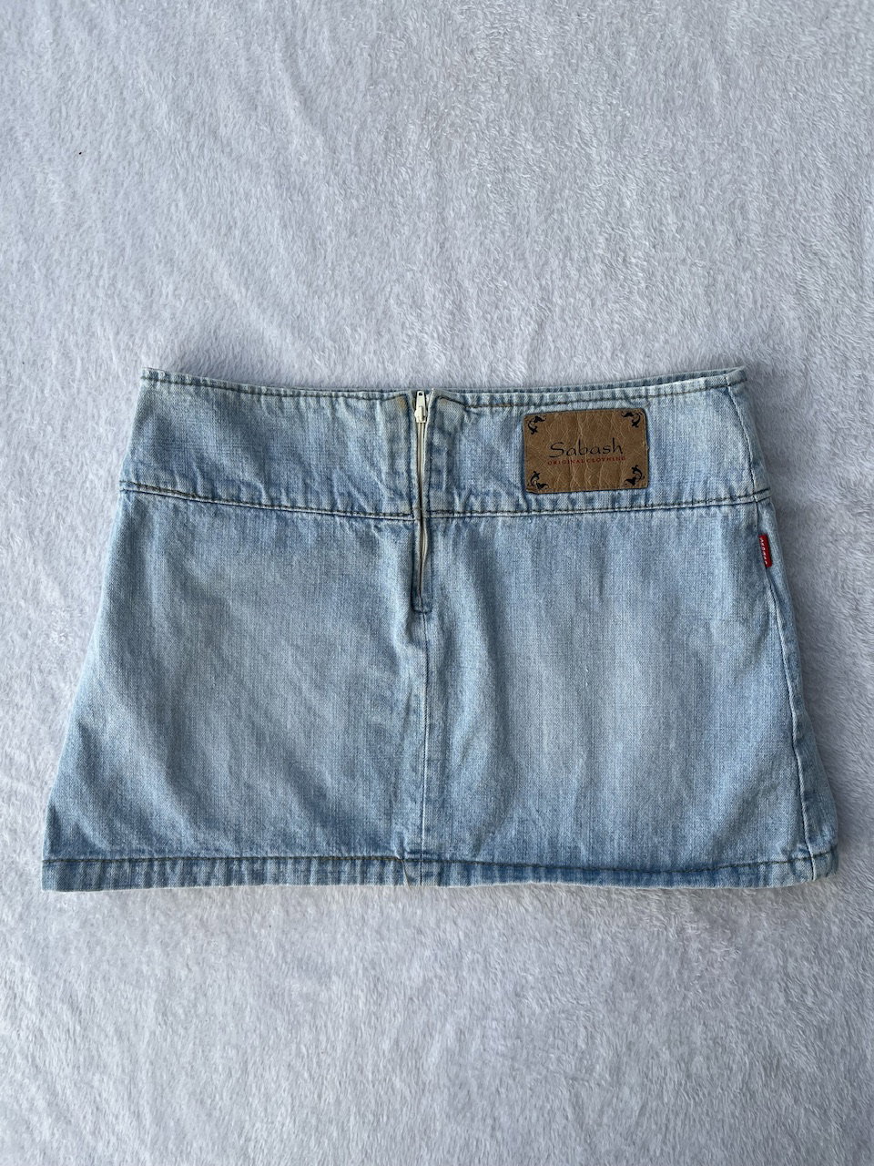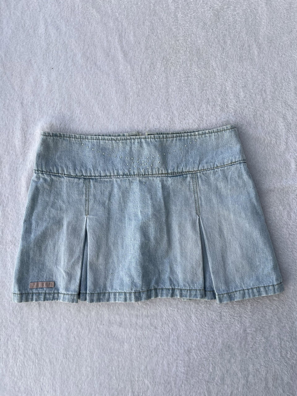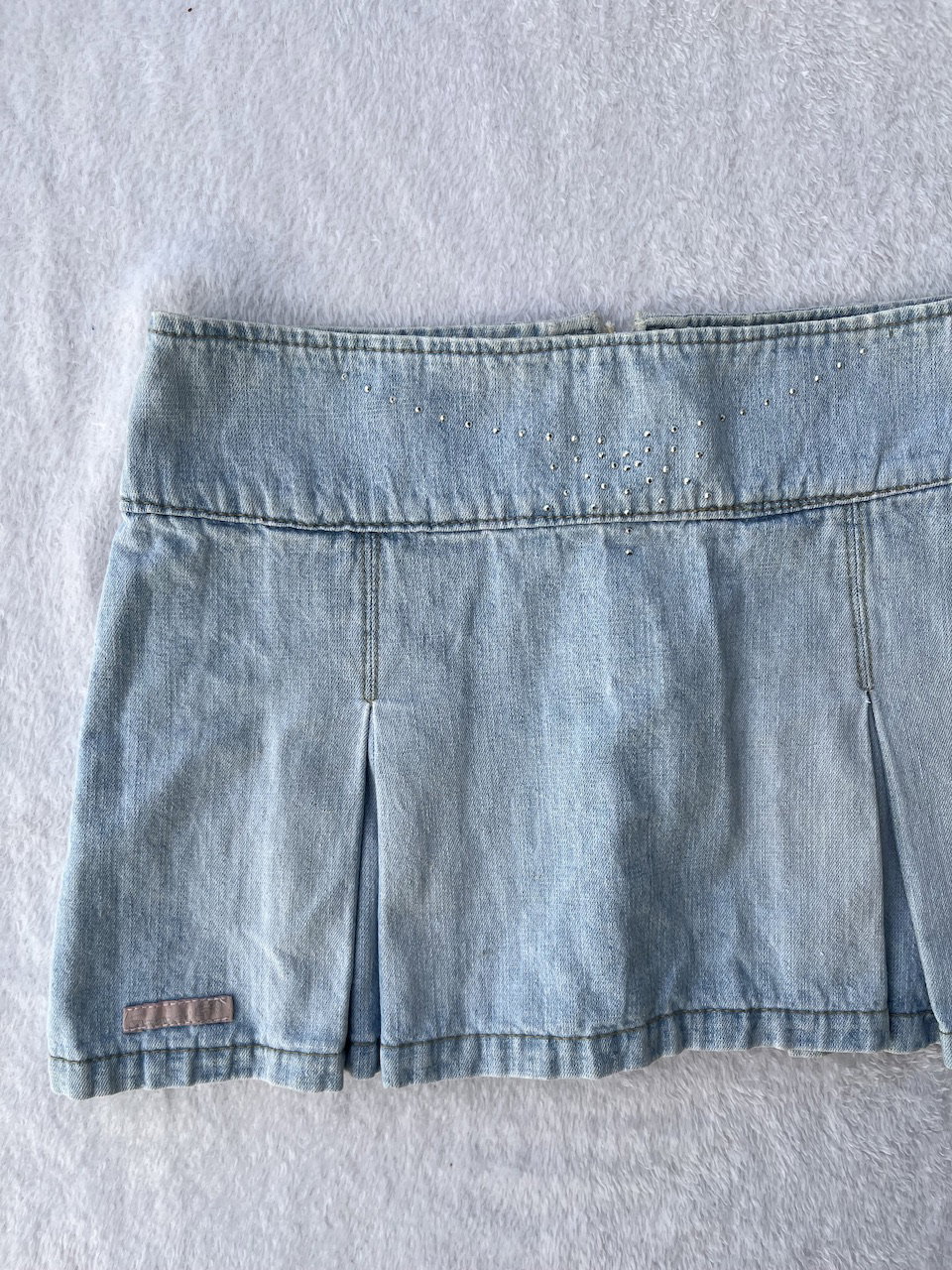 mini de jean original de los 2000s. cuentaa con strass y unas tablitas pro delante. talle 1/34