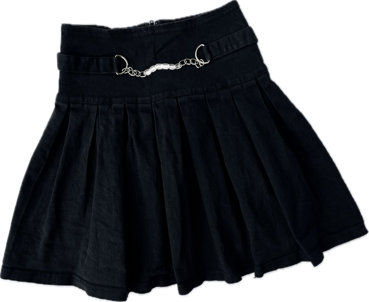mini tableada de jean rígido con aplique de cadena y cintura ajustable
