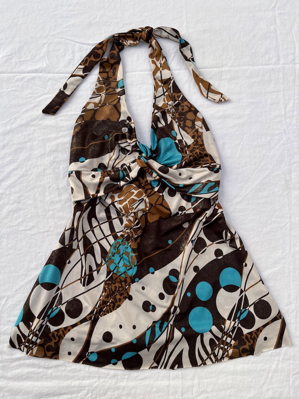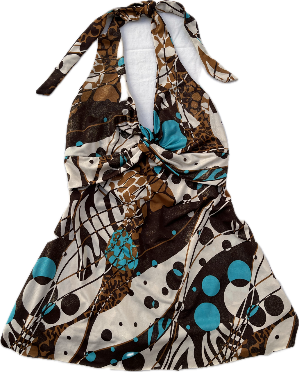 mini vestido original de los 00s. es de espalda descubierta con escote estilo marylin. la tela tiene brillos y es combinada en chocolate y turquesa. talle s/m como nuevo