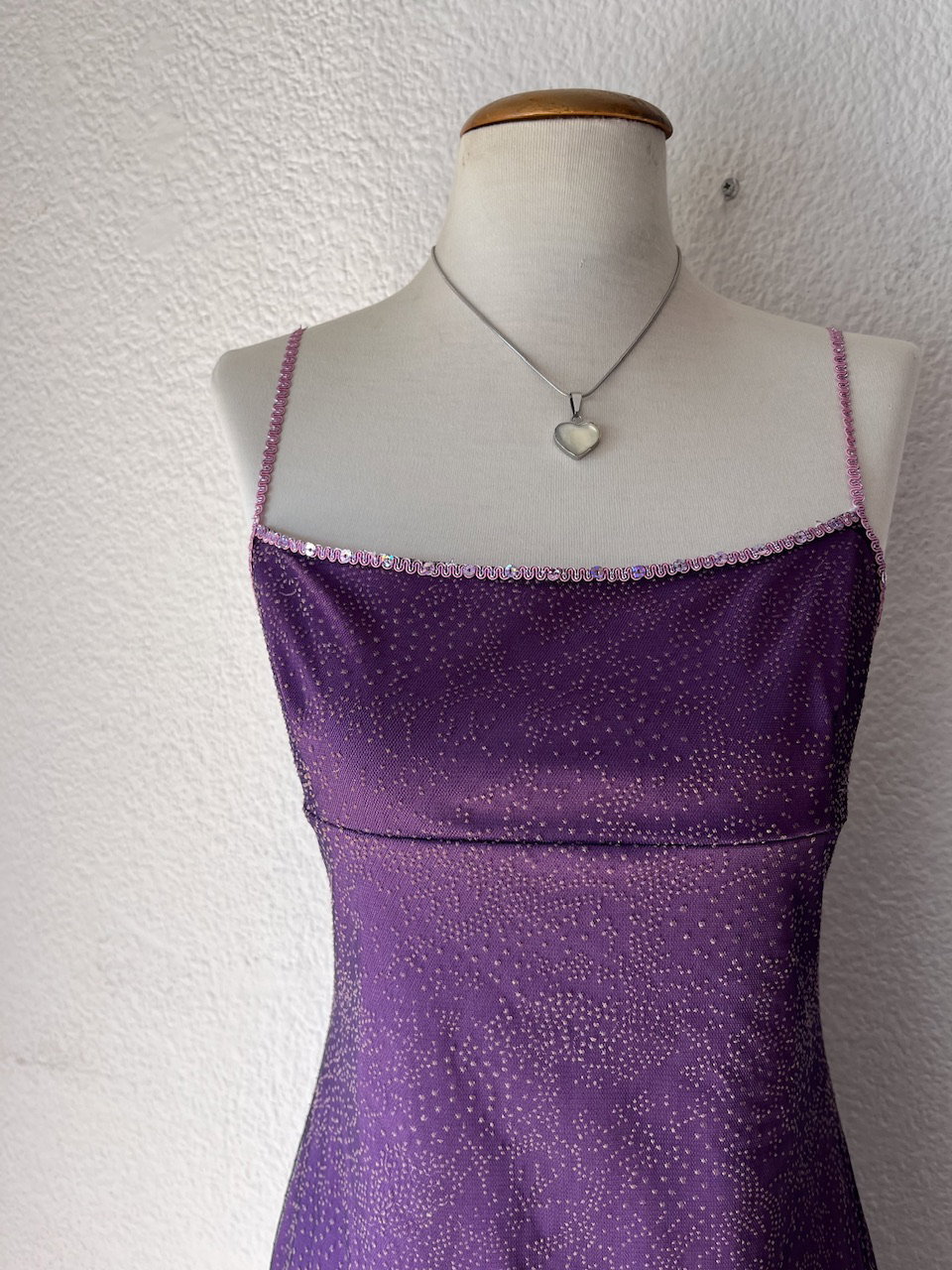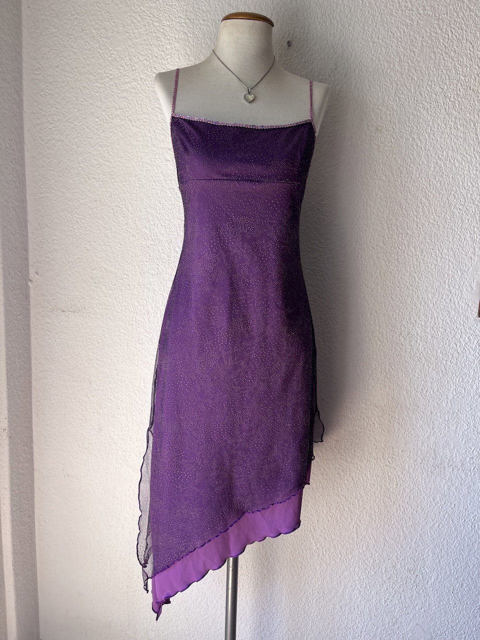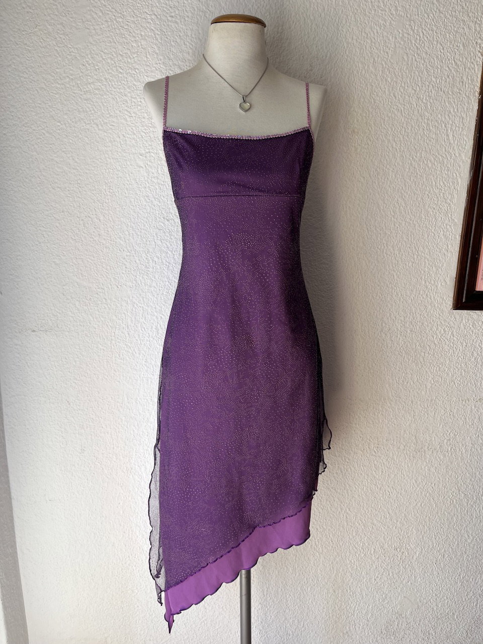 vestido original de los 00s. es asimetrico, escote estilo imperio. tiene guarda de lentejuelas en el busto y breteles. está forrado y por arriba tiene una tela trasparente tipo mesh con pintitas