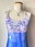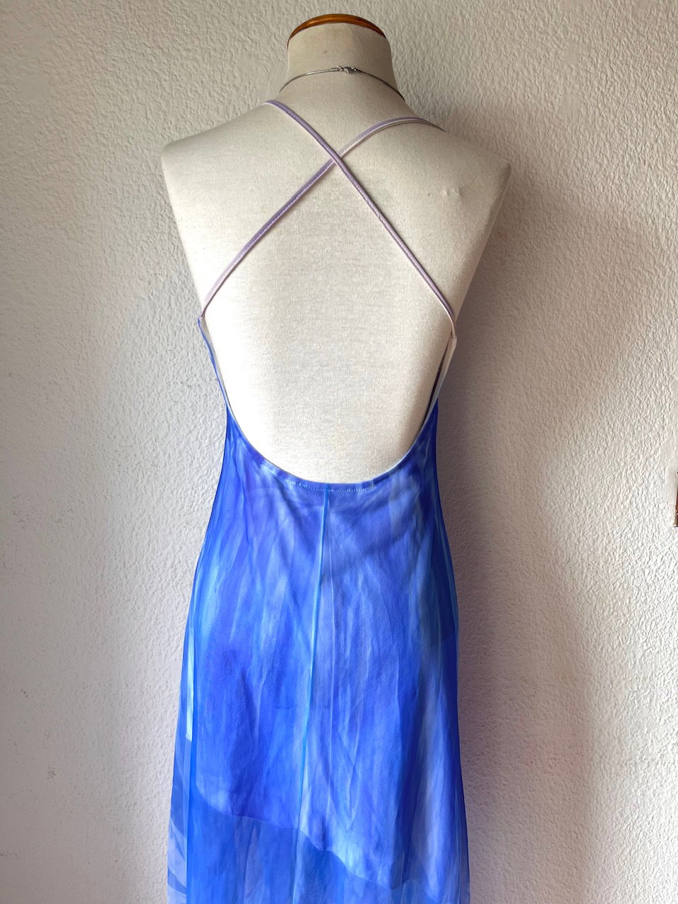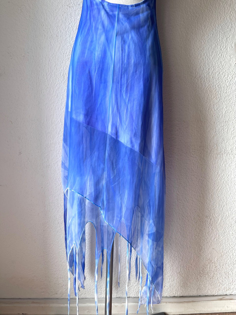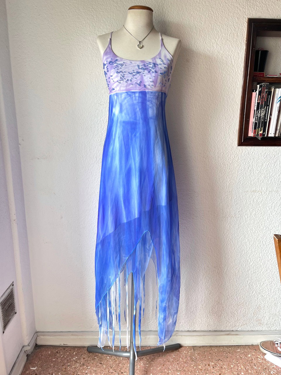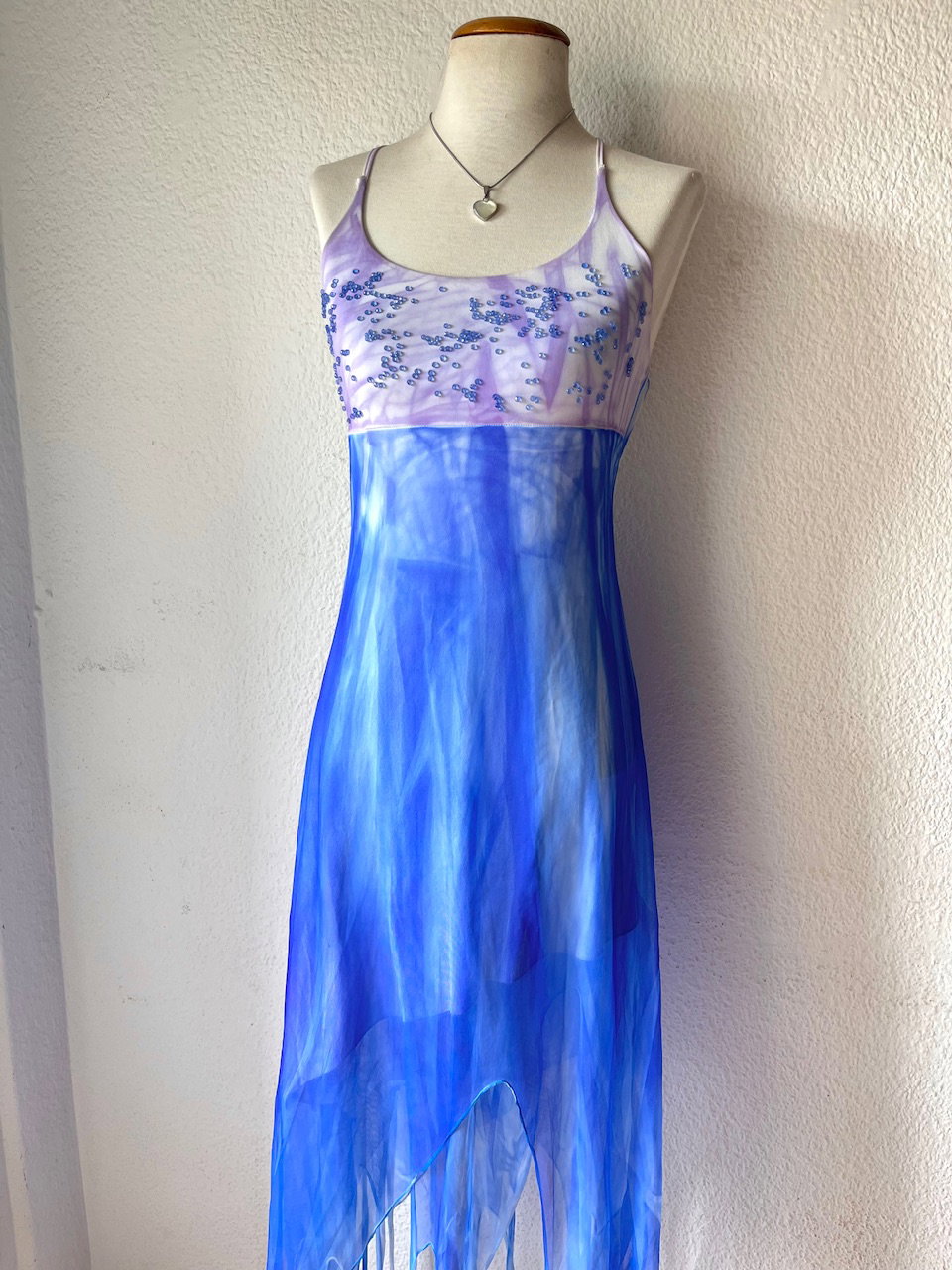maxi dress original de los 00s de corte asimétrico con batik en color azul y lila. con mostacillas. talle xs a m