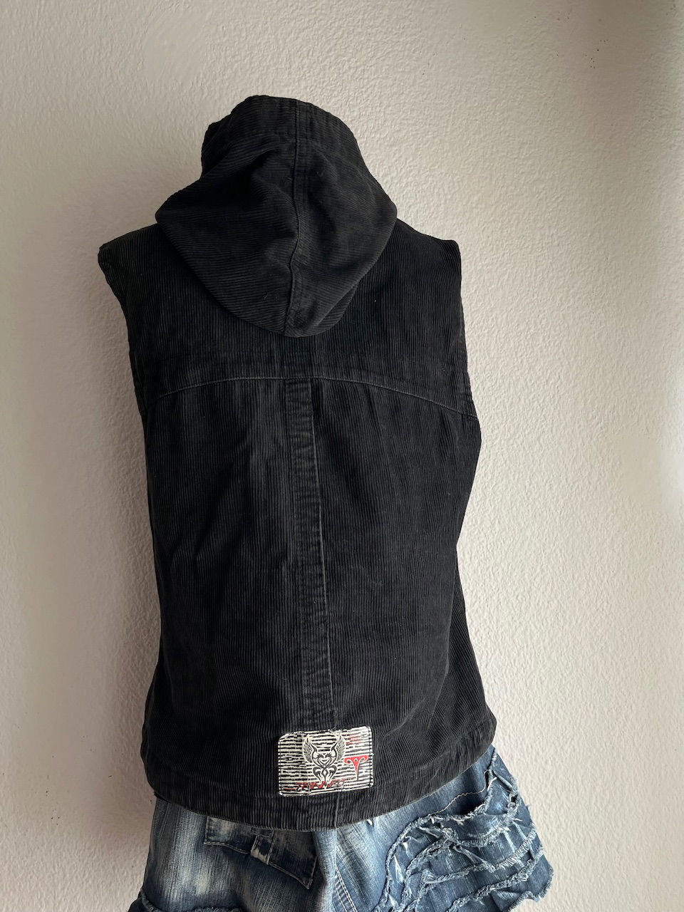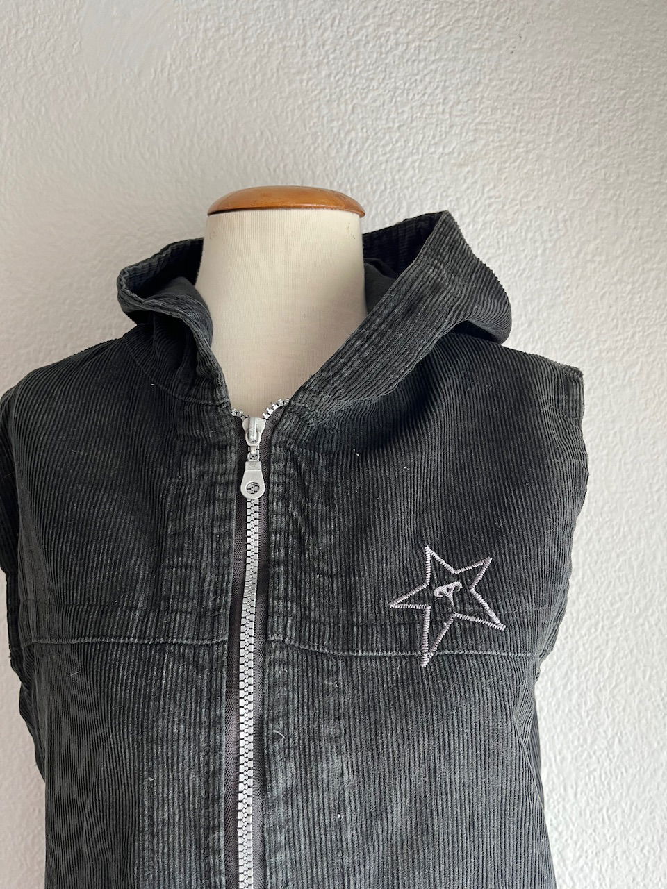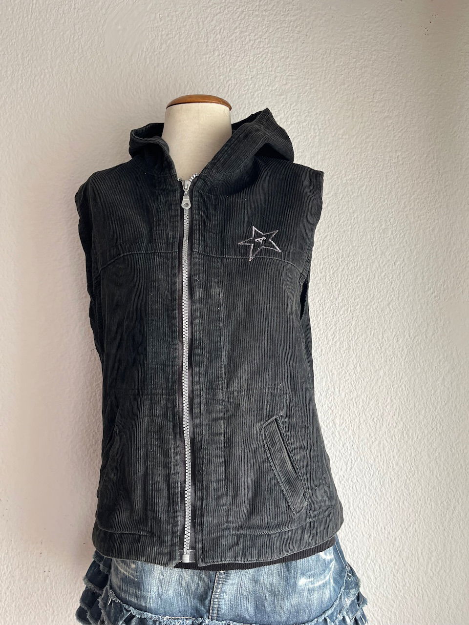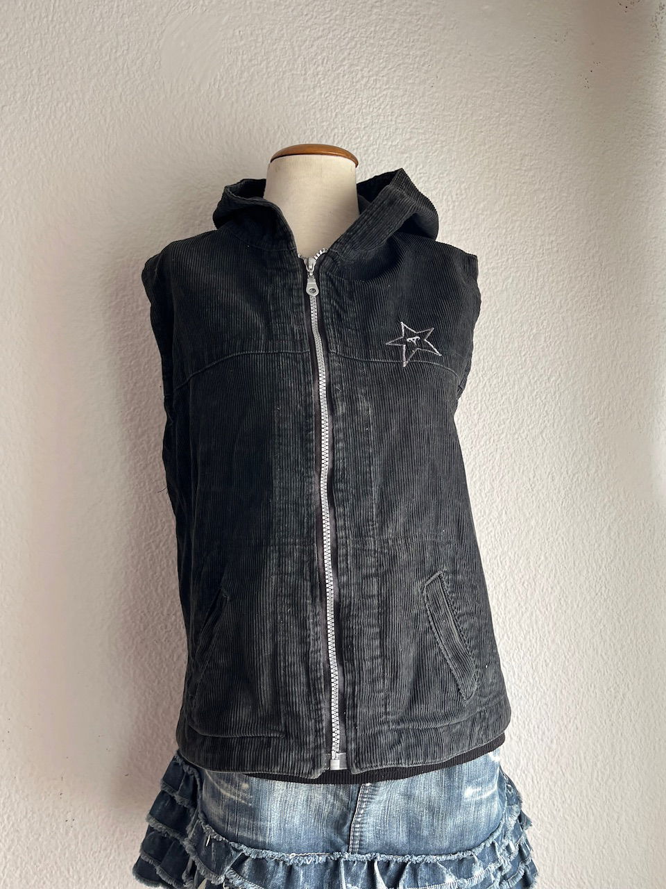 chaleco de corderoy original de los 2000s con capucha y bolsillos. tiene una estrella bordada y es color verde musgo. talle L chico aprox.