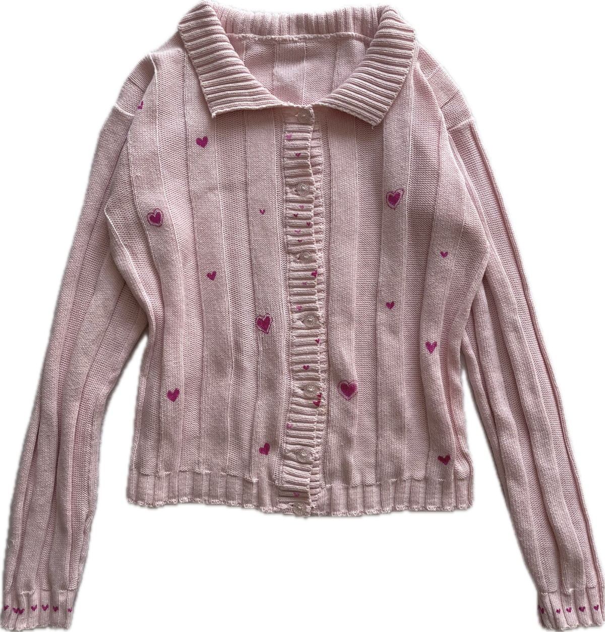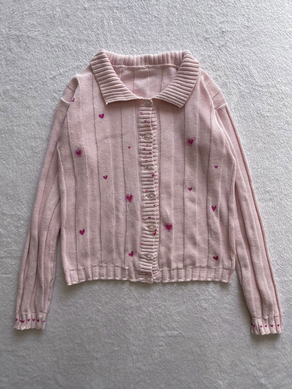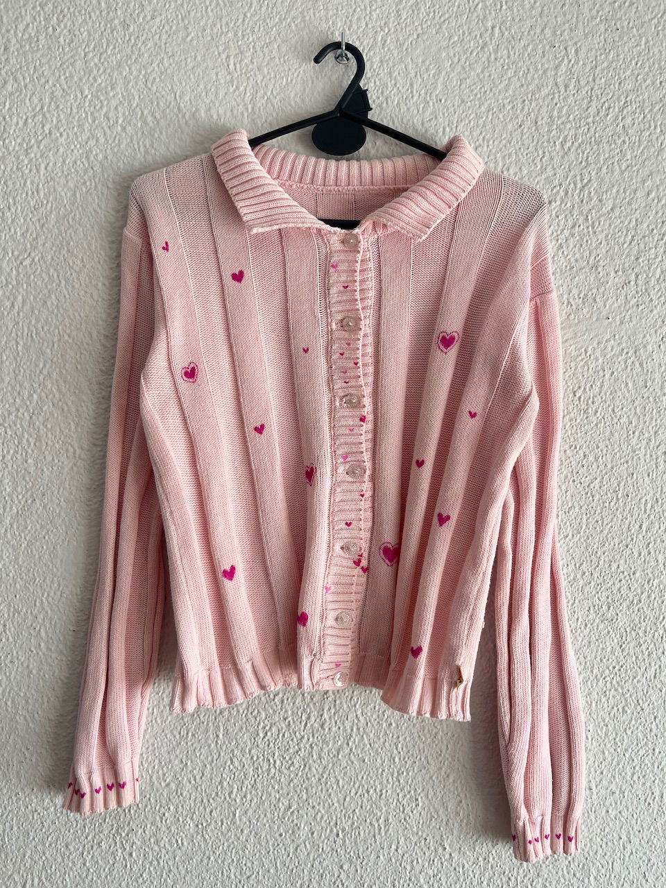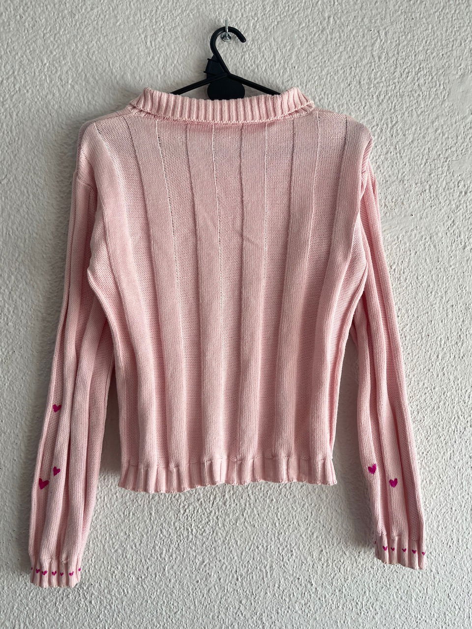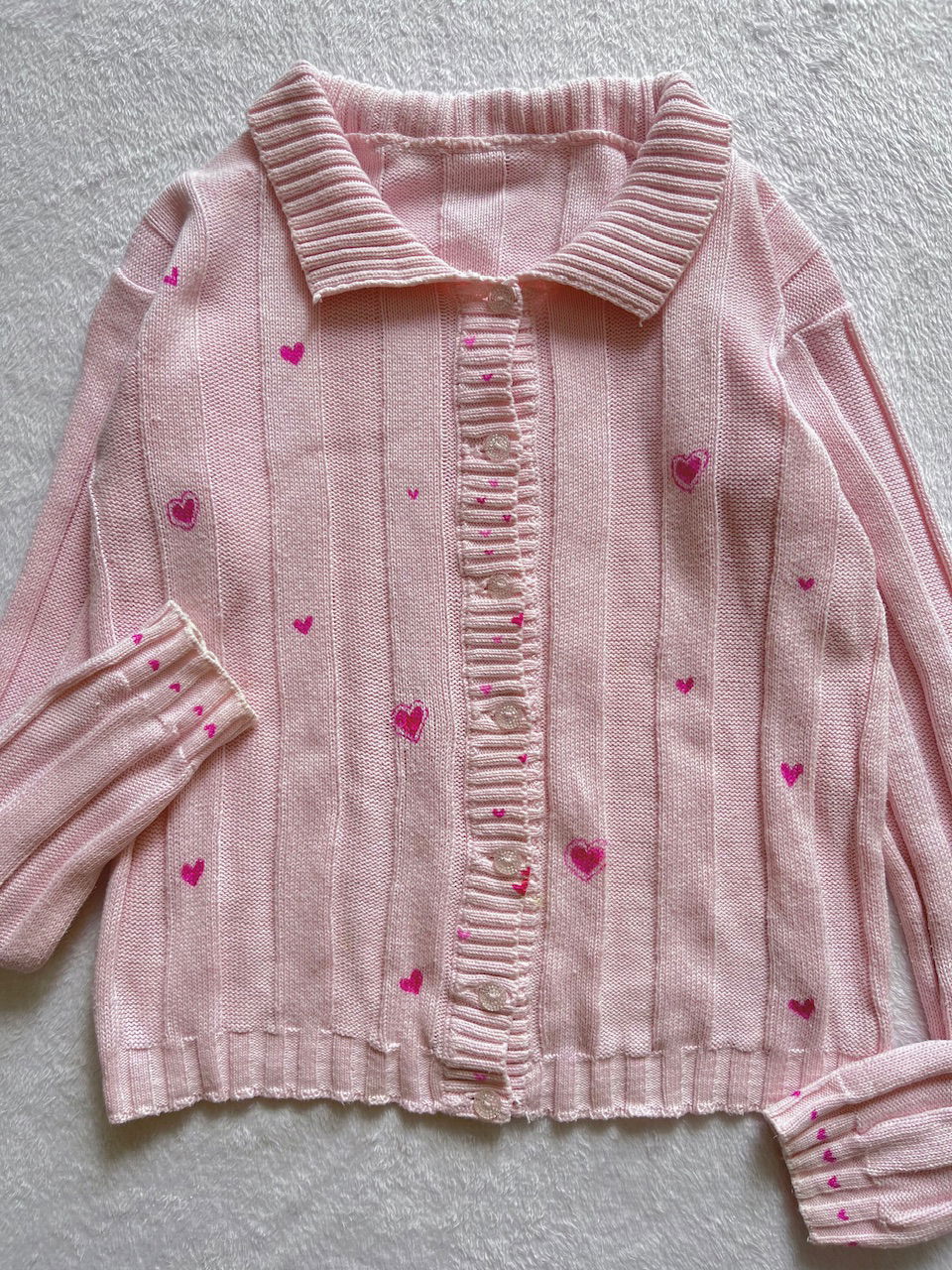 hermoso cárdigan de lana (acrílicos) pintado a mano. cuenta con botones trasparentes con relieve. detalle de cuellito camisero. talle m/L aprox. impecable