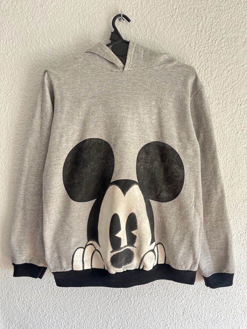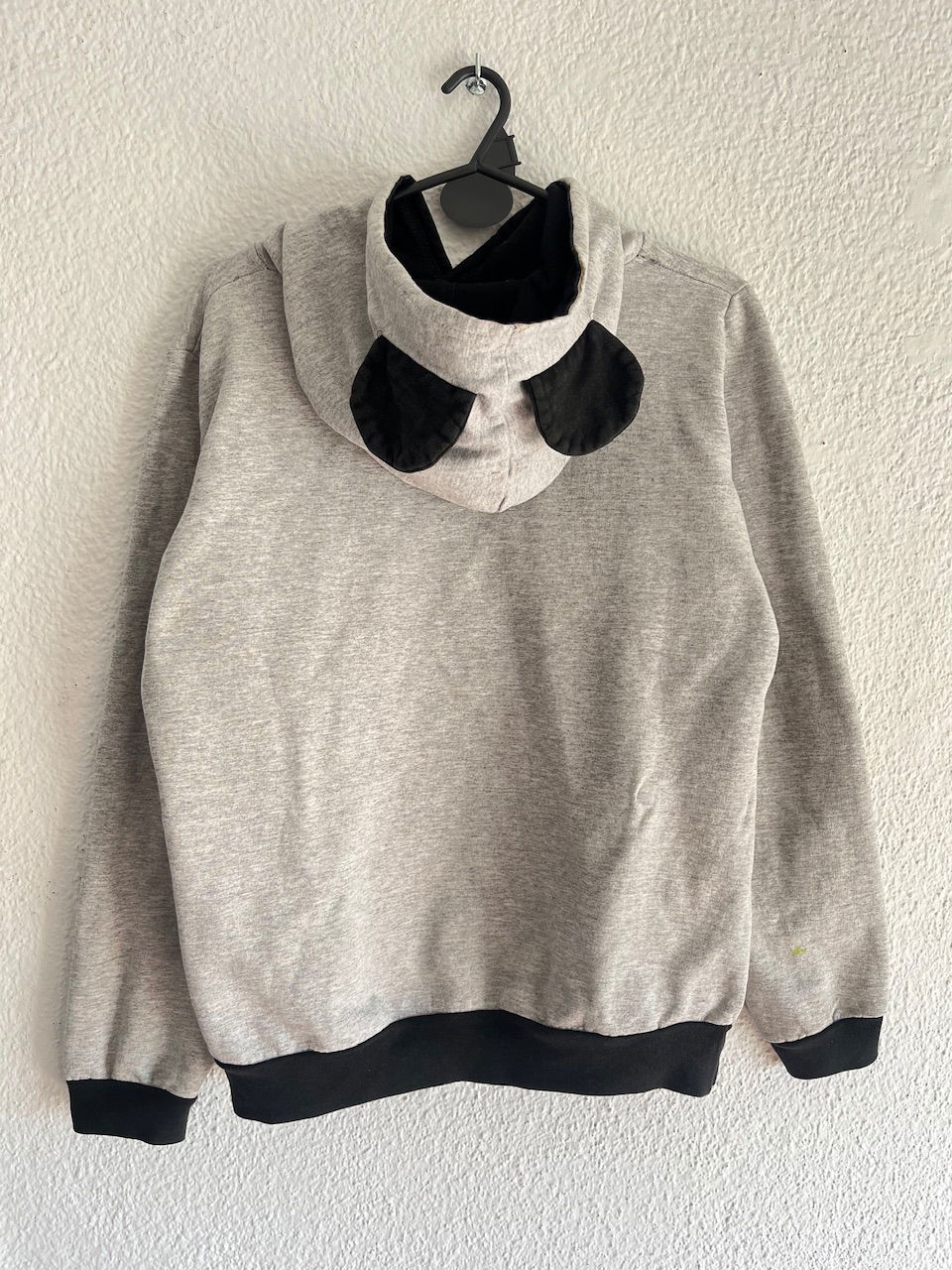 buzo de algodón frizado con capucha con orejitas, estampa en el frente, es larguito. buen estado general pero usado, ver detalles en fotos