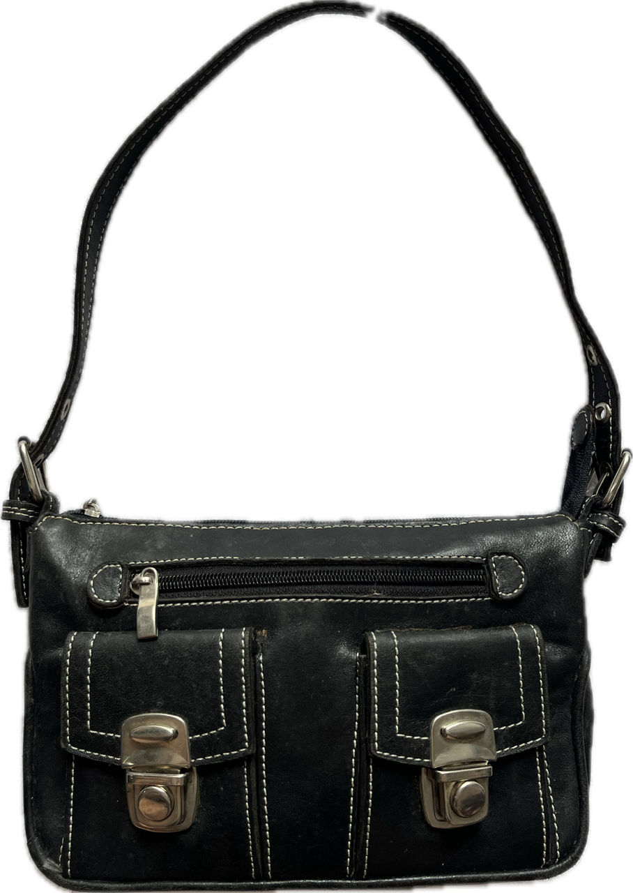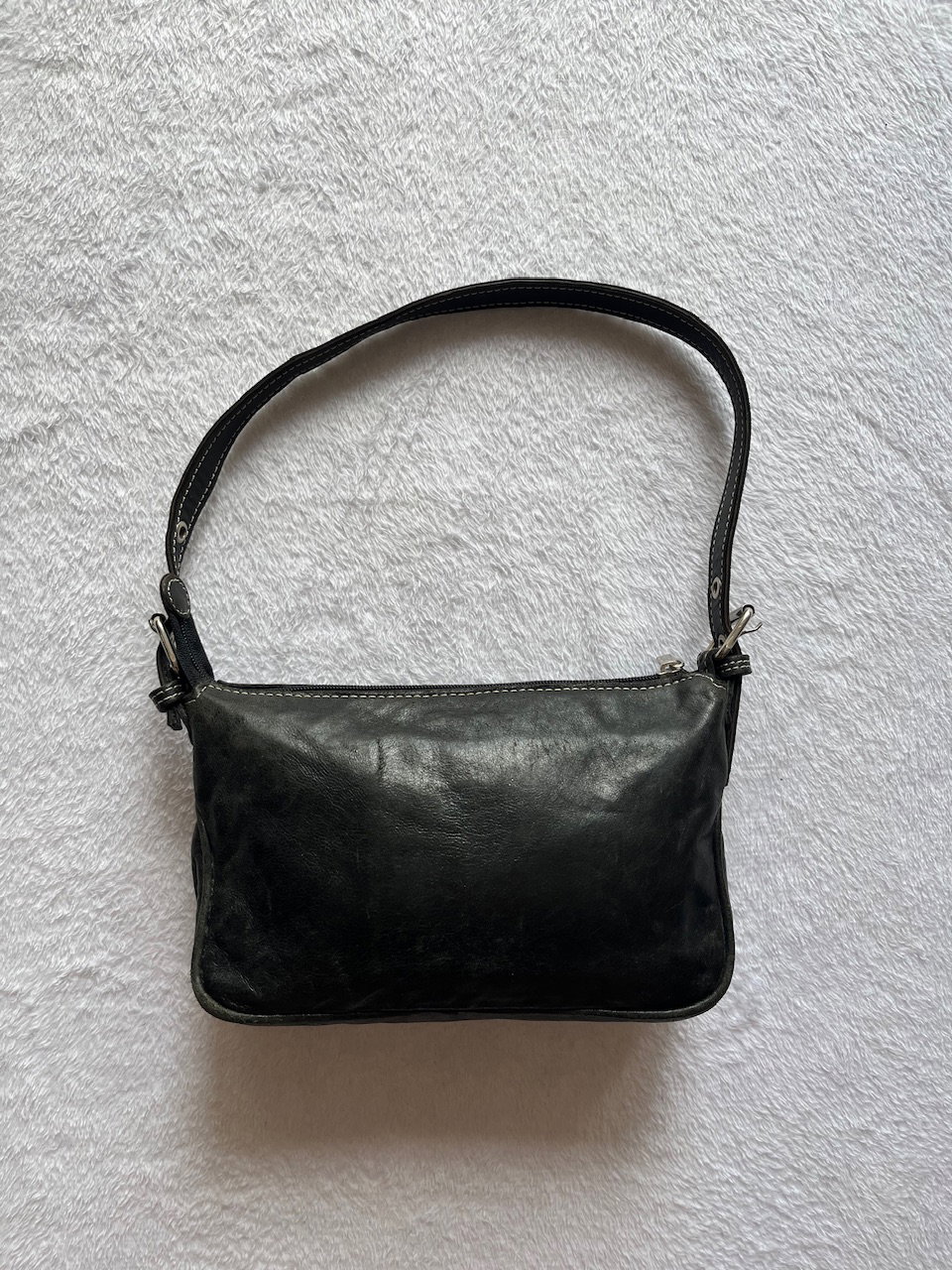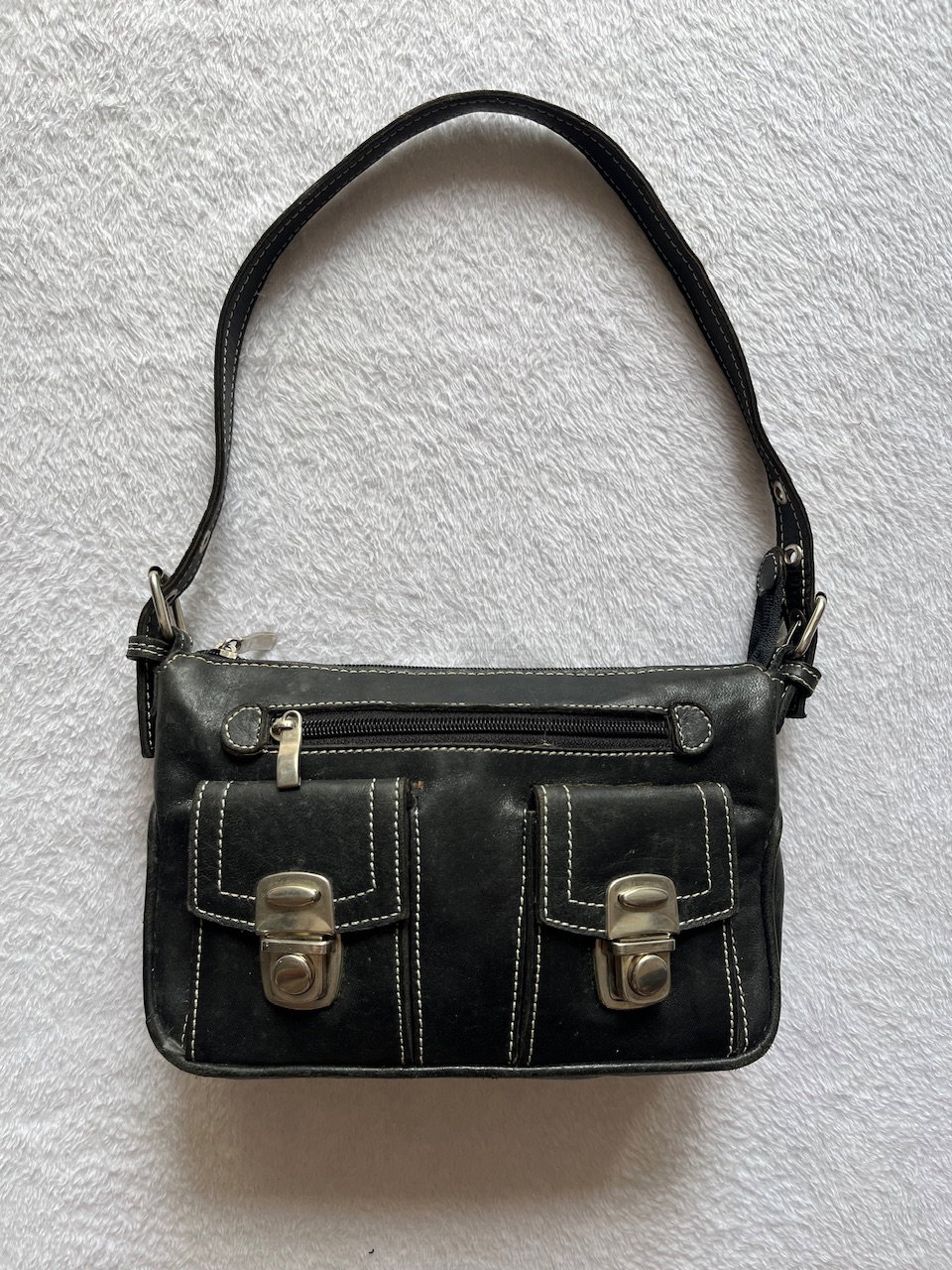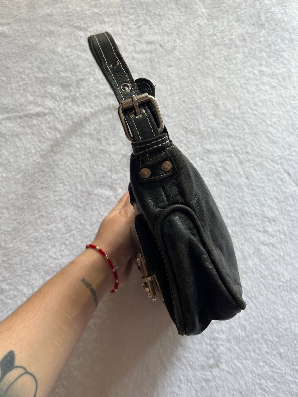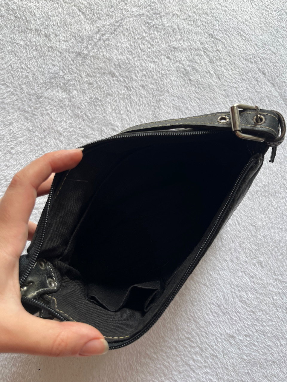 cartera de cuero con correas que simulan ser un cinturón, se pueden regular, tiene dos mini bolsillos funcionales delante y un bolsillo interno. muy buen estado general, ver detalle en la parte delante atras