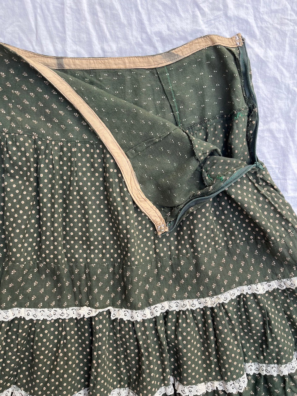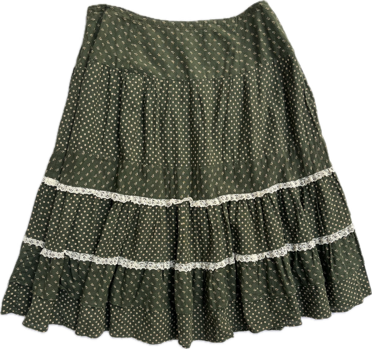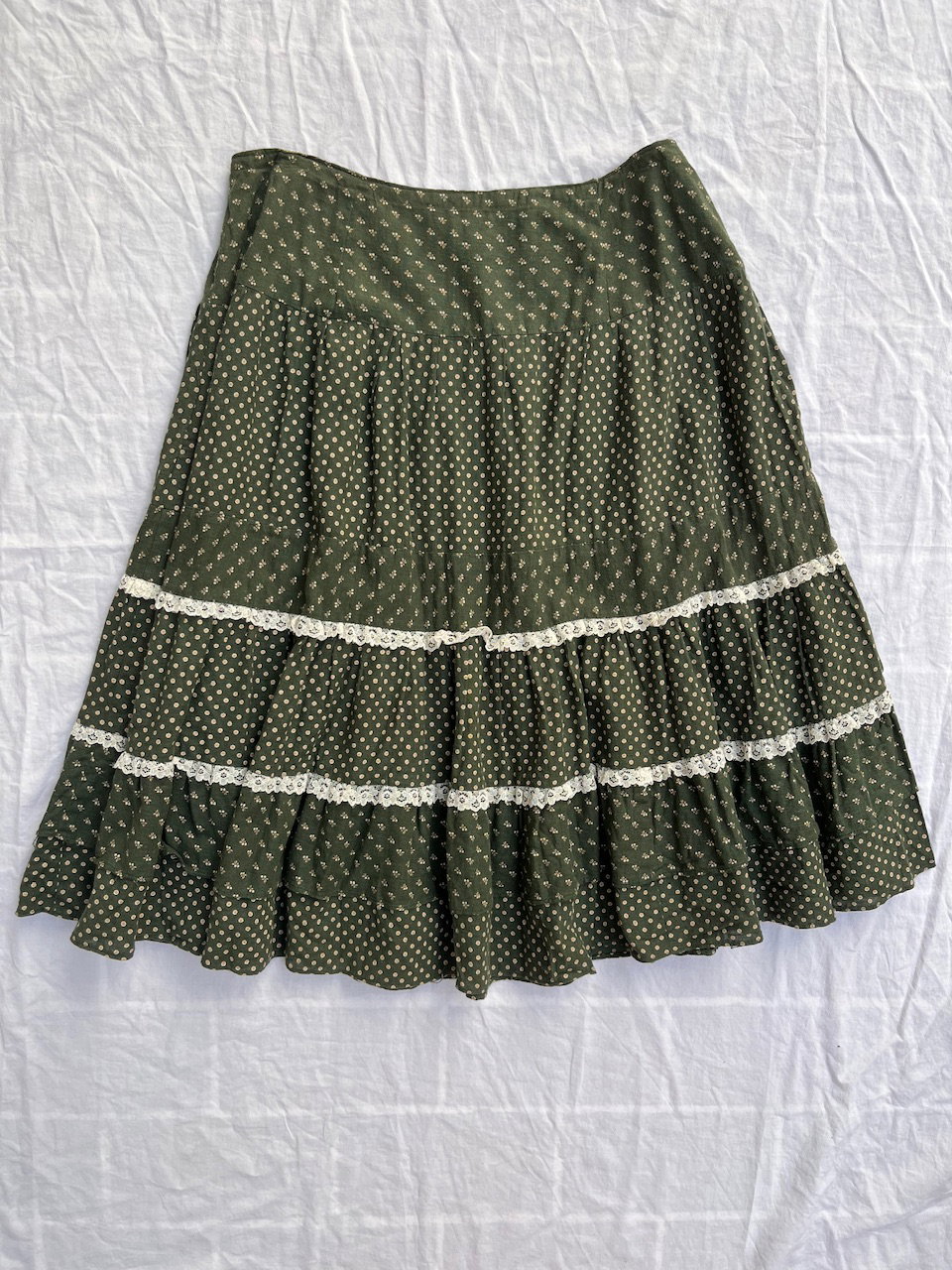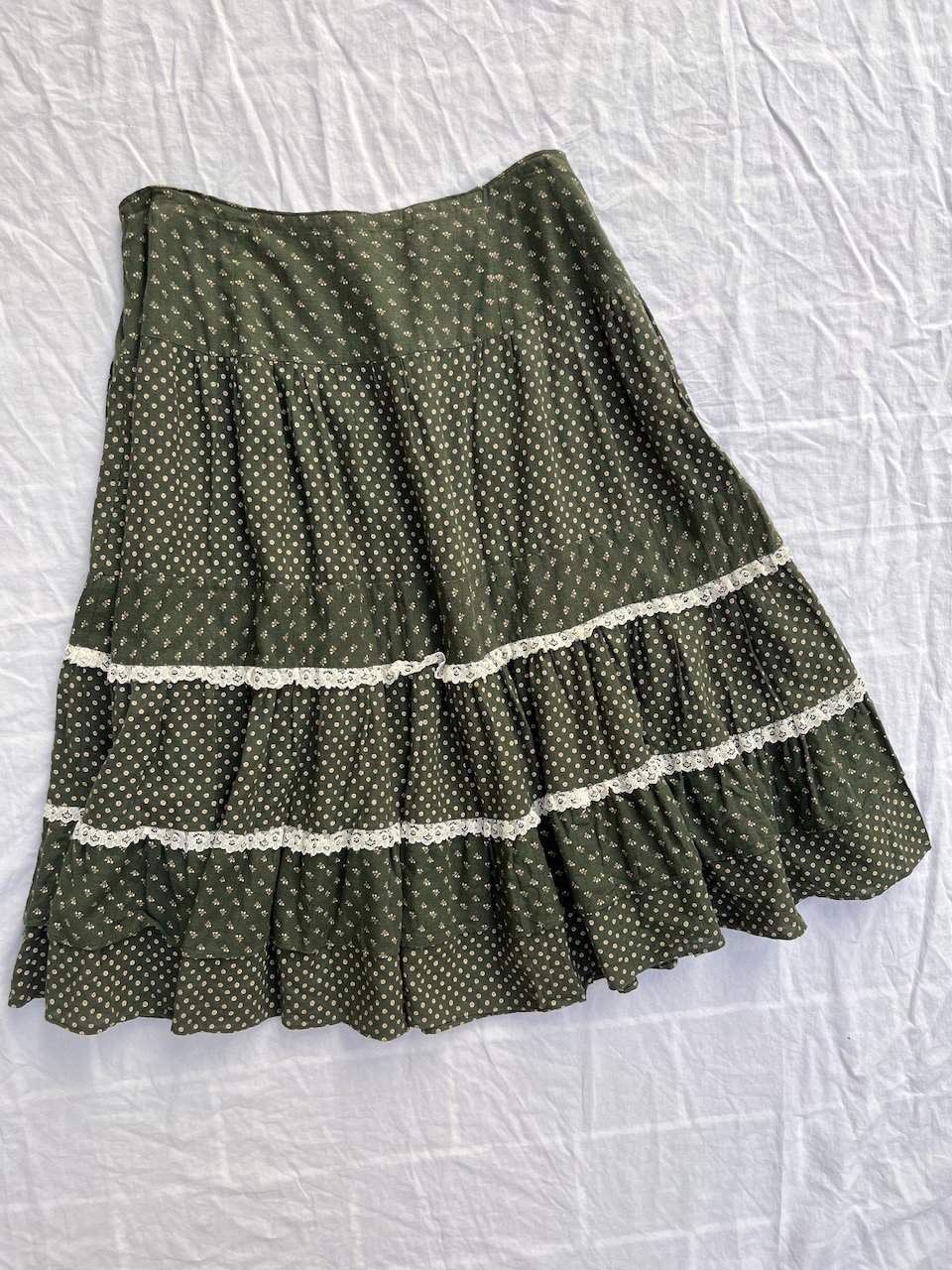 maxi skirt verde estilo paisanita. es de algodón con florecitas estampadas y guarda de broderie. talle 46 aprox