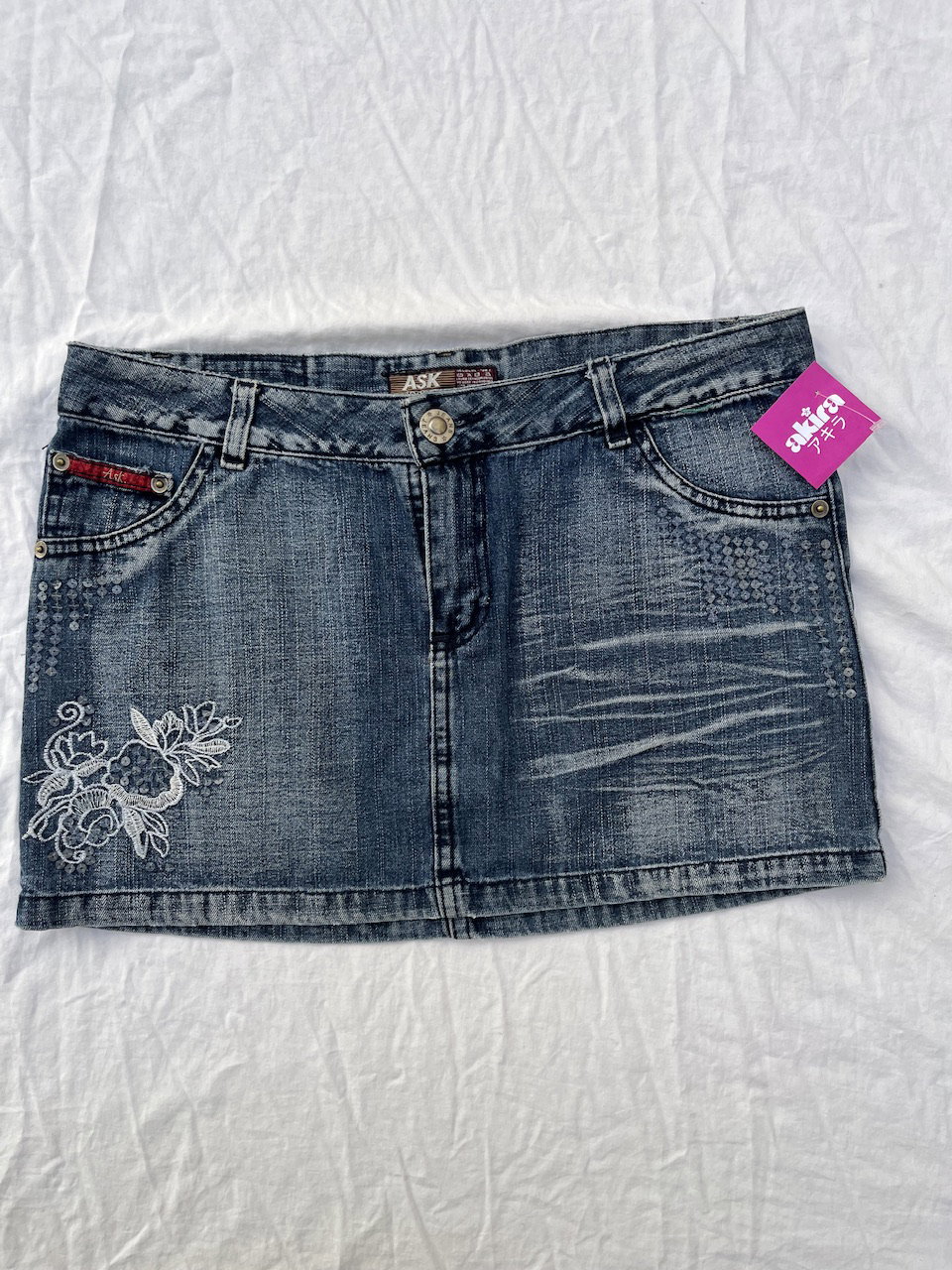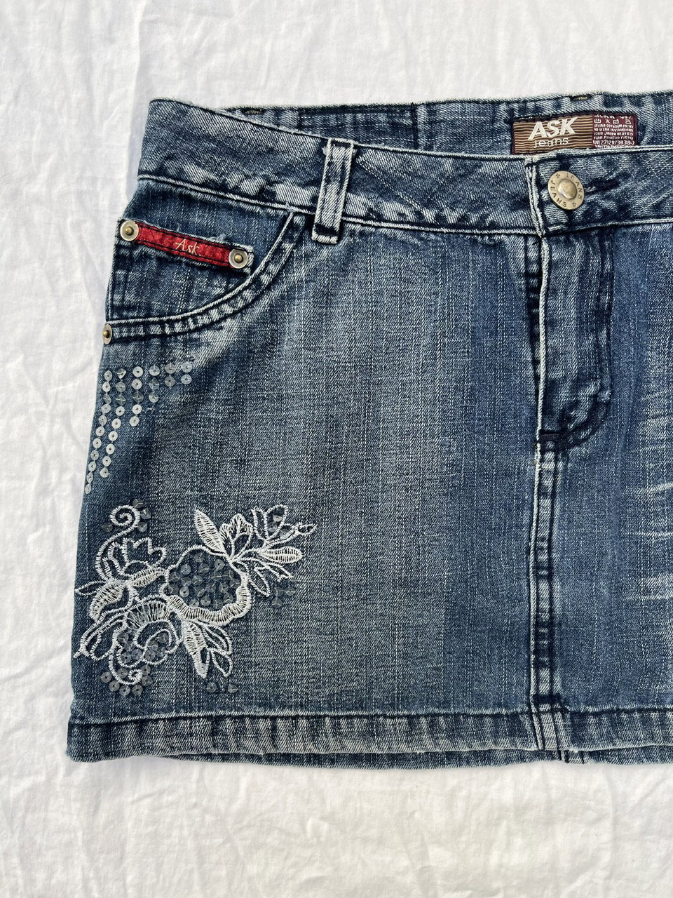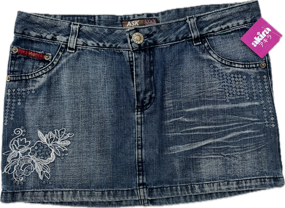 hermosa mini de jean original de los 00s - con bordados y apliques, aprox talle 40