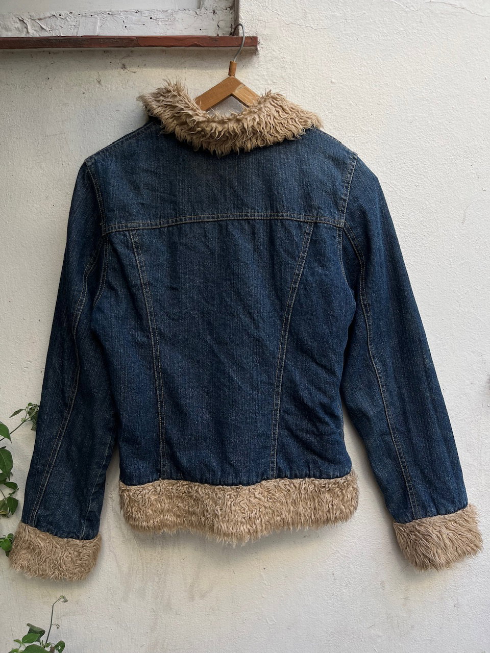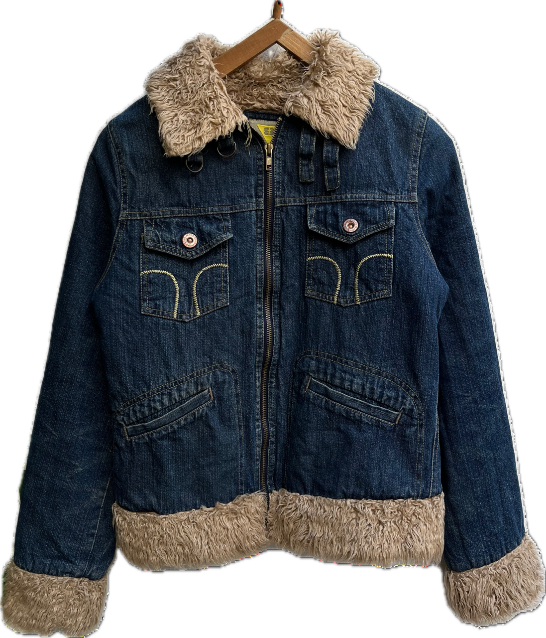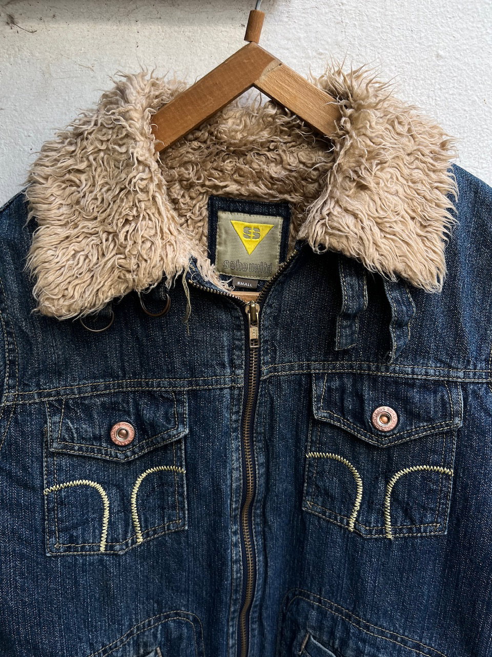 campera de jean original soho de inicios de los 00s. se encuentra en impecable estado, es un estilo penny lane con pelitos en puños y terminaciones. cuenta con cuello tipo mao o motociclista