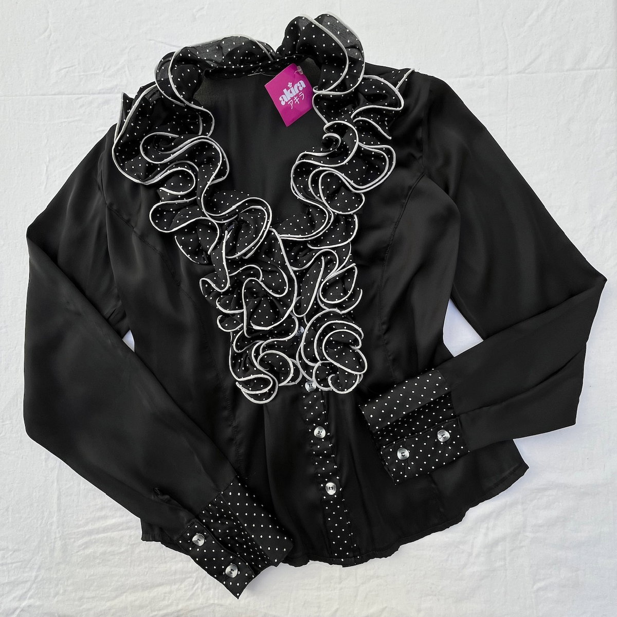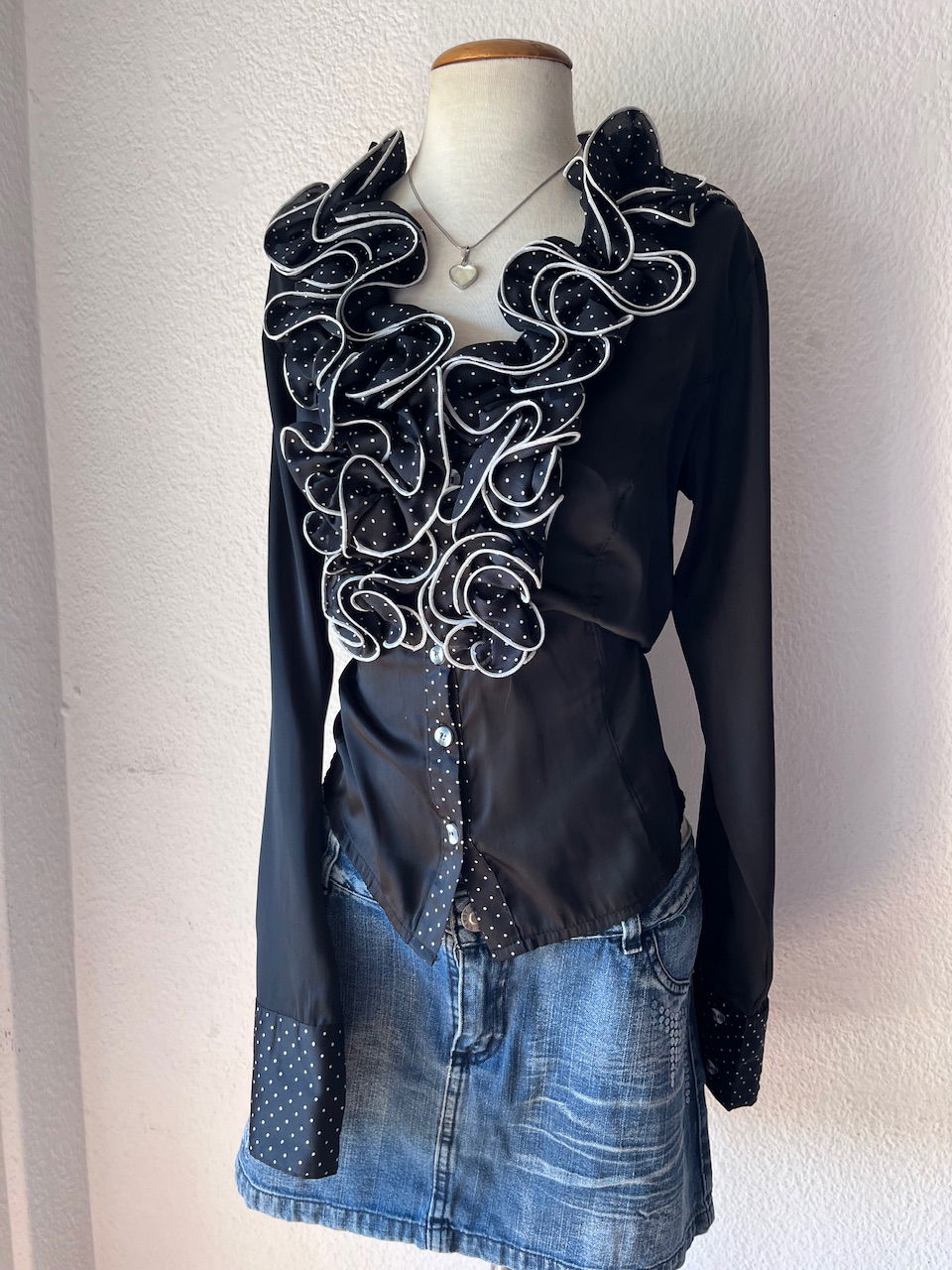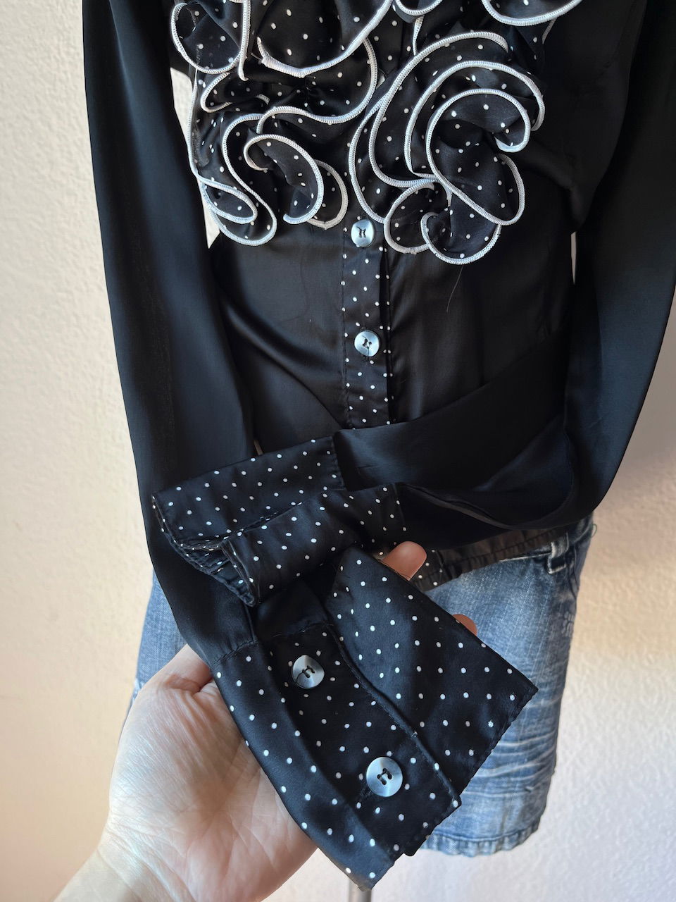 increíble camisa de raso con bolados en blanco y negro con botones a juego. excelente sastrería. talle m aprox
