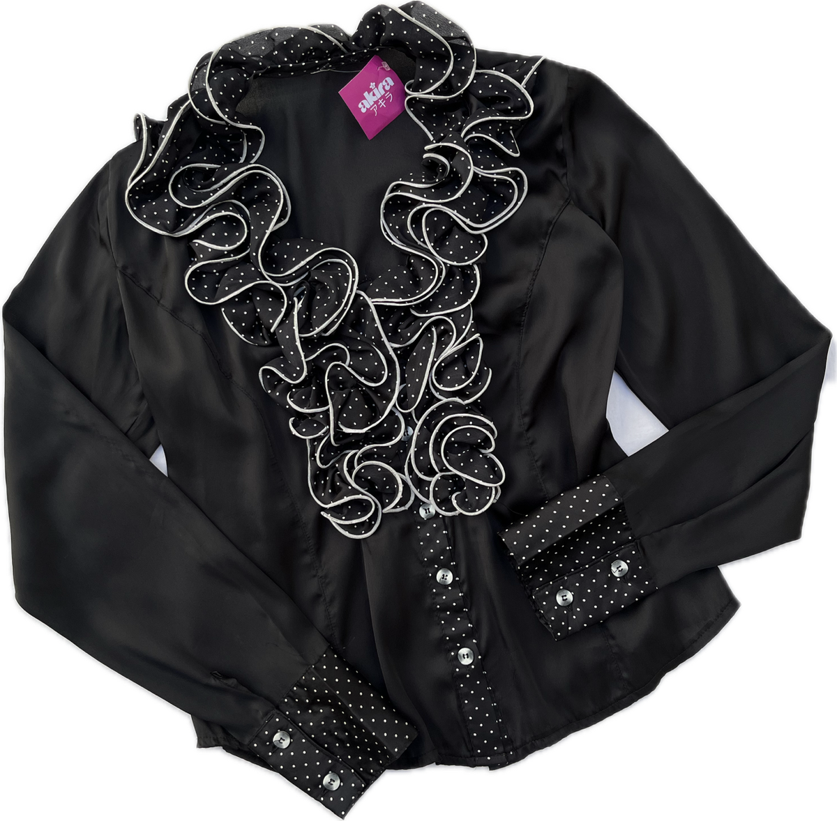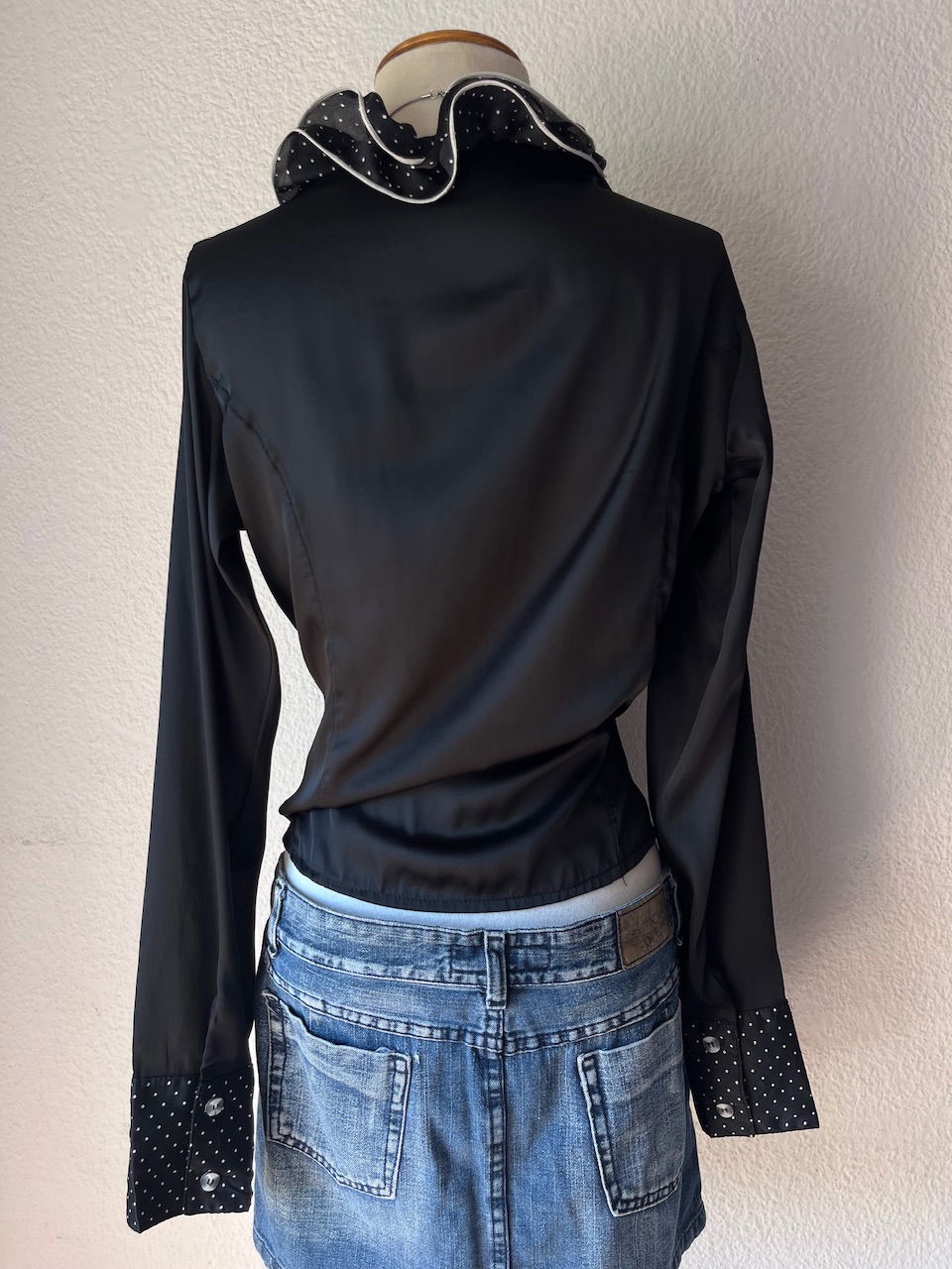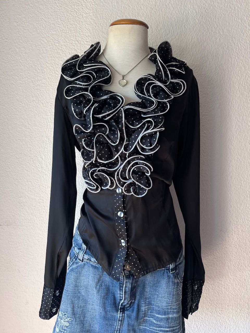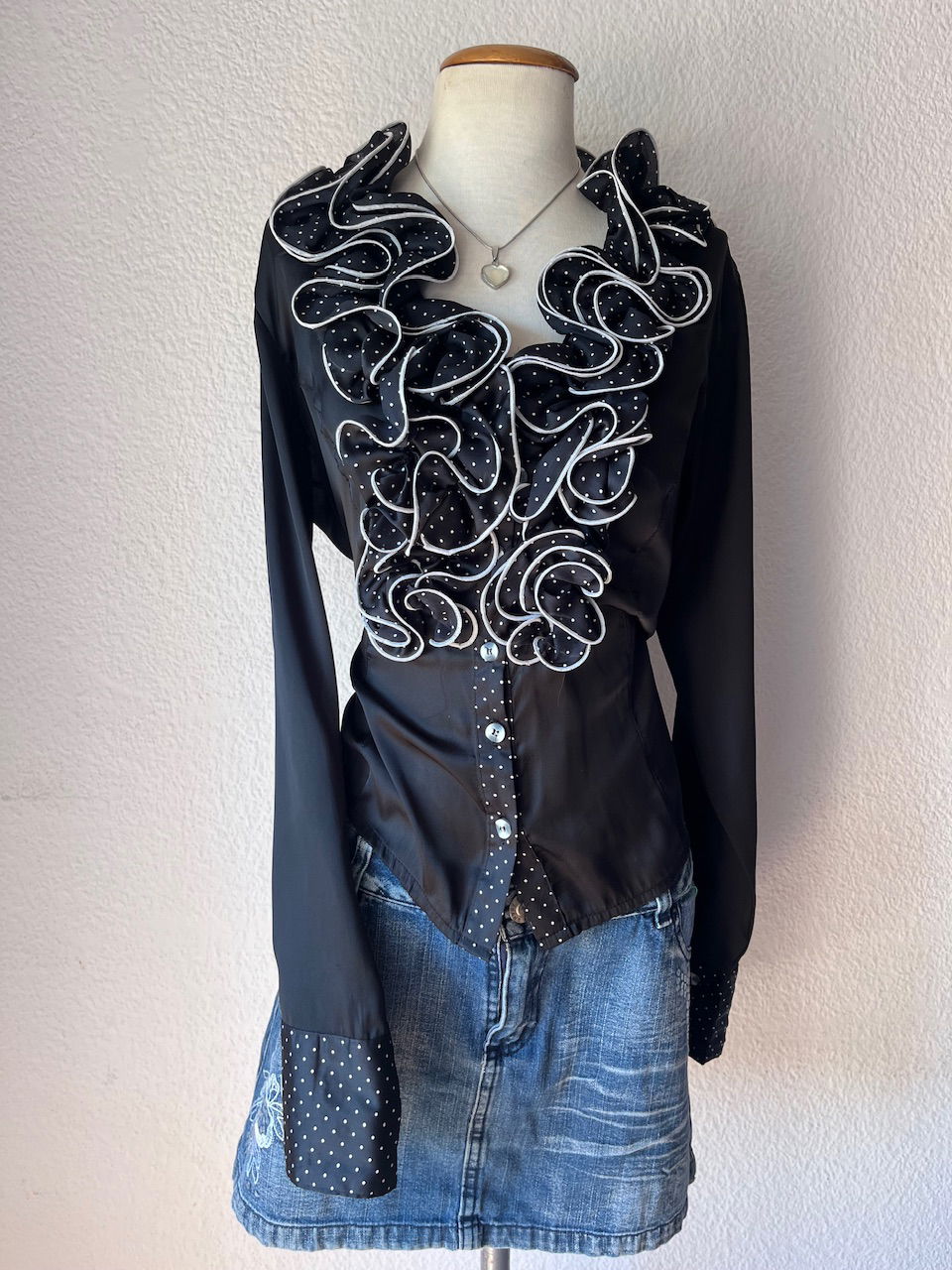 increíble camisa de raso con bolados en blanco y negro con botones a juego. excelente sastrería. talle m aprox