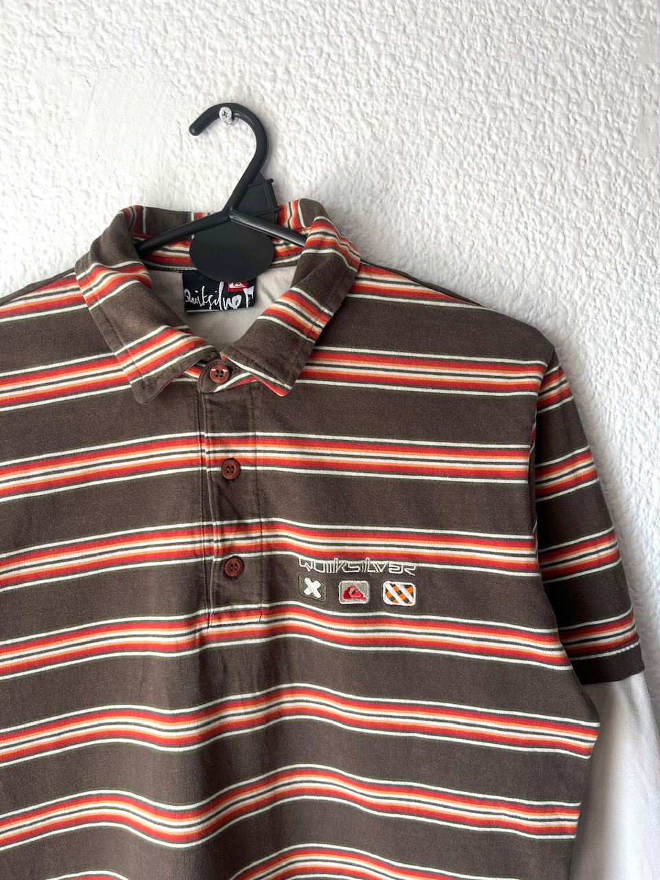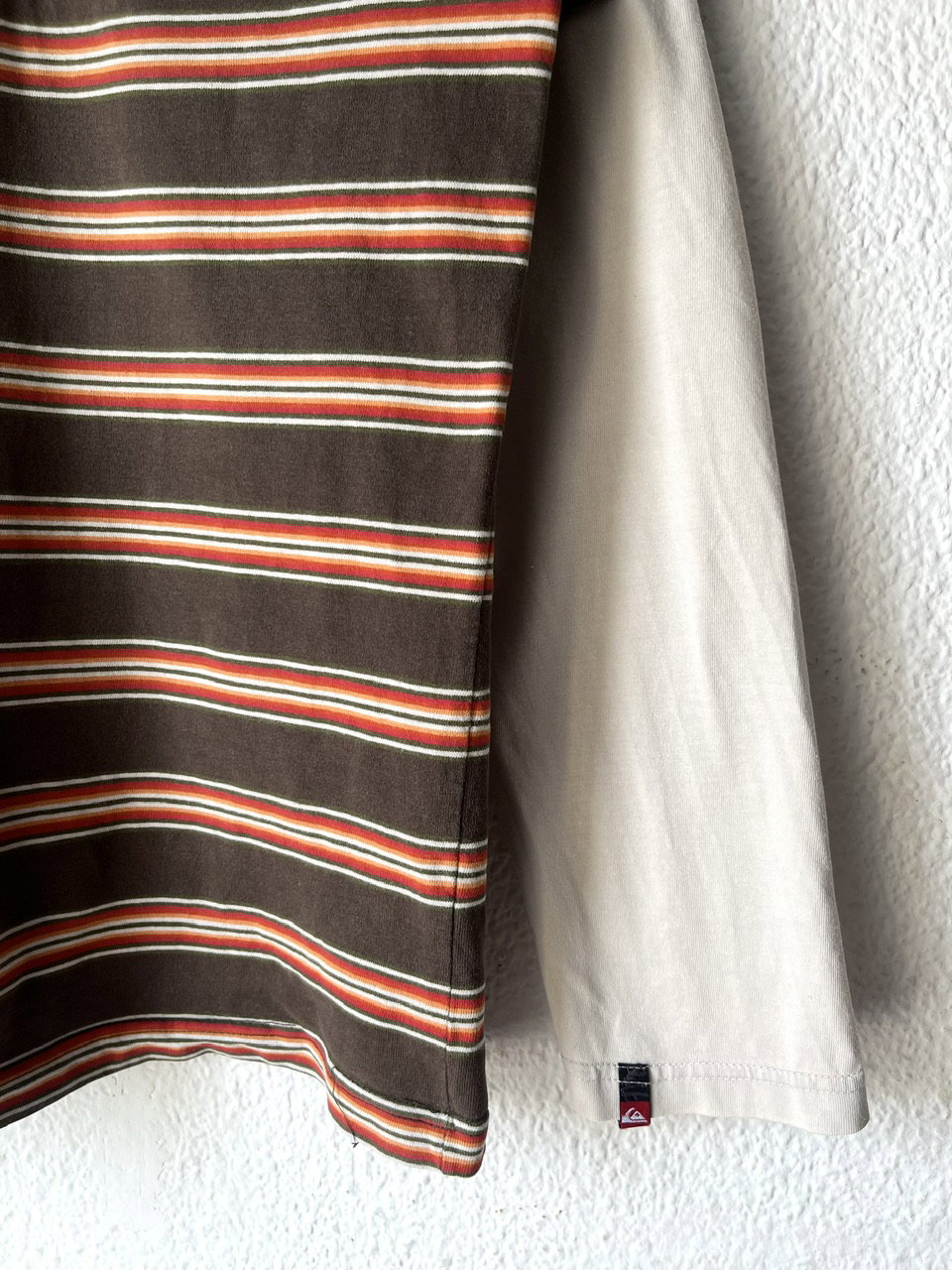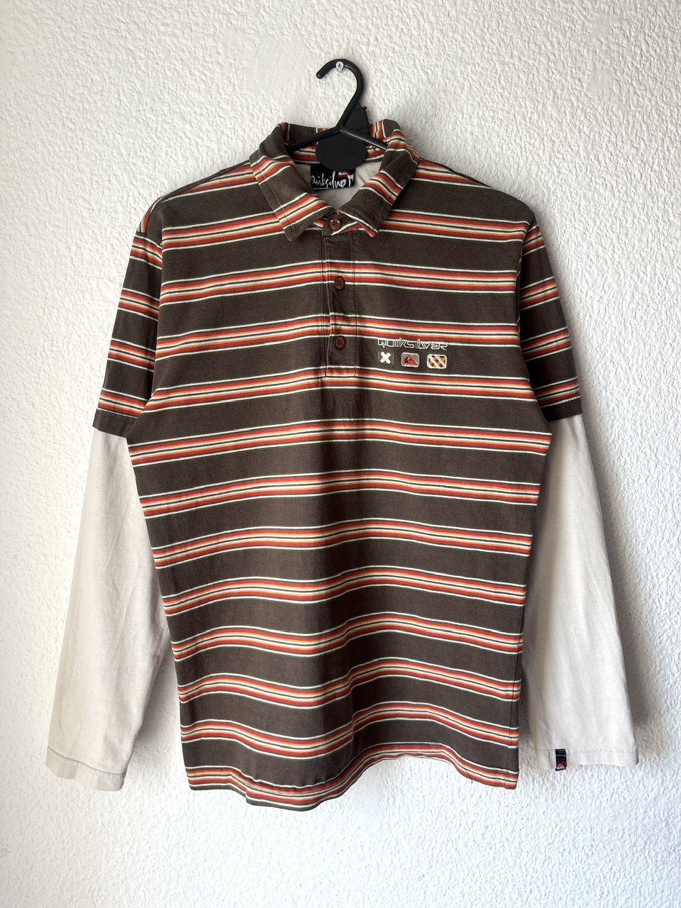 tee iconica quicksilver estilo chomba con mangas largas en contraste. 100% algodón. original de inicios de los 2000s. ver único detalle en un puño atras