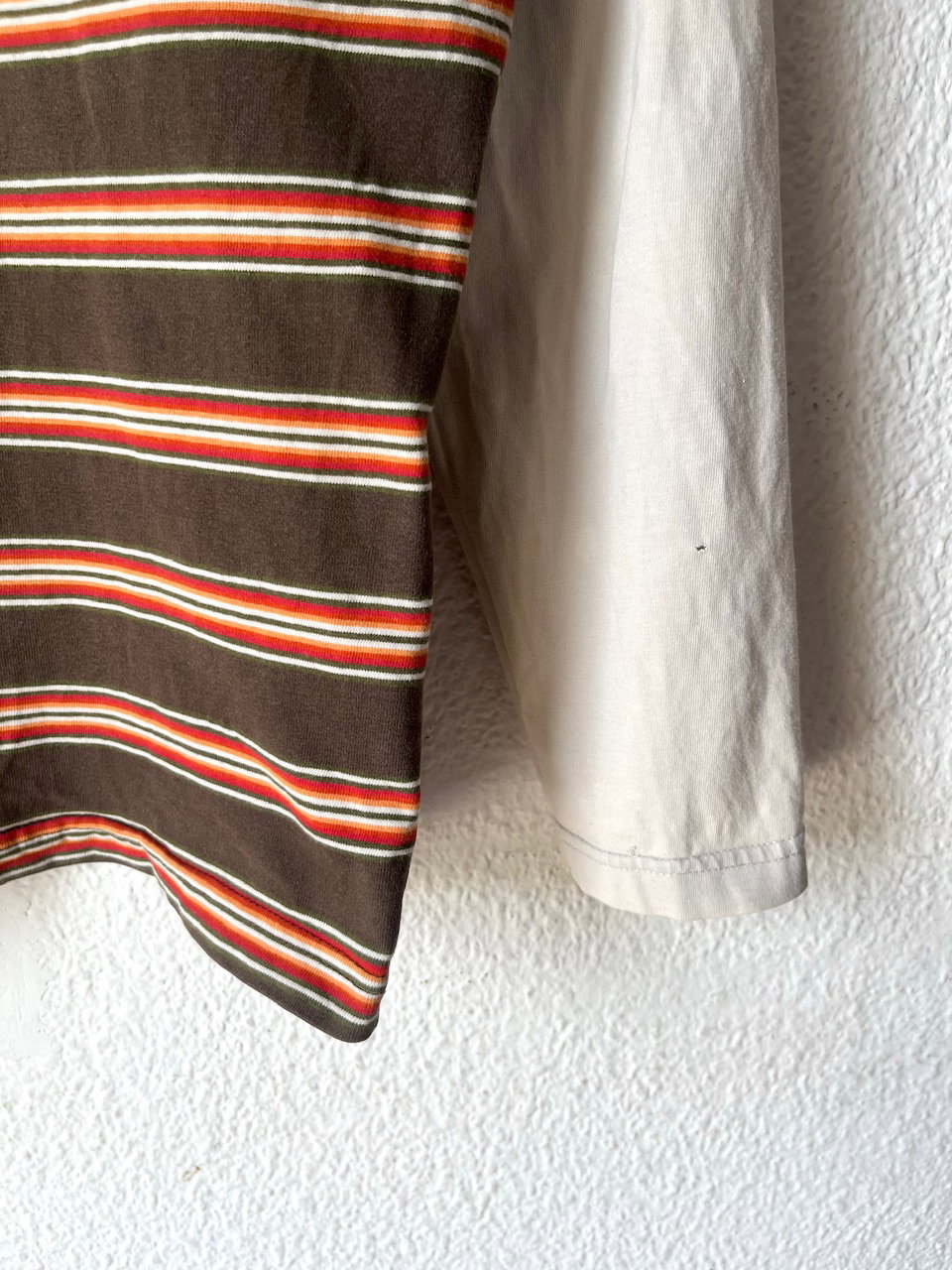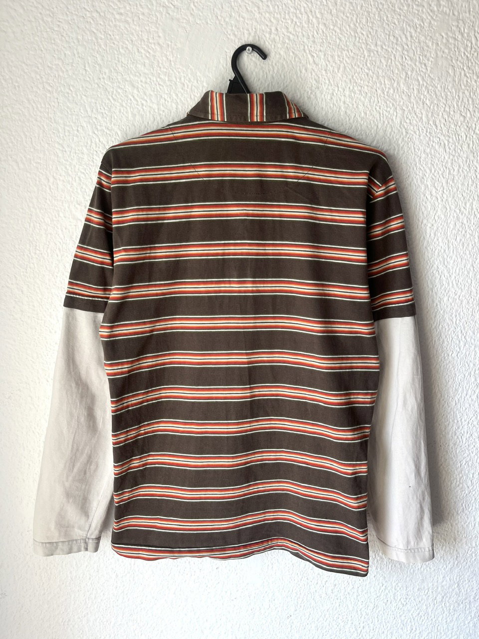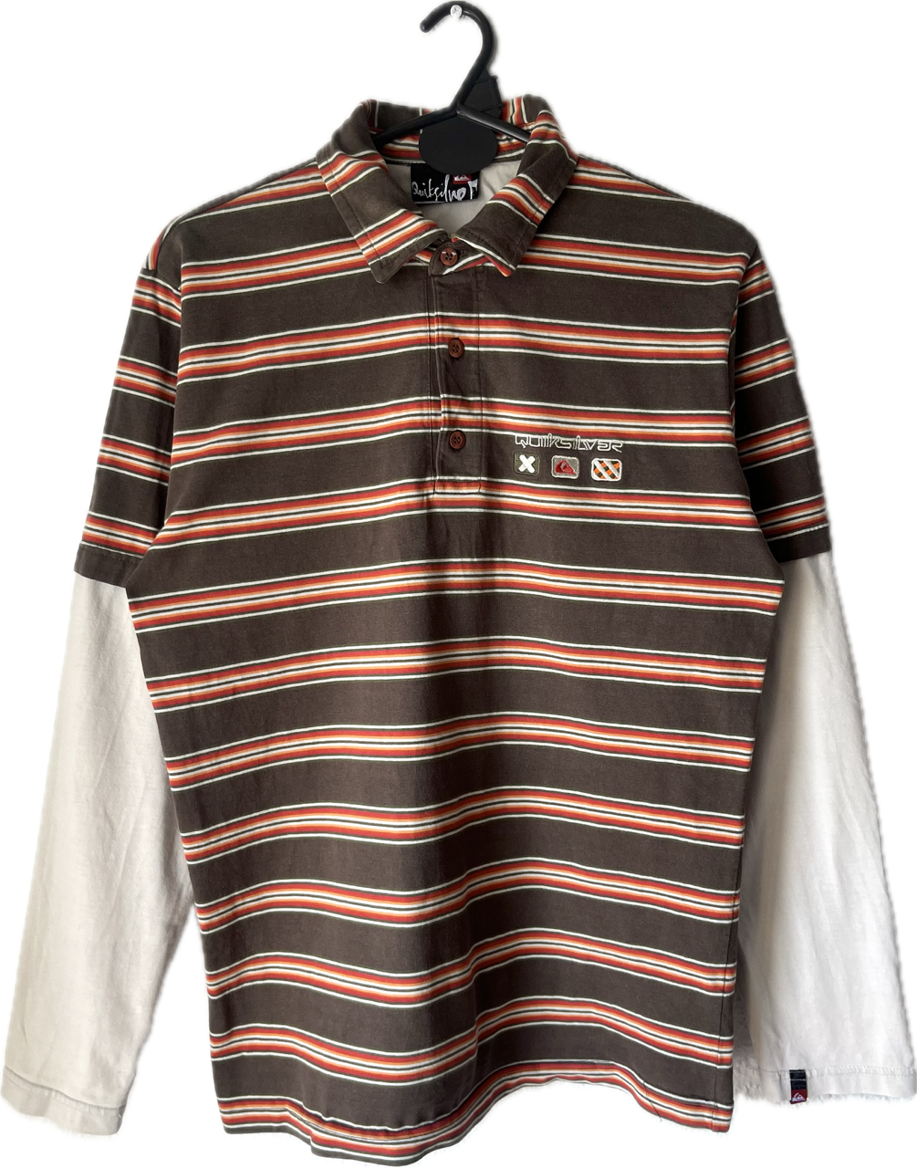 tee iconica quicksilver estilo chomba con mangas largas en contraste. 100% algodón. original de inicios de los 2000s. ver único detalle en un puño atras