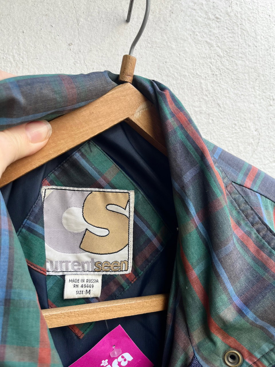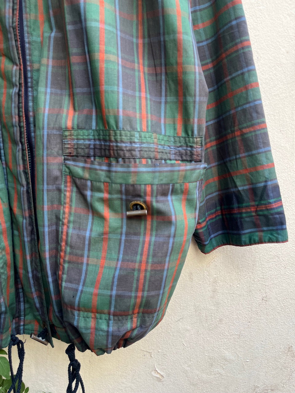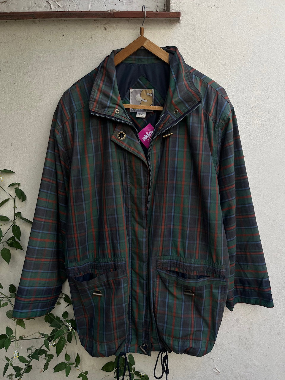 rompevientos original de los 90s en estampado tartán con doble cierre y varios bolsillos. hecho en rusia, todo un hallazgo. talle L aprox