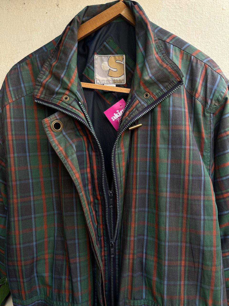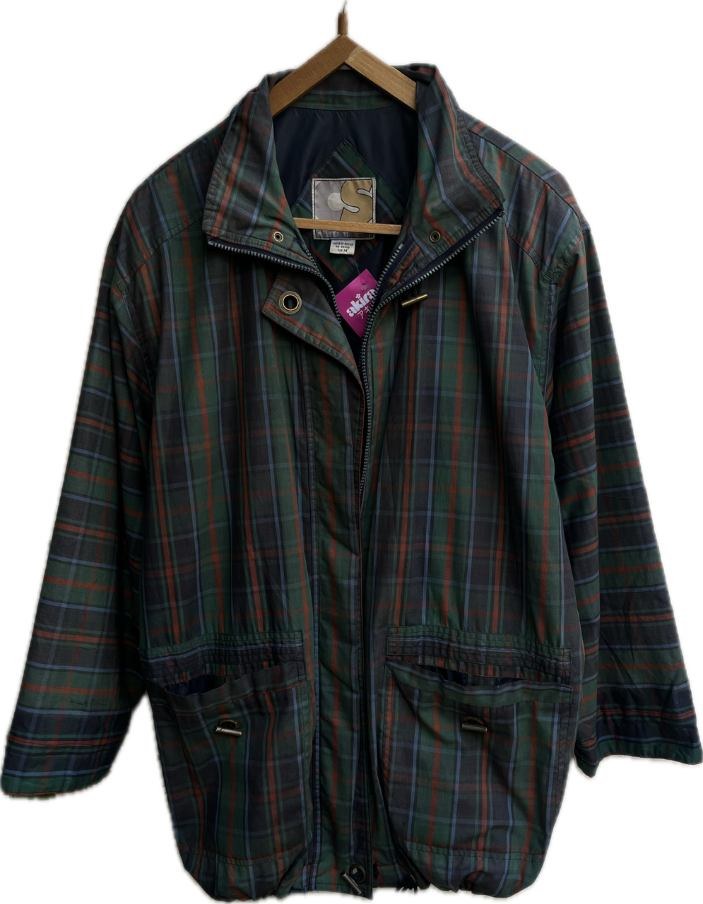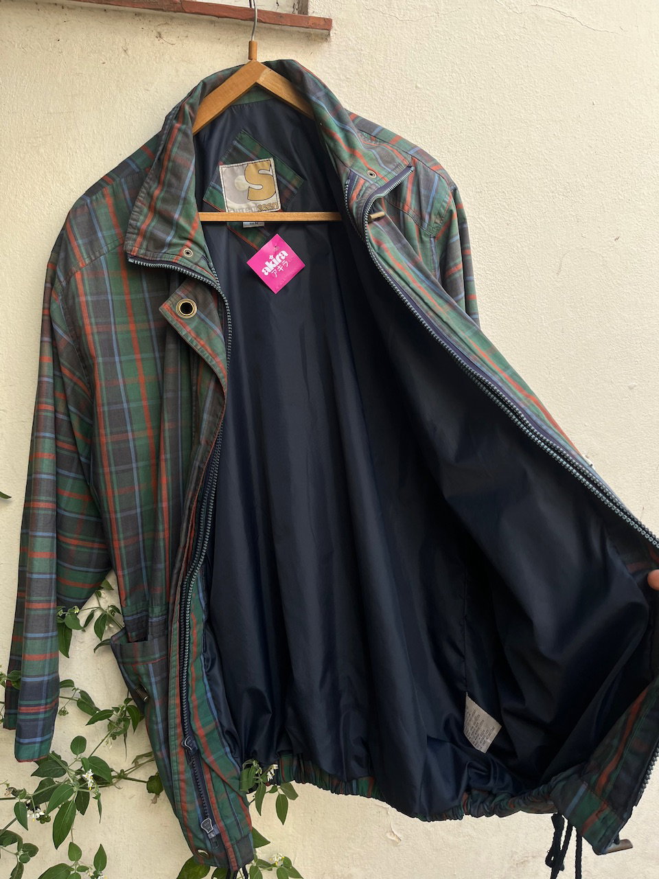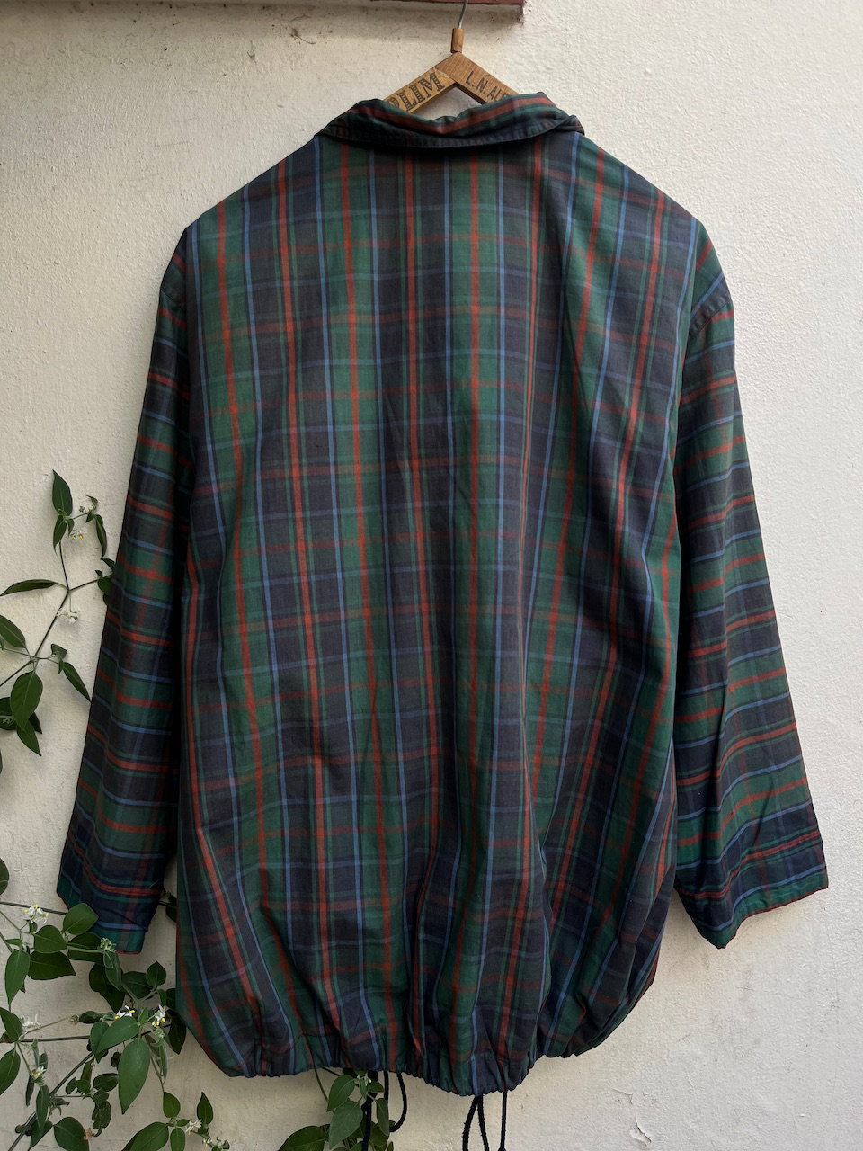 rompevientos original de los 90s en estampado tartán con doble cierre y varios bolsillos. hecho en rusia, todo un hallazgo. talle L aprox
