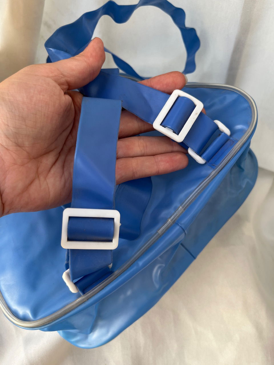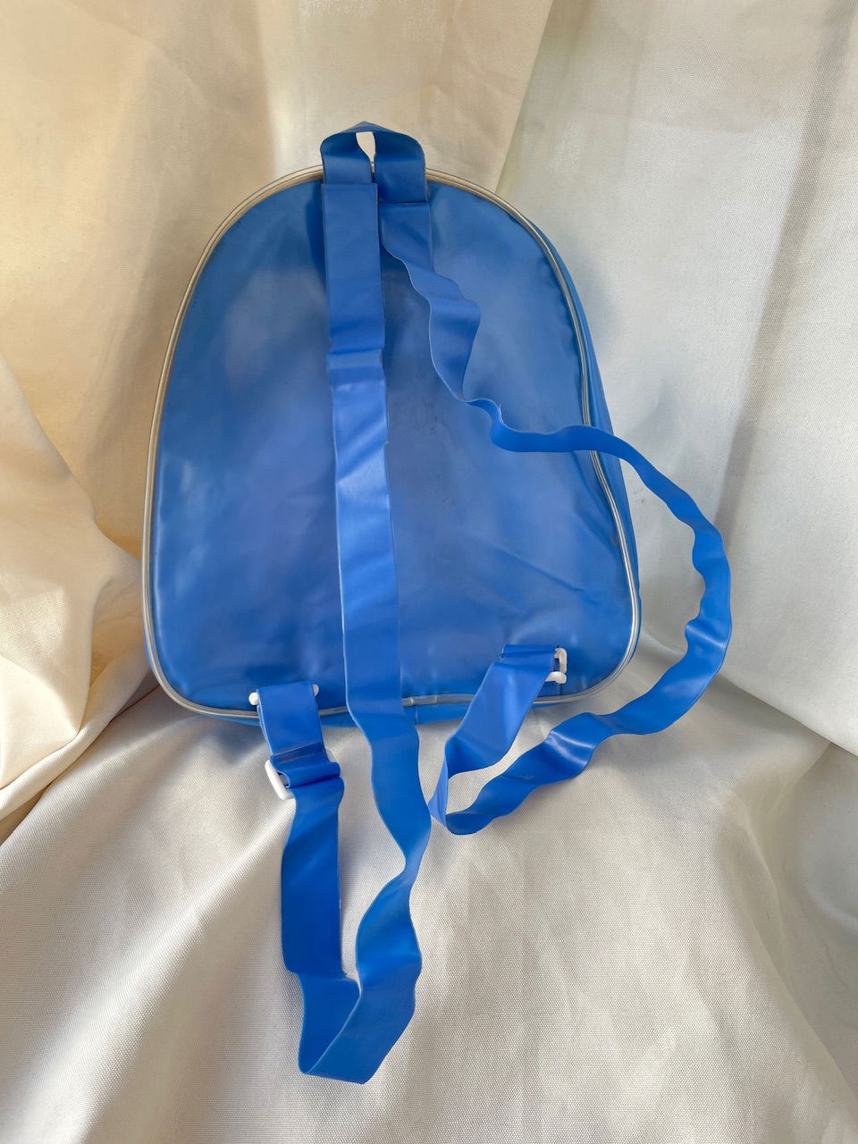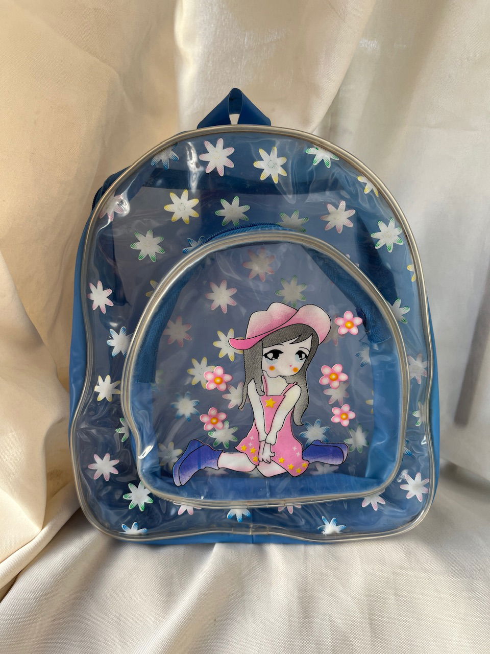 mini back pack traslúcida por delante, con dos bolsillos funcionales, es de plástico, correas regulables, como nueva