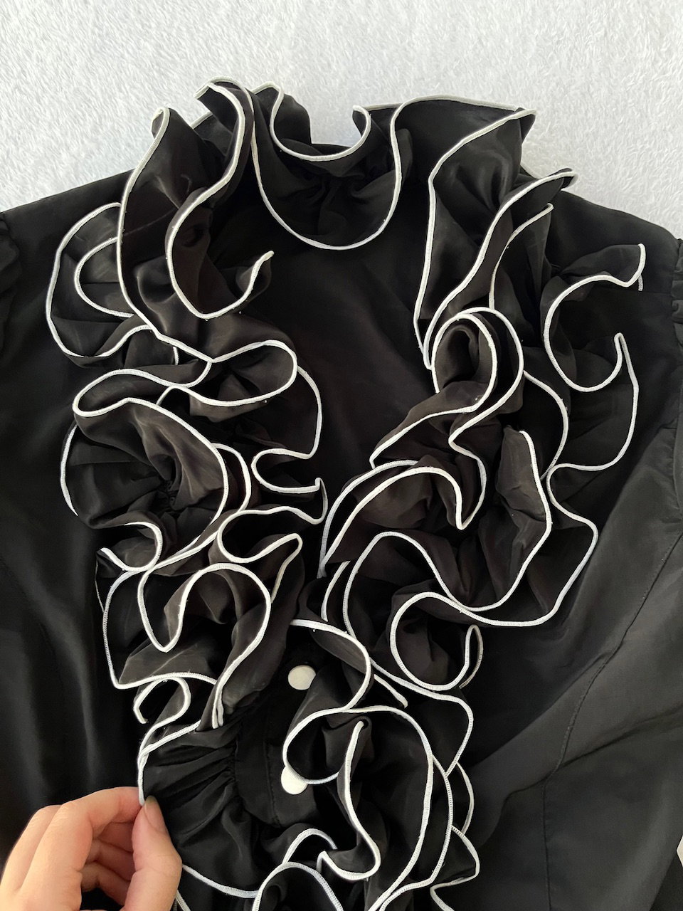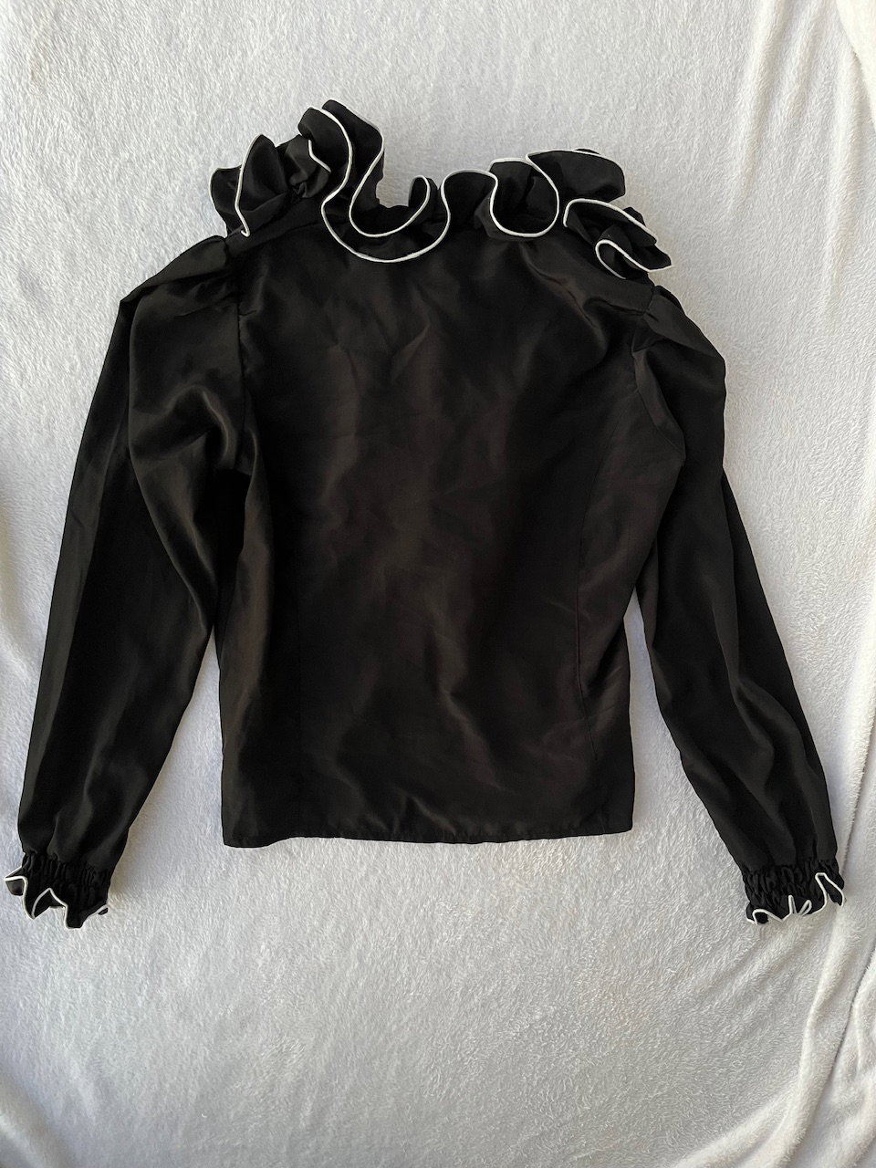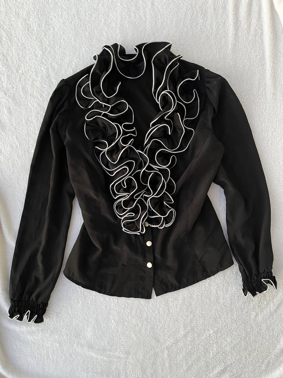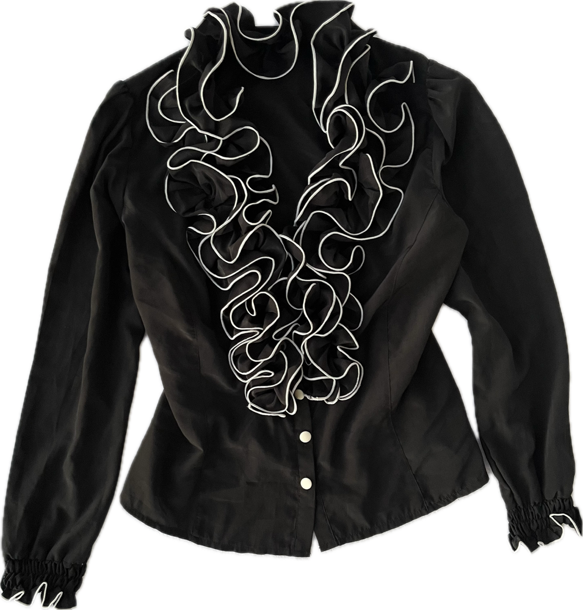 camisa con volados y ribetes en blanco, es entallada. talle m